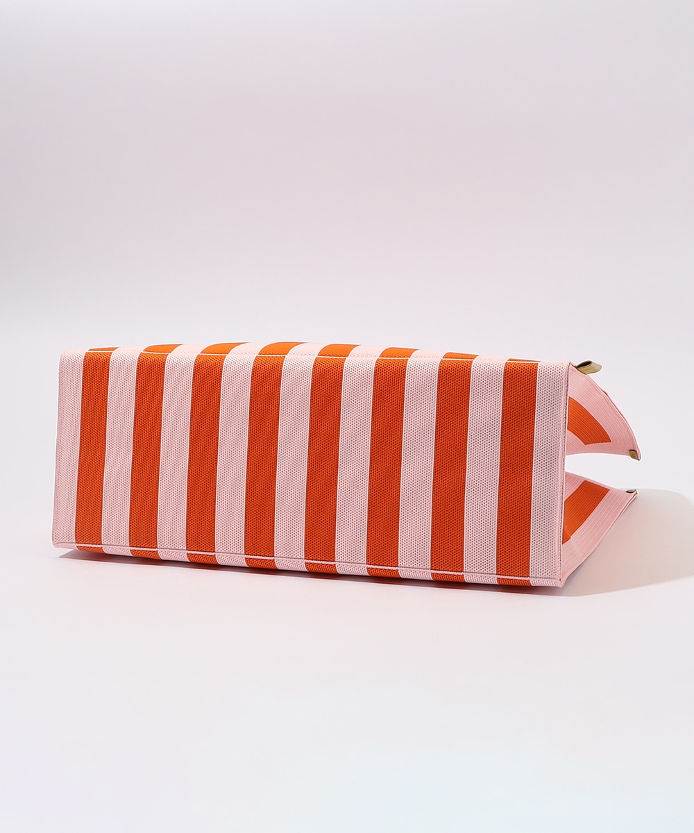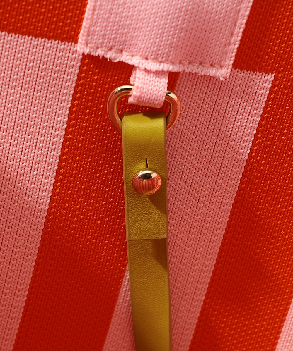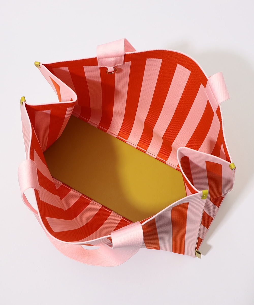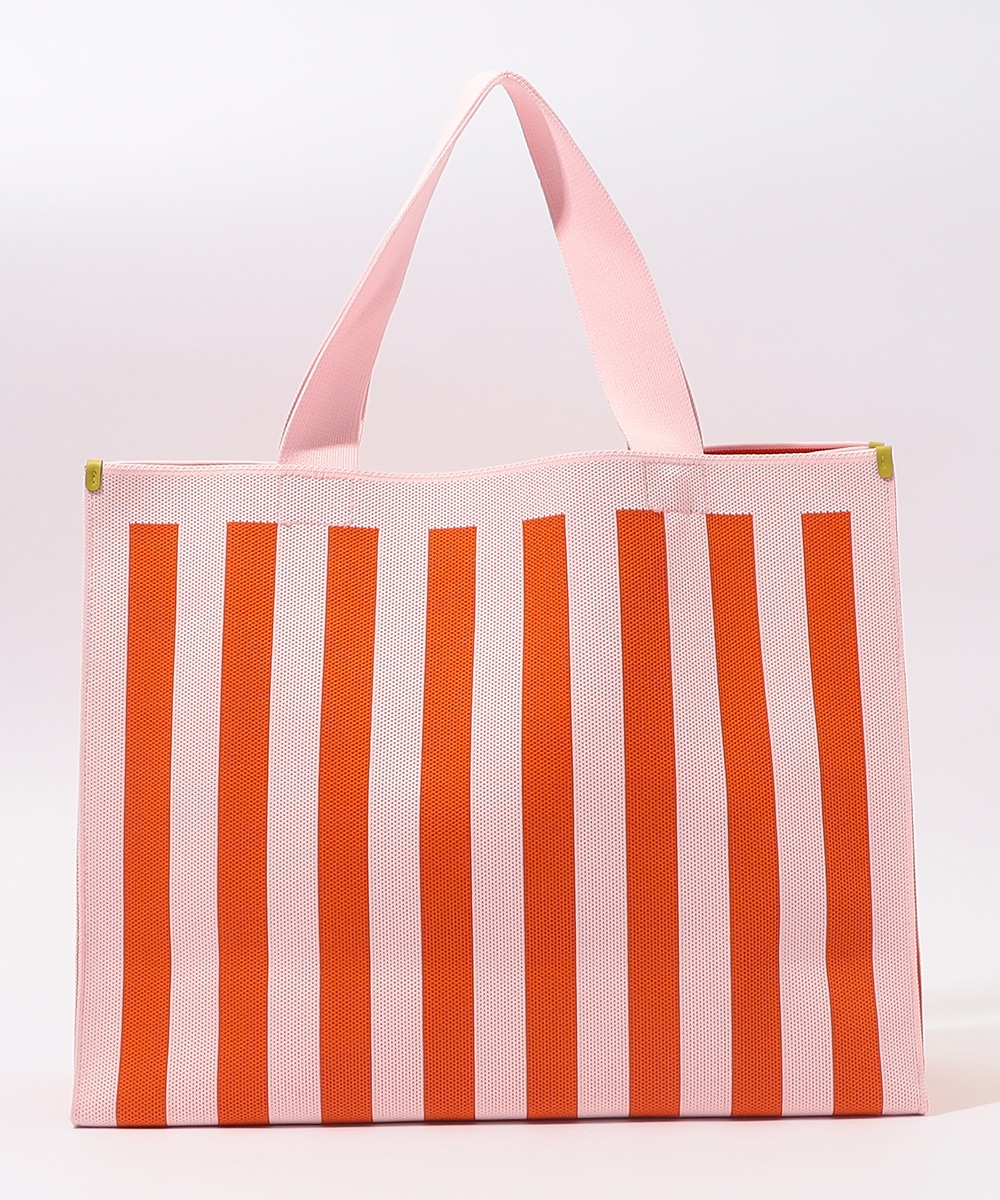 マチ幅をしっかり設けたスクエア型で、収納力抜群のトートバッグです。本体はタフで柔らかなニット生地を使用。ブランドタグには異素材を用い、高級感を高めています。着脱式のチャームポーチは、鍵や小物の収納に便利。オープンタイプの間口で荷物の出し入れがしやすく、ほどよい長さのハンドルで肩がけも手持ちも可能です。