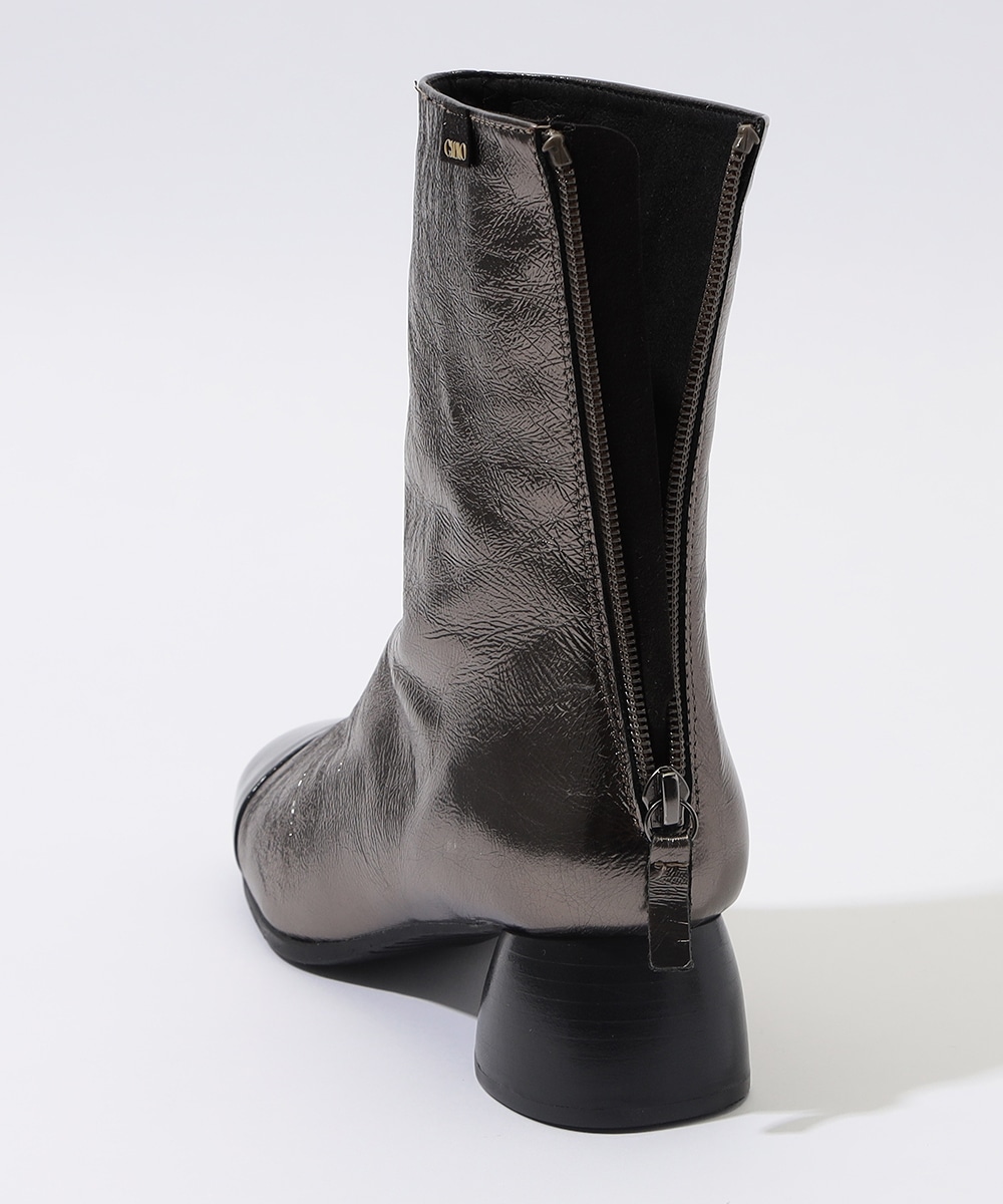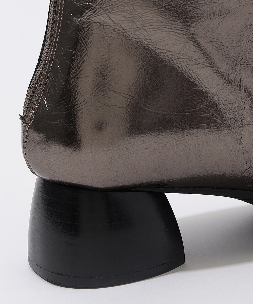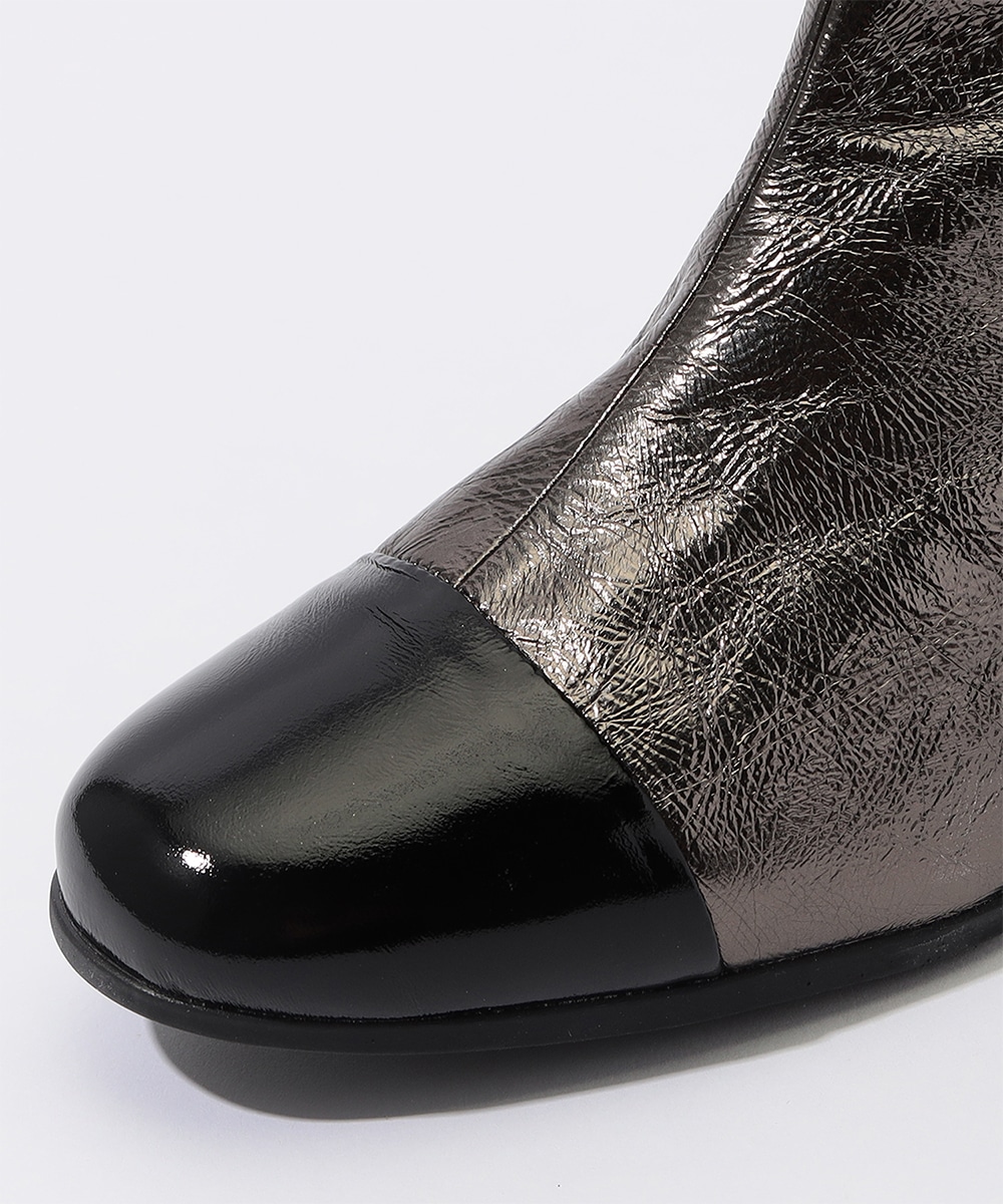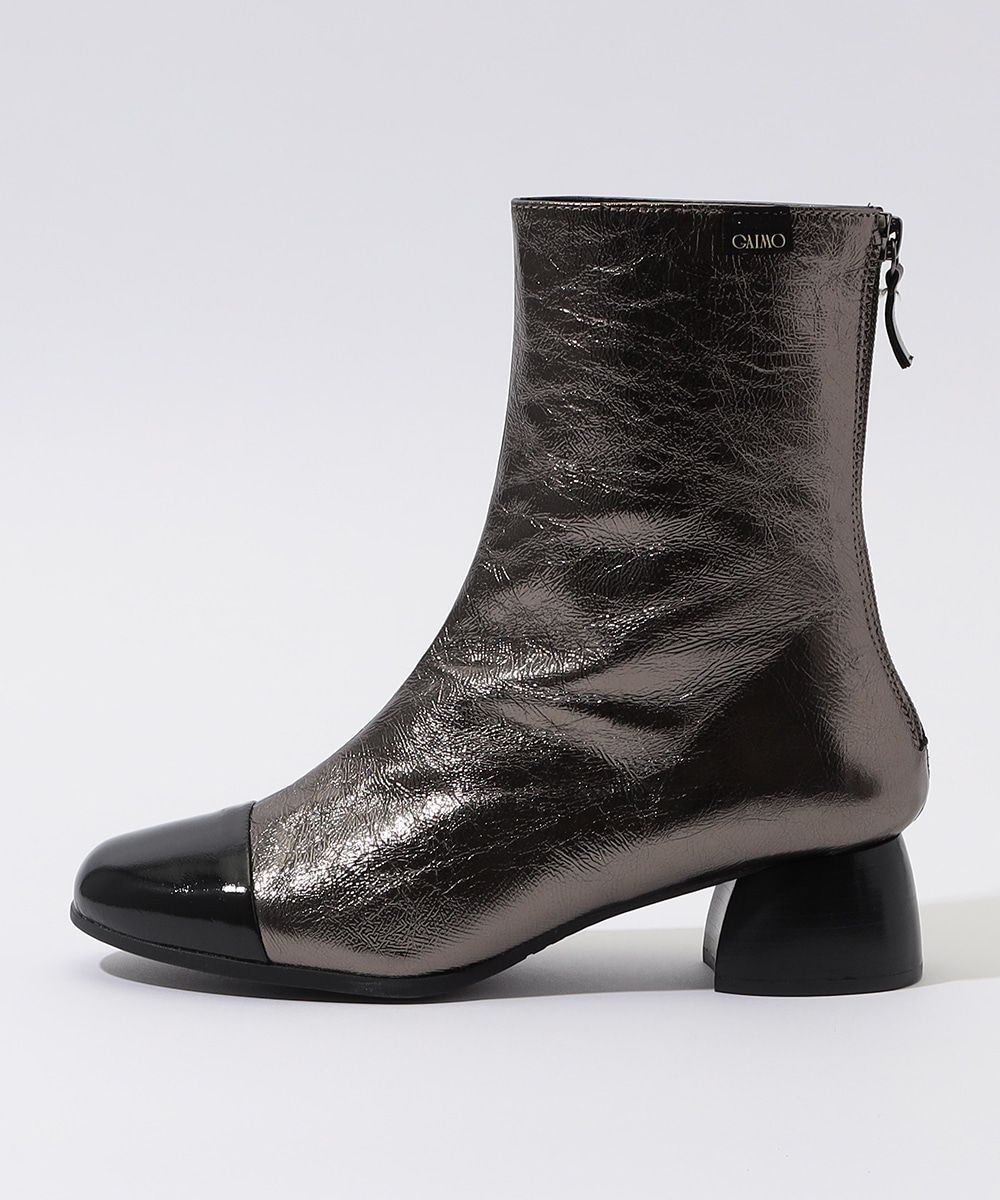 ベースはメタル素材で、ラウンドトゥのつま先はエナメル素材です。落ち着いた配色やヴィンテージ風のシワ加工でシックな印象にまとめているため、華やかながらも様々な装いに馴染んでくれます。履き口のブランドロゴ、品の良いシルエット、安定感のある太ヒール、着脱しやすいバックファスナー仕様もポイントです。
