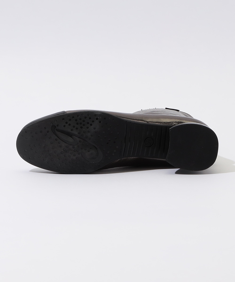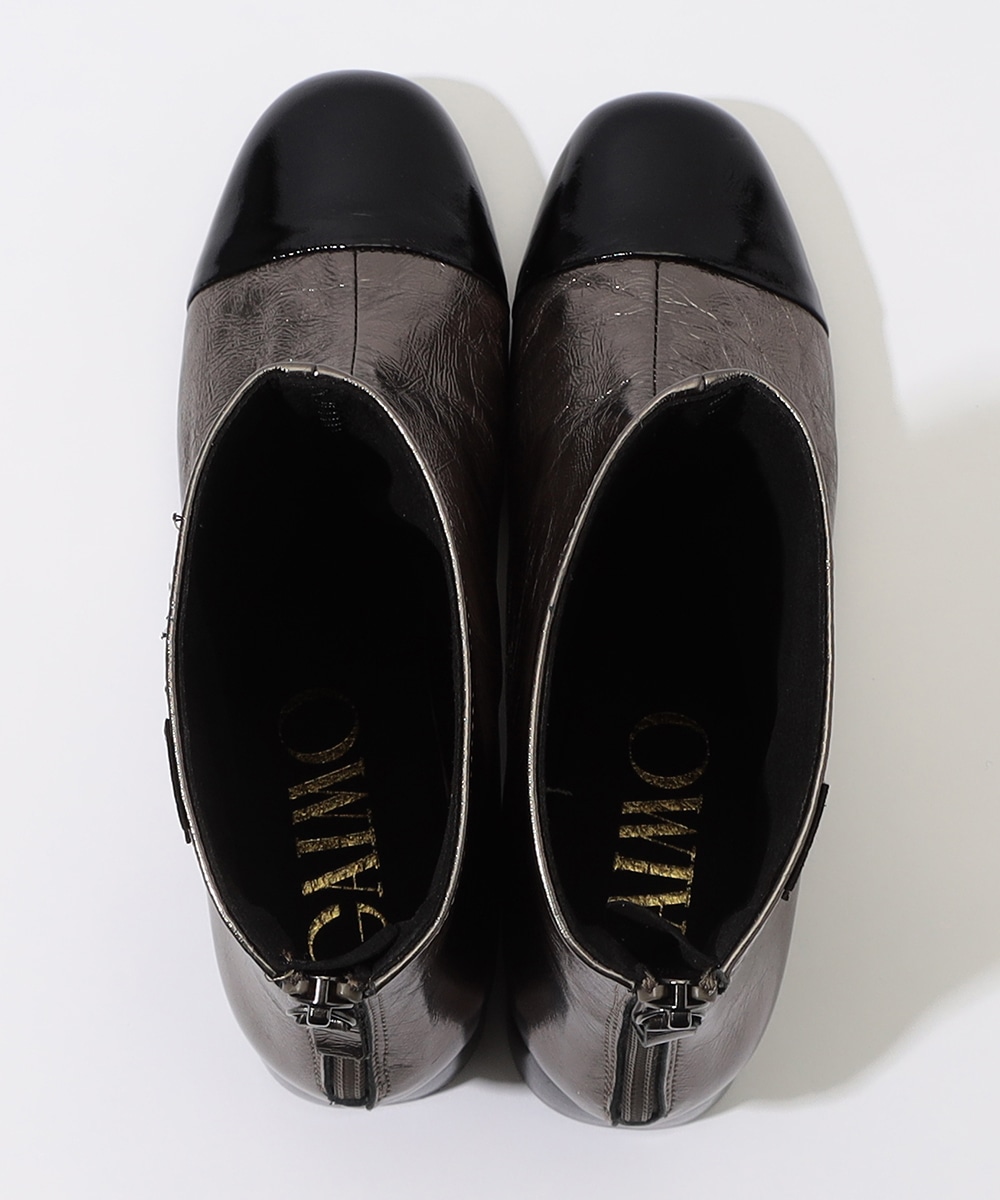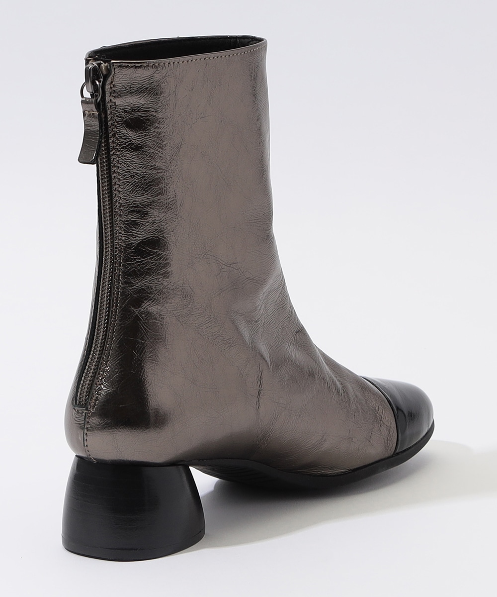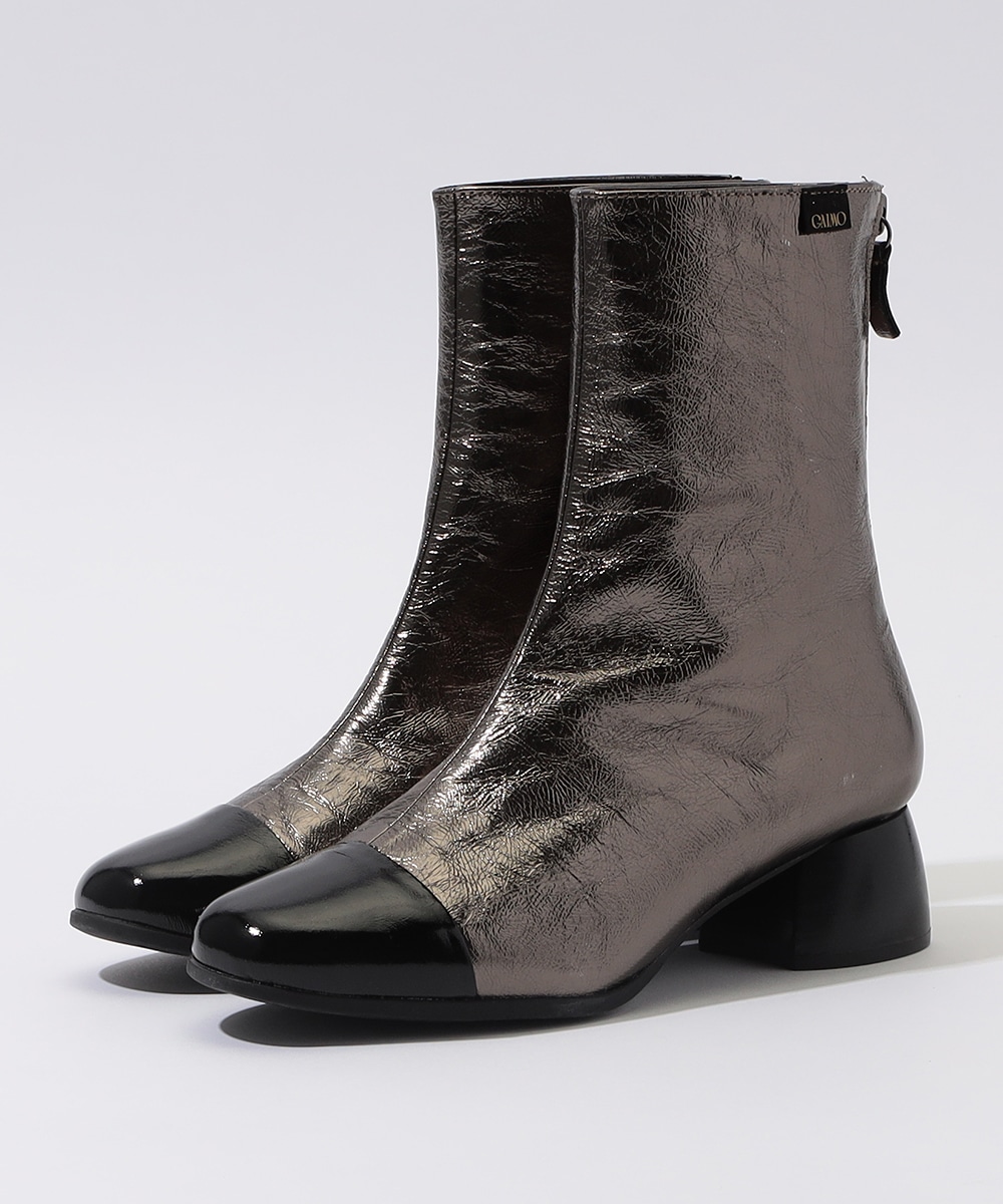 ベースはメタル素材で、ラウンドトゥのつま先はエナメル素材です。落ち着いた配色やヴィンテージ風のシワ加工でシックな印象にまとめているため、華やかながらも様々な装いに馴染んでくれます。履き口のブランドロゴ、品の良いシルエット、安定感のある太ヒール、着脱しやすいバックファスナー仕様もポイントです。