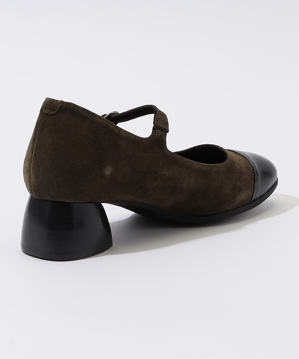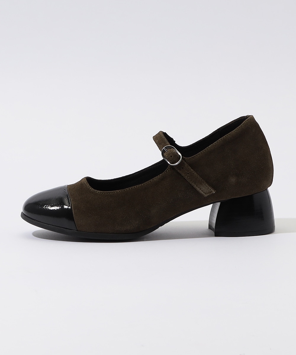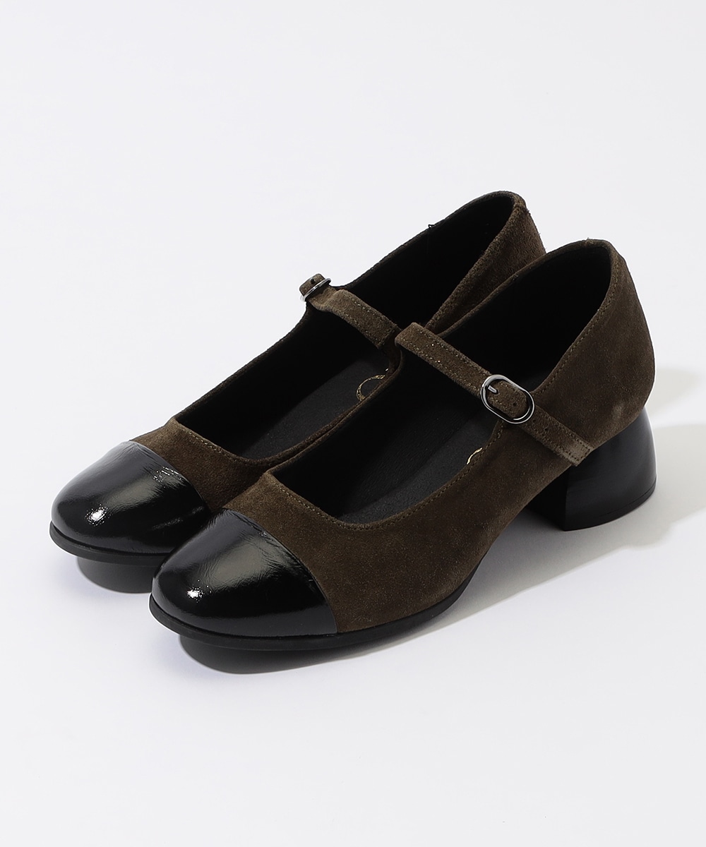 異素材をミックスした2トーンカラーのメリージェーンパンプスです。ベースにはシックなスウェード調、つま先にはエレガントなエナメルを用いています。シルエットはシンプルなラウンドトゥ仕様で、ころんとした太ヒールが可愛らしい雰囲気。甲ベルトが足元をしっかりホールドし、フィット感と安定感も抜群です。