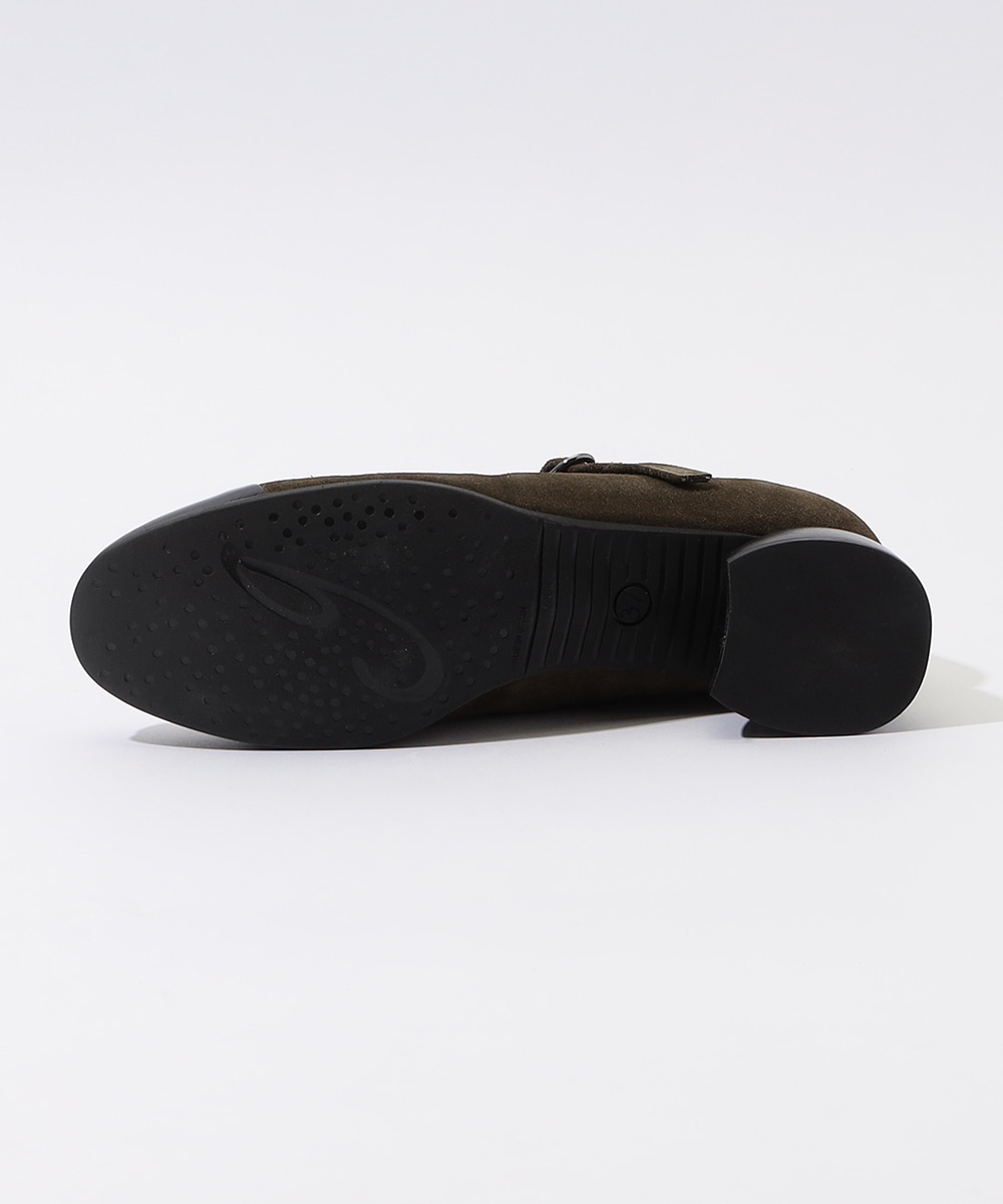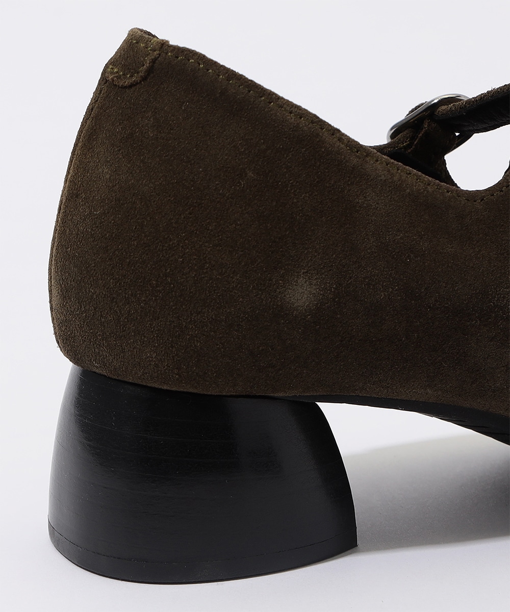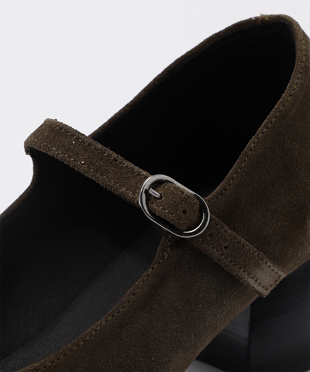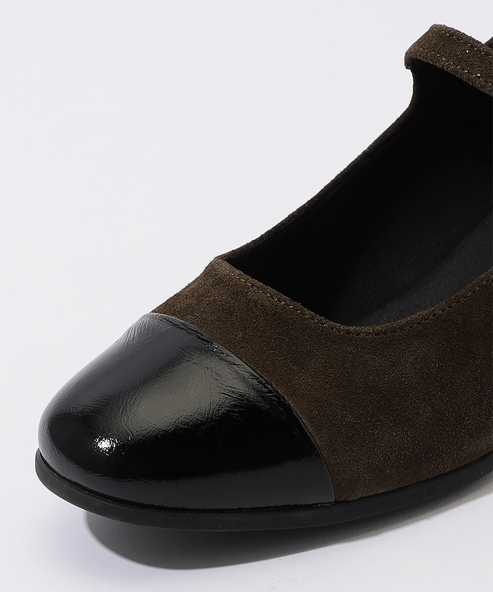 異素材をミックスした2トーンカラーのメリージェーンパンプスです。ベースにはシックなスウェード調、つま先にはエレガントなエナメルを用いています。シルエットはシンプルなラウンドトゥ仕様で、ころんとした太ヒールが可愛らしい雰囲気。甲ベルトが足元をしっかりホールドし、フィット感と安定感も抜群です。
