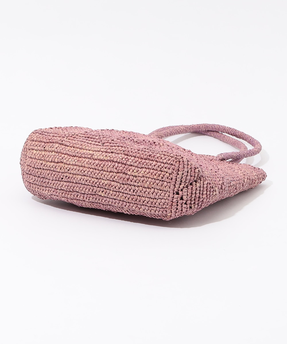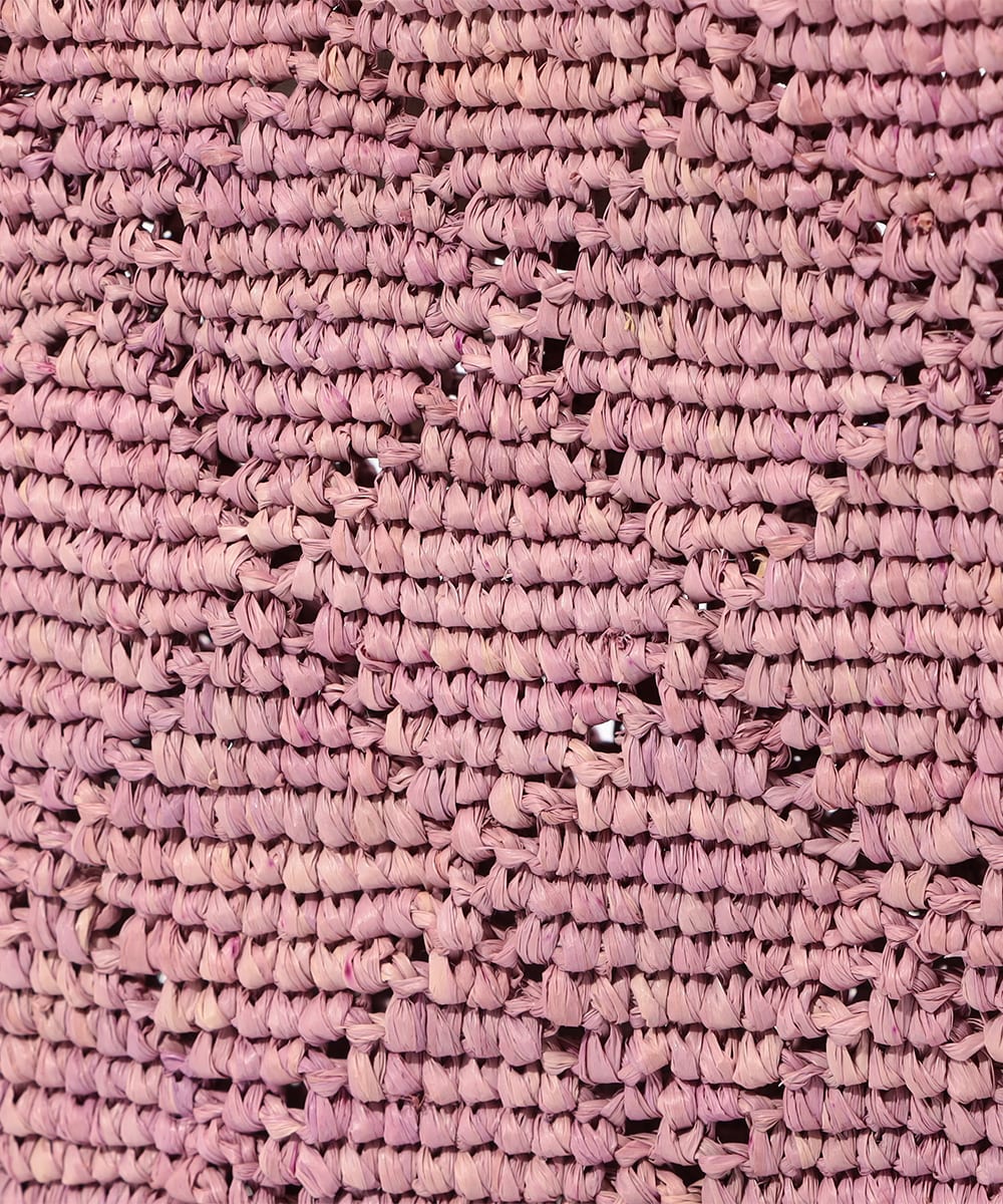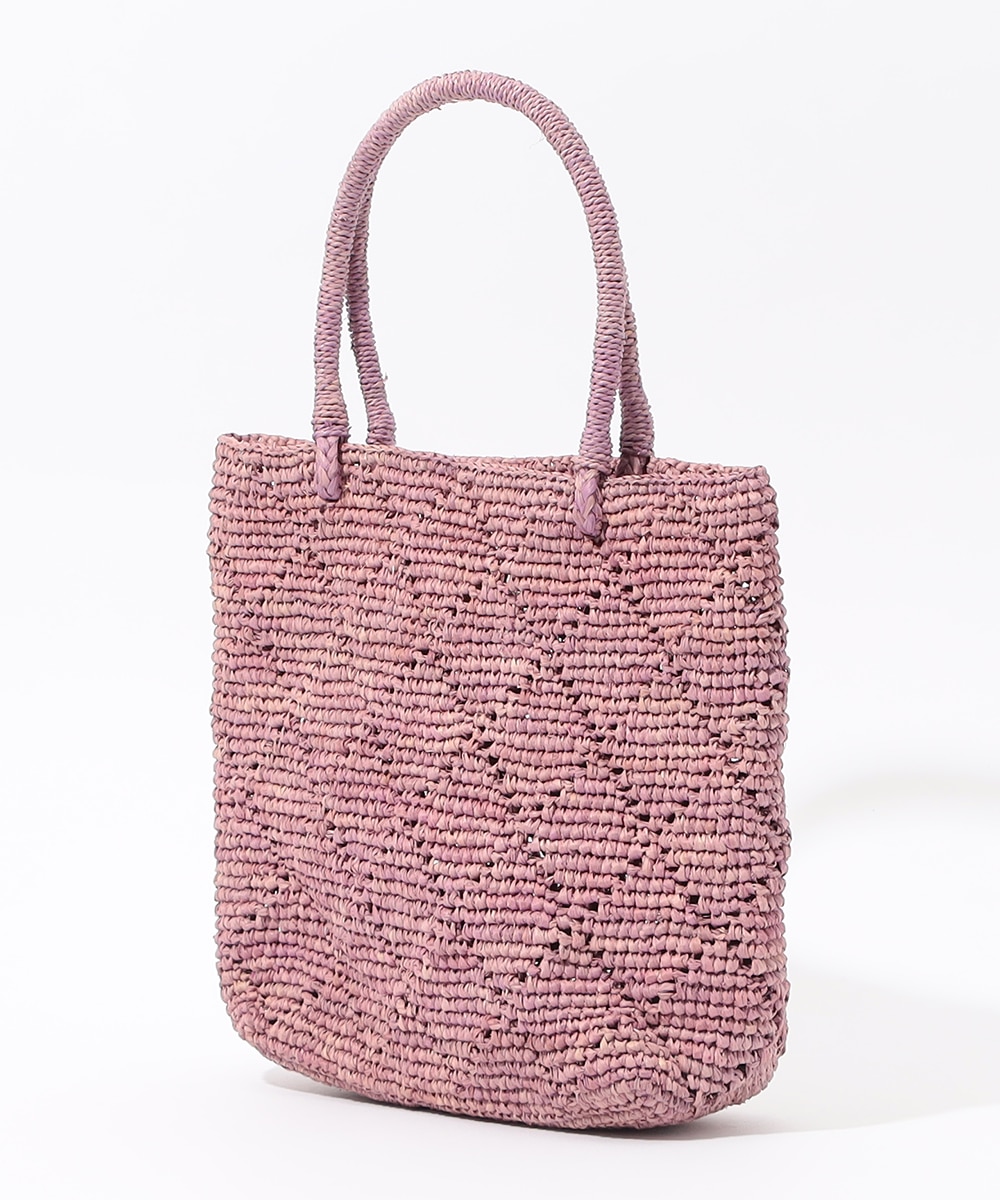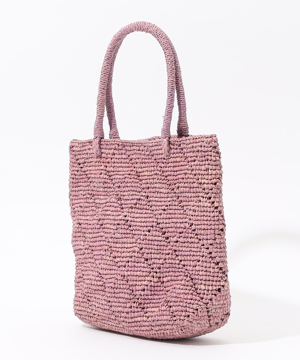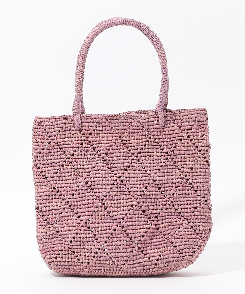 透かし編みを取り入れて、クラシカルなダイヤチェック柄をデザインしました。中身は見えすぎず、安心してお使いいただけます。コーディネートのワンポイントにも適した明るいカラーです。少し小ぶりのかわいいサイズ感。マチ幅はほどよく、ポーチやペットボトルなど立体的なアイテムもすっきりと収まります。