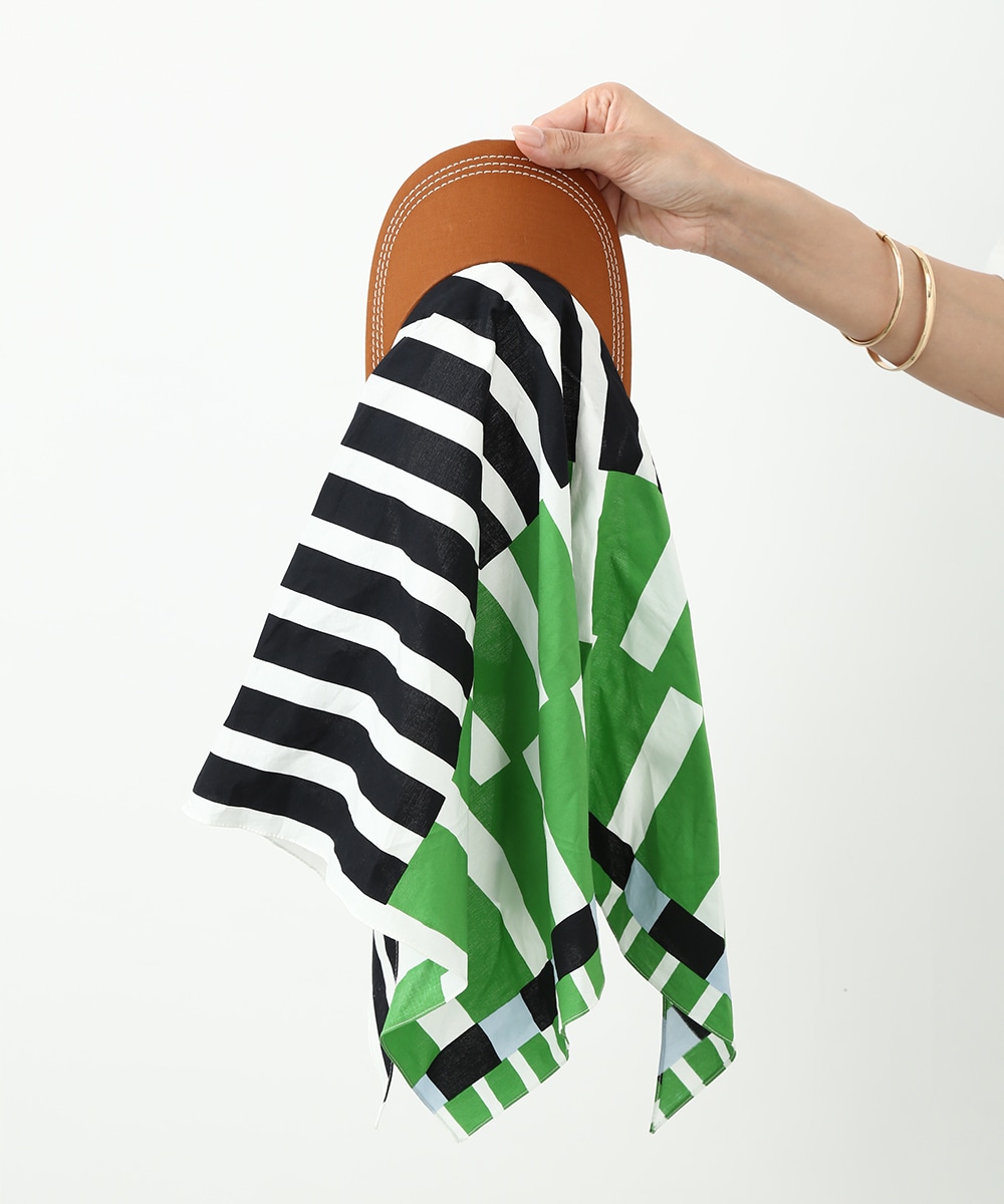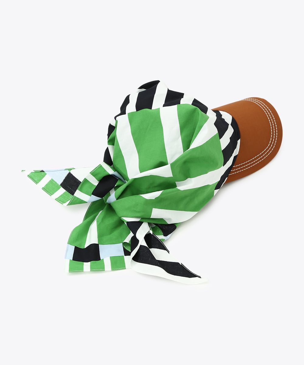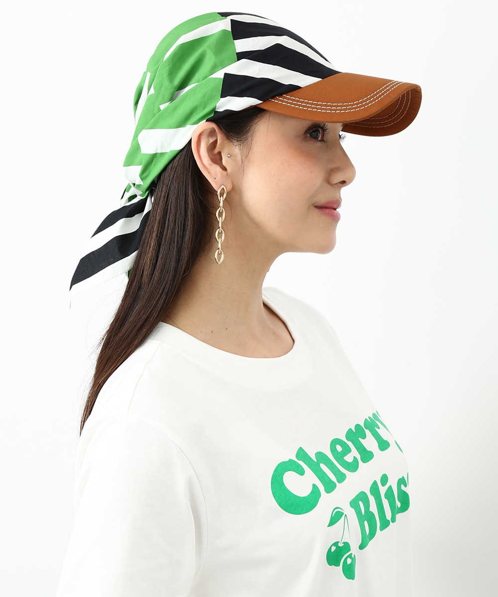 被る部分をスカーフで仕上げたデザインキャップ。サイズ感の調整がしやすく、頭に沿ってきれいにフィットさせられるのが特徴です。鮮やかな幾何学プリントがスタイリングのアクセントに。ロゴTとデニムを合わせたシンプルな着こなしにプラスして、ポイントとして取り入れるのもおすすめです。