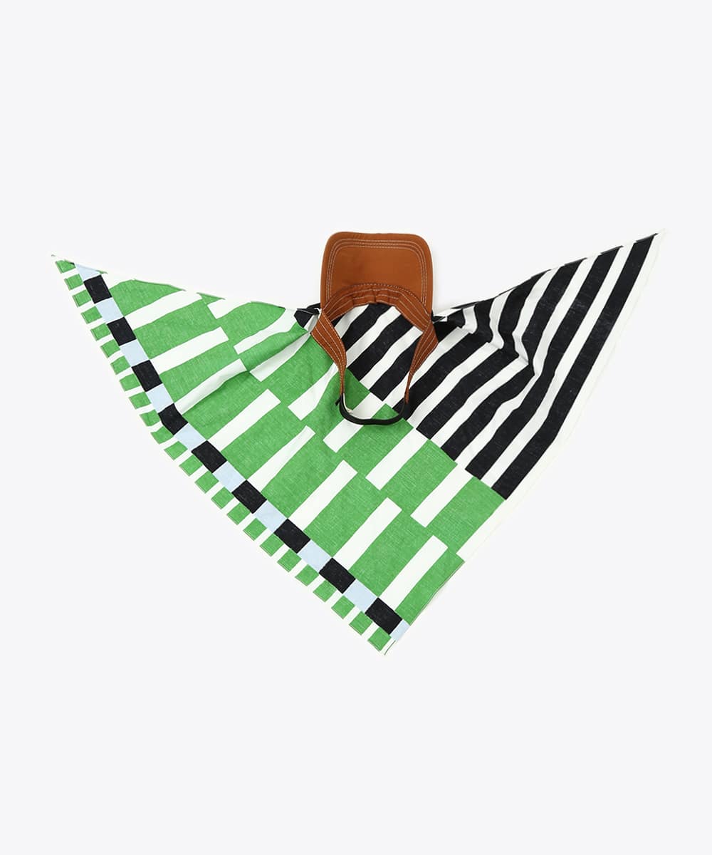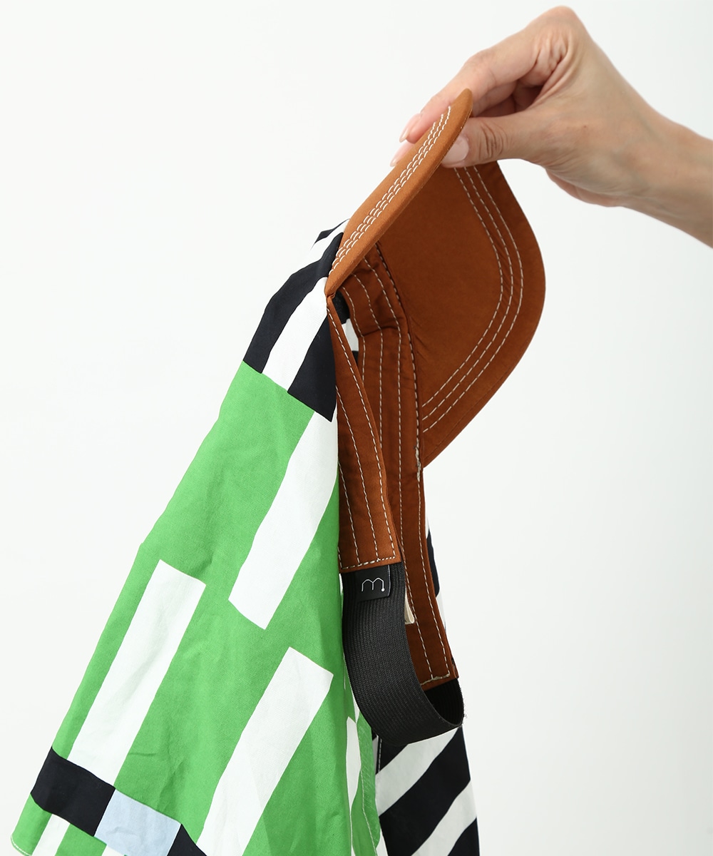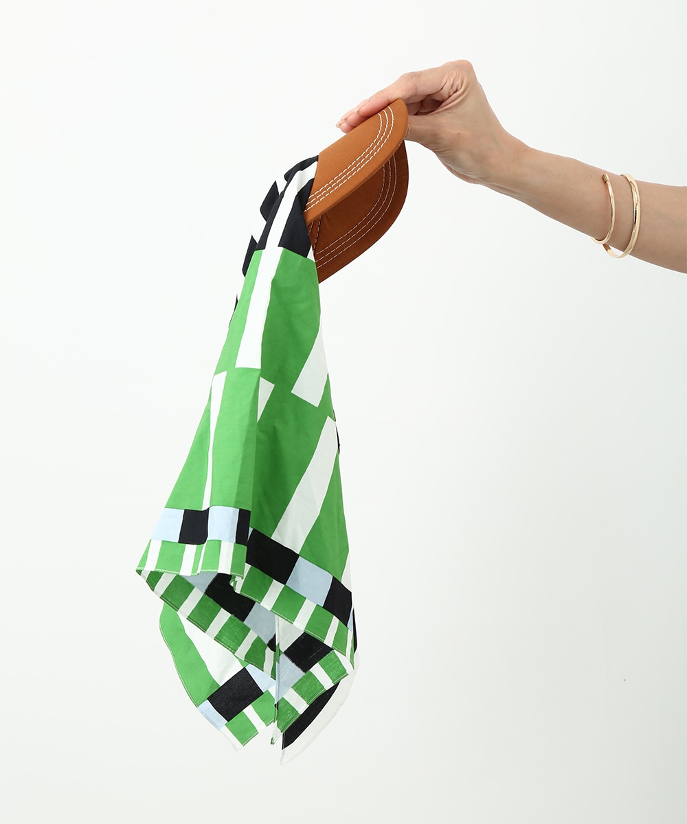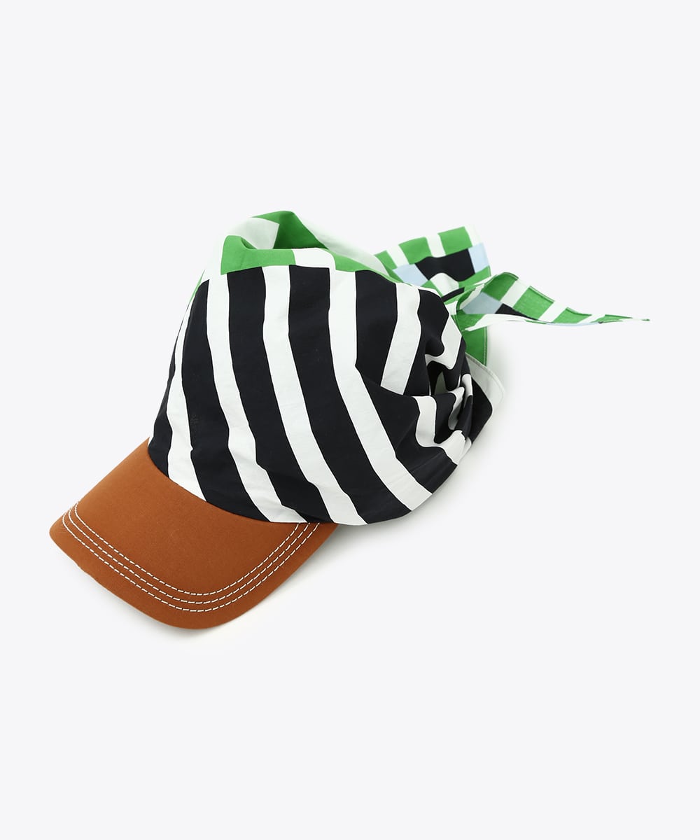被る部分をスカーフで仕上げたデザインキャップ。サイズ感の調整がしやすく、頭に沿ってきれいにフィットさせられるのが特徴です。鮮やかな幾何学プリントがスタイリングのアクセントに。ロゴTとデニムを合わせたシンプルな着こなしにプラスして、ポイントとして取り入れるのもおすすめです。