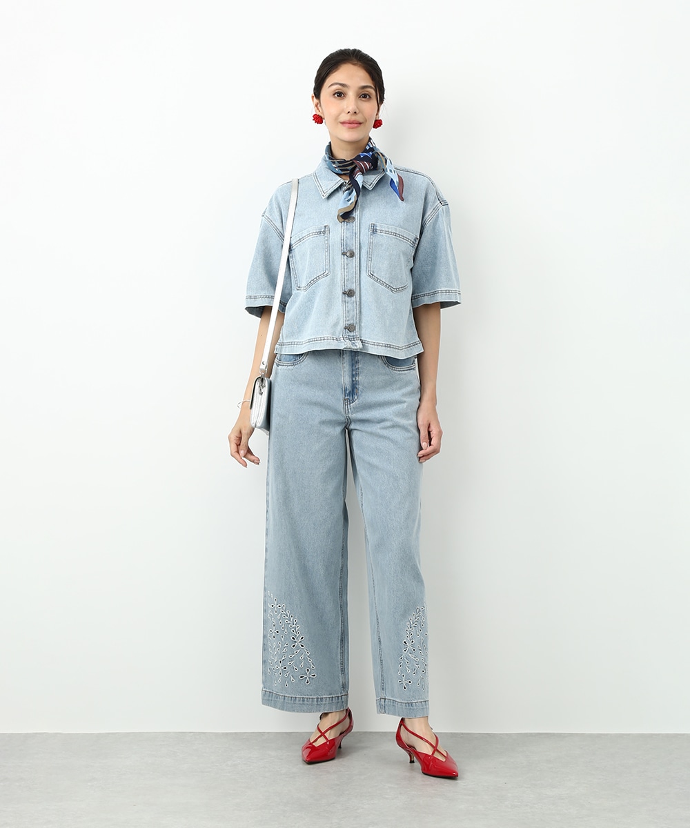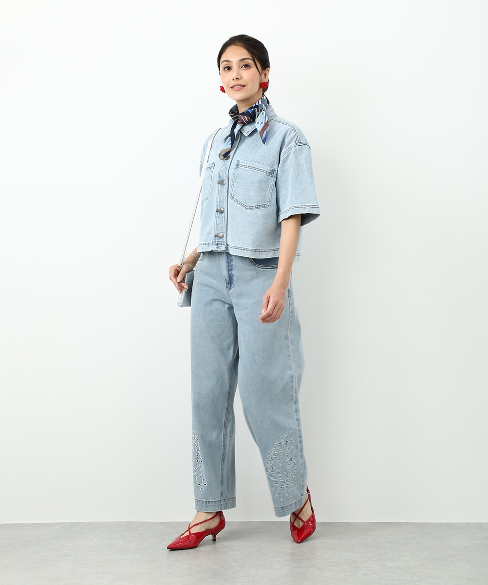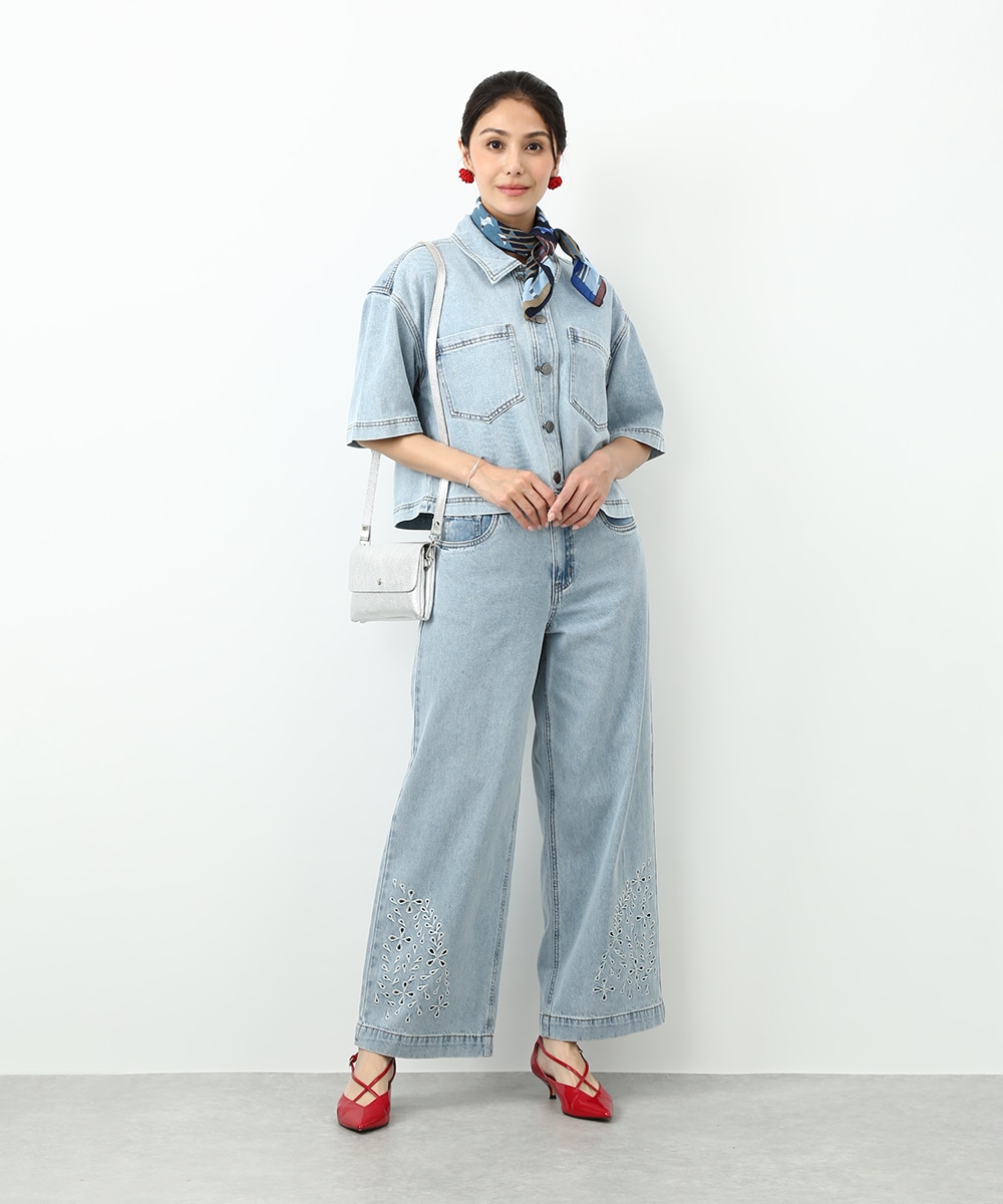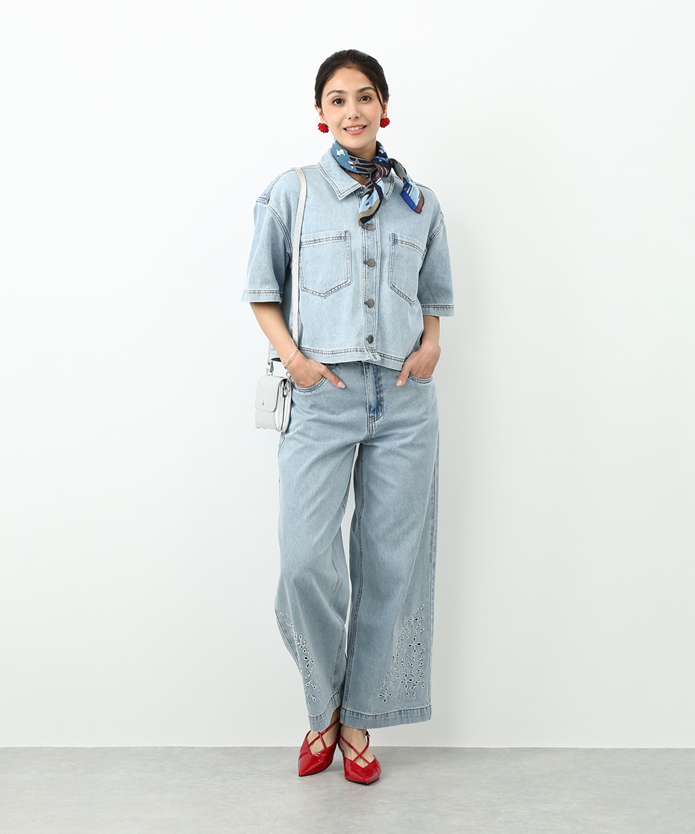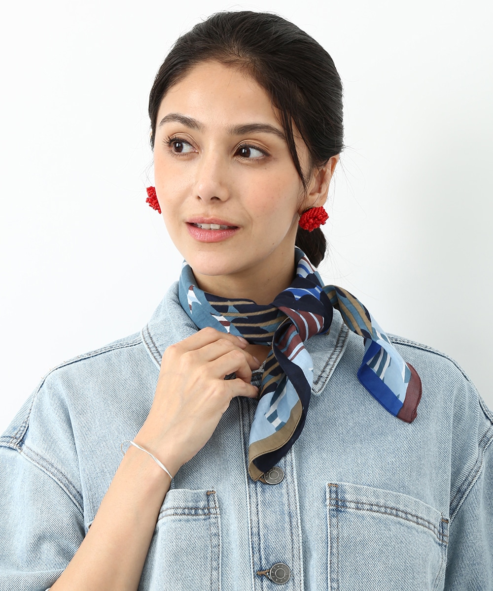 モダンで洗練された雰囲気を楽しめるスカーフ。首元やヘアアレンジに取り入れやすく、柔らかな素材で結びやすいのもポイントです。デニムスタイルにプラスして、ヘッドアクセサリーとして巻けばコーデのアクセントに。シンプルな着こなしにさりげない華やかさを加えてくれます。