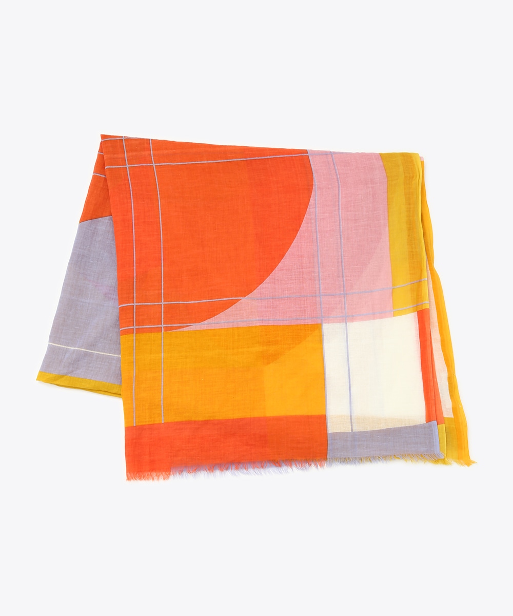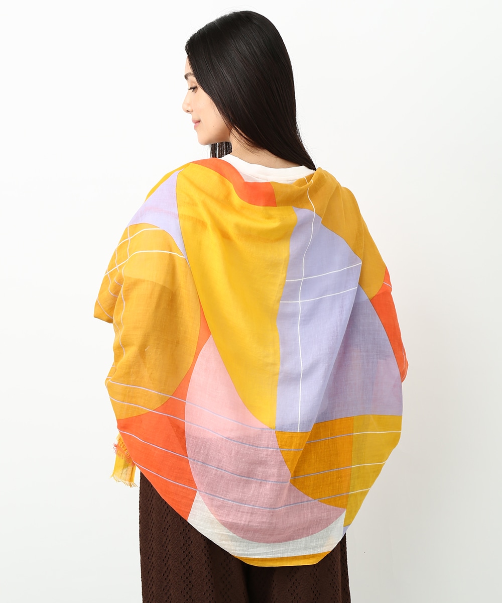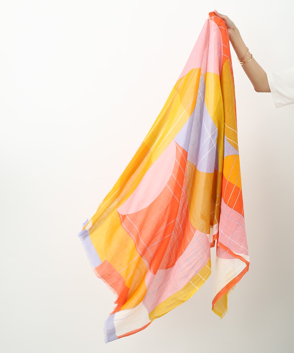 存在感のある幾何学プリントがモダンな印象を与える大判スカーフ。明るい色使いがコーデに彩りを加え、シンプルな装いを引き立ててくれます。ロゴTにさらっと肩掛けしたり、バッグのハンドルに巻き付けたスタイリングもおすすめです。取り入れるだけで印象にメリハリをつけてくれます。