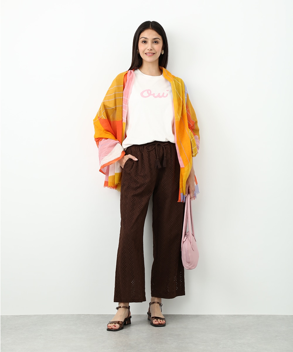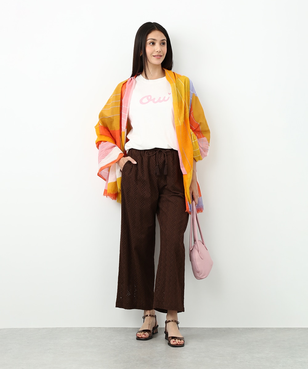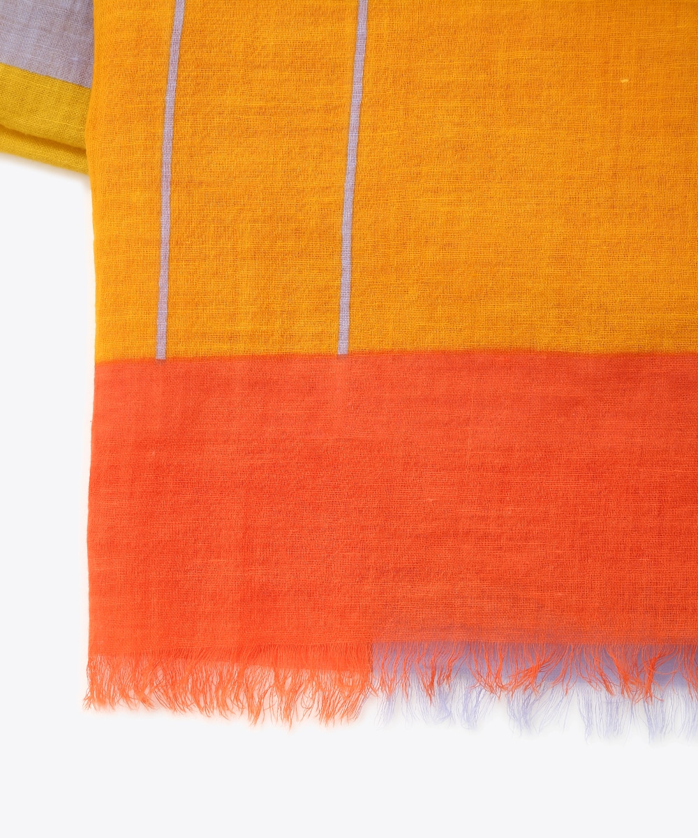 存在感のある幾何学プリントがモダンな印象を与える大判スカーフ。明るい色使いがコーデに彩りを加え、シンプルな装いを引き立ててくれます。ロゴTにさらっと肩掛けしたり、バッグのハンドルに巻き付けたスタイリングもおすすめです。取り入れるだけで印象にメリハリをつけてくれます。