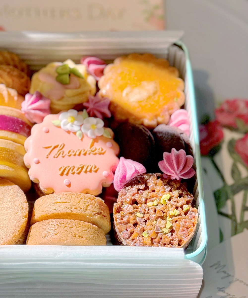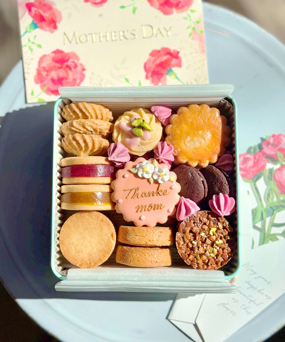 蓋を開けた瞬間に、お母さんへの感謝の気持ちが伝わるような、彩り豊かな詰め合わせ。「Thanks Mom」と描かれたアイシングクッキーを主役に、フルーツの酸味、チョコのコク、素材の香ばしさなど、多彩な味と食感をぎゅっと凝縮しました。ラズベリーやマンゴーパッションの爽やかなフルーツキャラメル、サクサクのチョコラング、そして香ばしいフロランタンやブルトンヌなど、11種類のクッキーにメレンゲを添えた、こだわりのラインナップ。手作りの温もりと、素材それぞれの豊かな風味を大切に仕上げた、目でも舌でも楽しめるバラエティ豊かな味わいをお楽しみください。