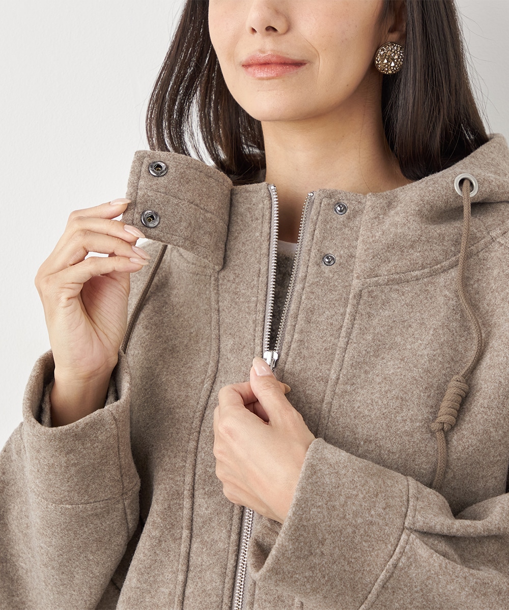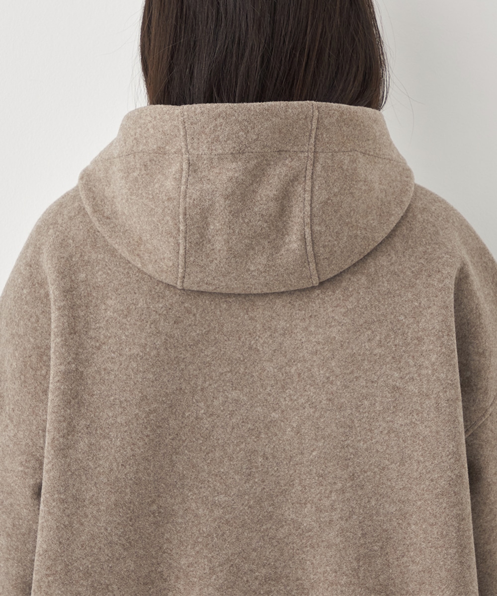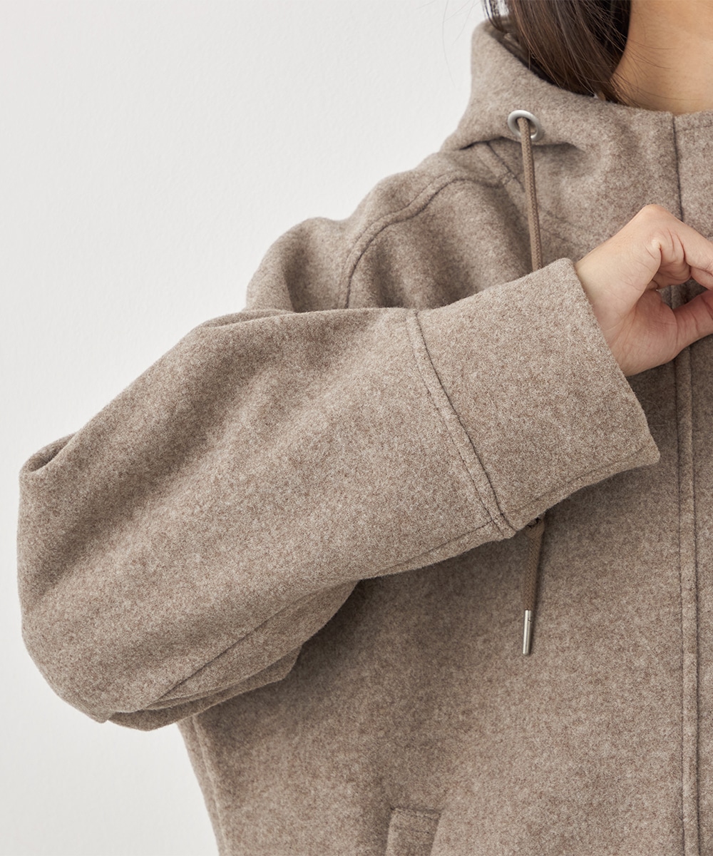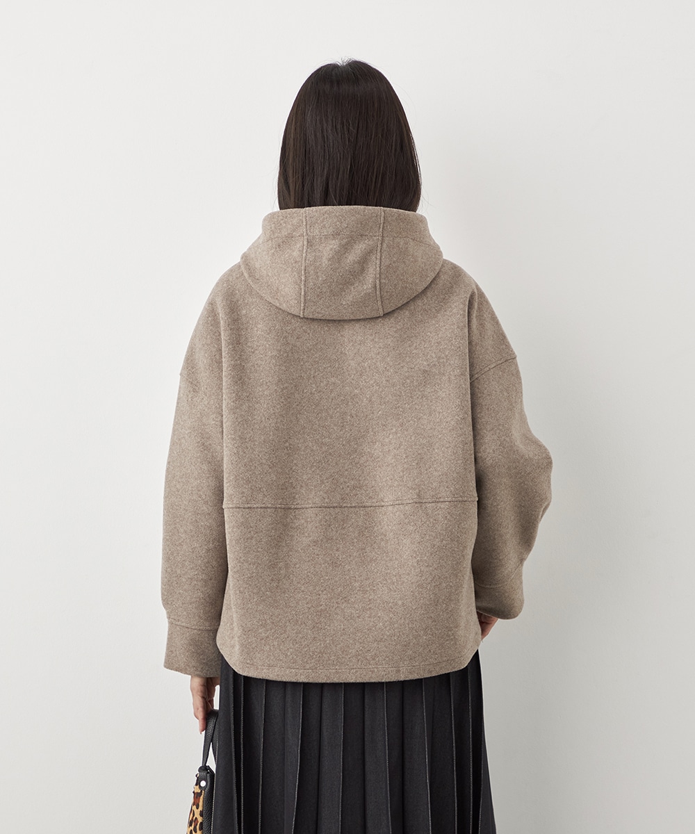 コンパクトな印象ながらもヒップが隠れる着丈に仕上がっています。ジップ仕様のフロントにフード付きのスポーティなデザインです。トレンドライクなドロップショルダーを採用しています。裏側の縫い代の始末にはカラフルな別地を取り入れて、見えない部分にまでこだわりが十分です。