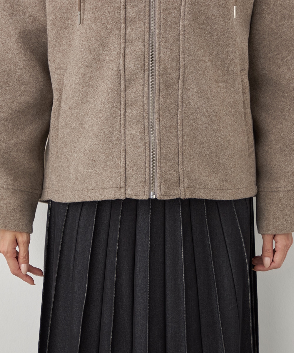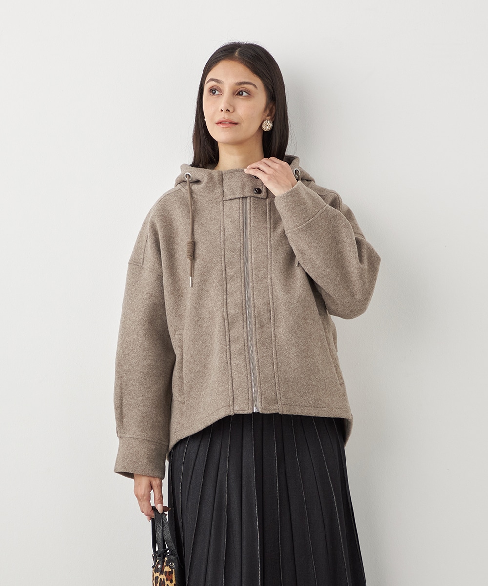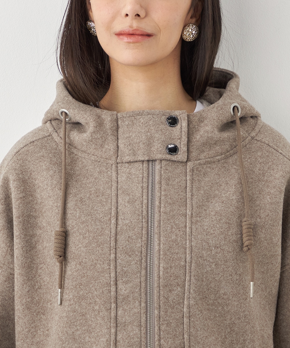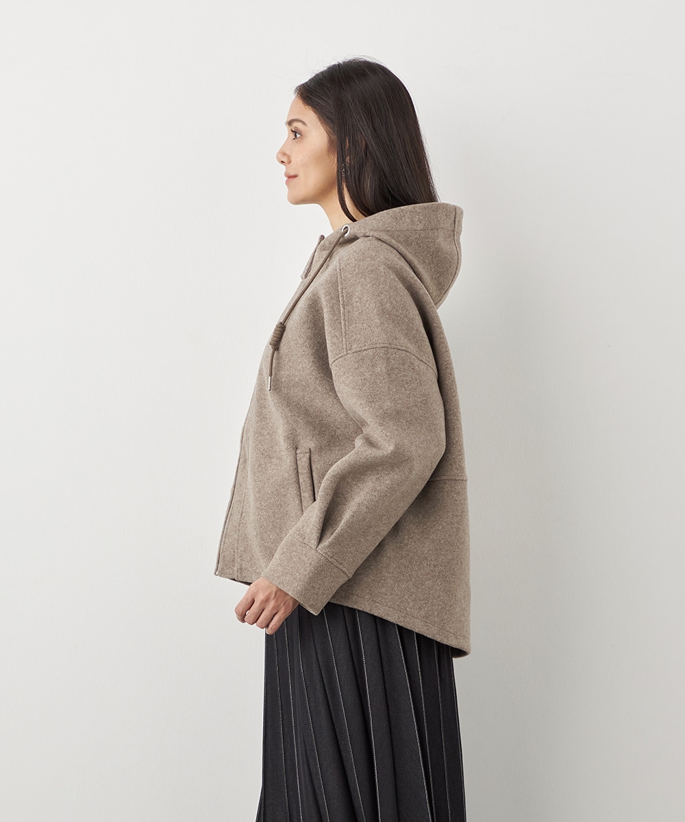 コンパクトな印象ながらもヒップが隠れる着丈に仕上がっています。ジップ仕様のフロントにフード付きのスポーティなデザインです。トレンドライクなドロップショルダーを採用しています。裏側の縫い代の始末にはカラフルな別地を取り入れて、見えない部分にまでこだわりが十分です。