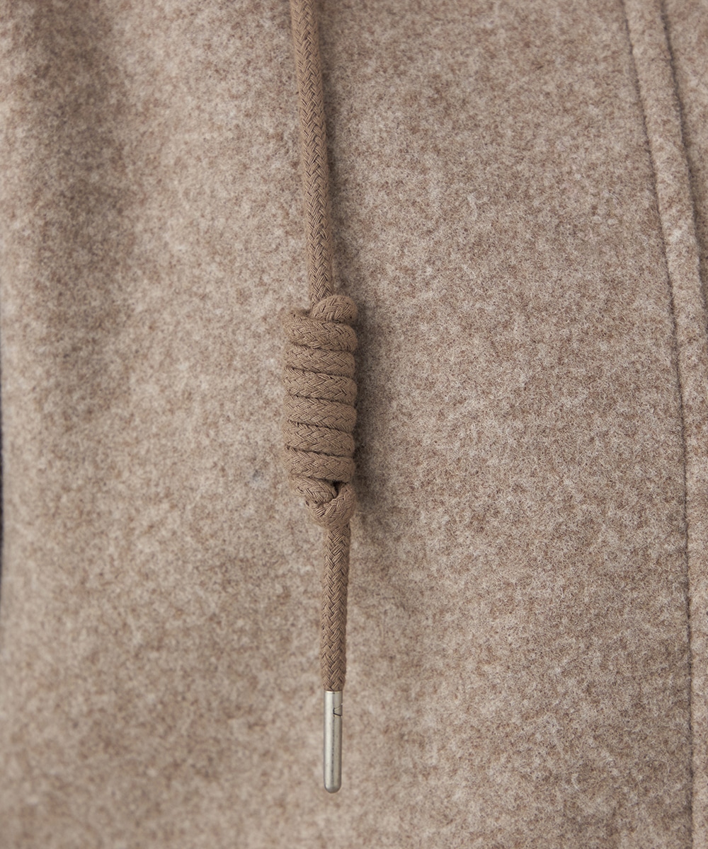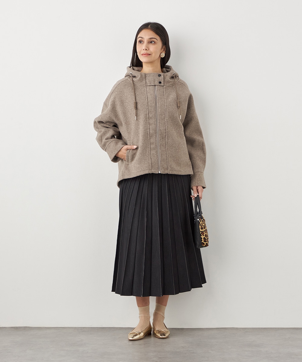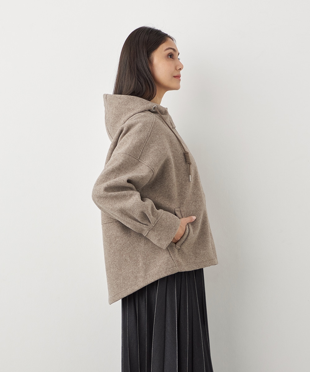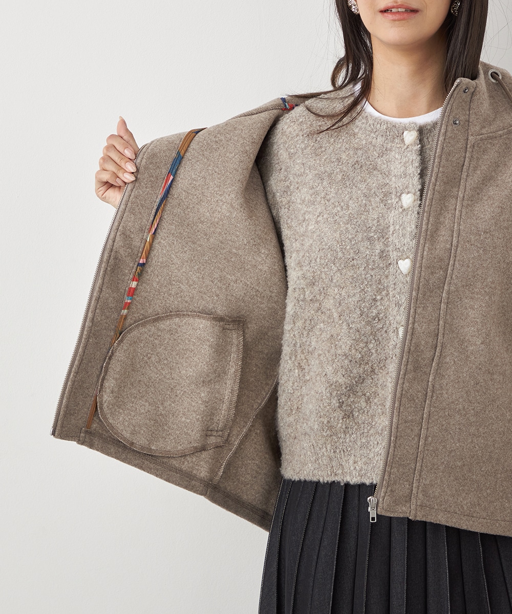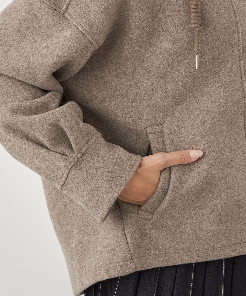 コンパクトな印象ながらもヒップが隠れる着丈に仕上がっています。ジップ仕様のフロントにフード付きのスポーティなデザインです。トレンドライクなドロップショルダーを採用しています。裏側の縫い代の始末にはカラフルな別地を取り入れて、見えない部分にまでこだわりが十分です。