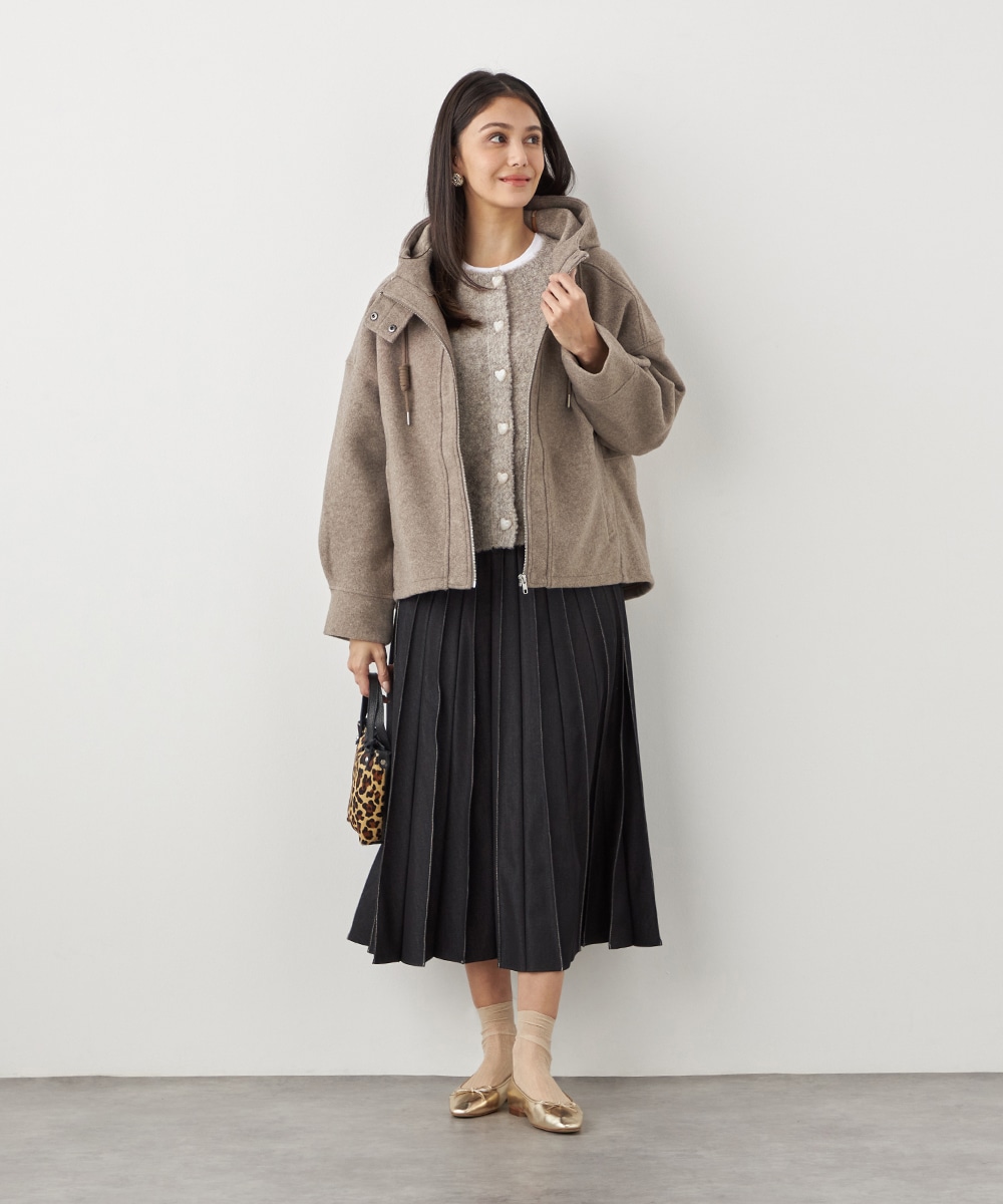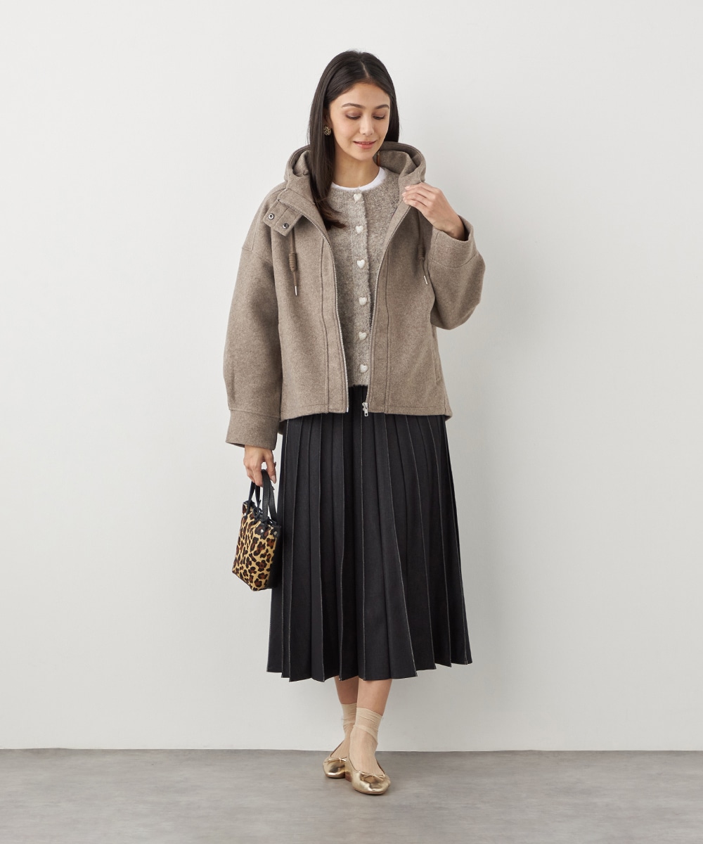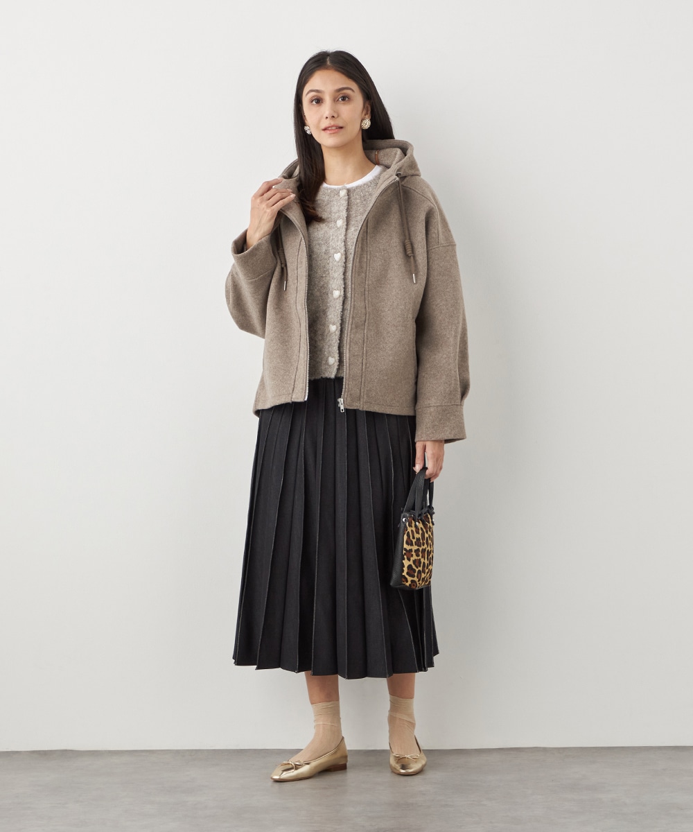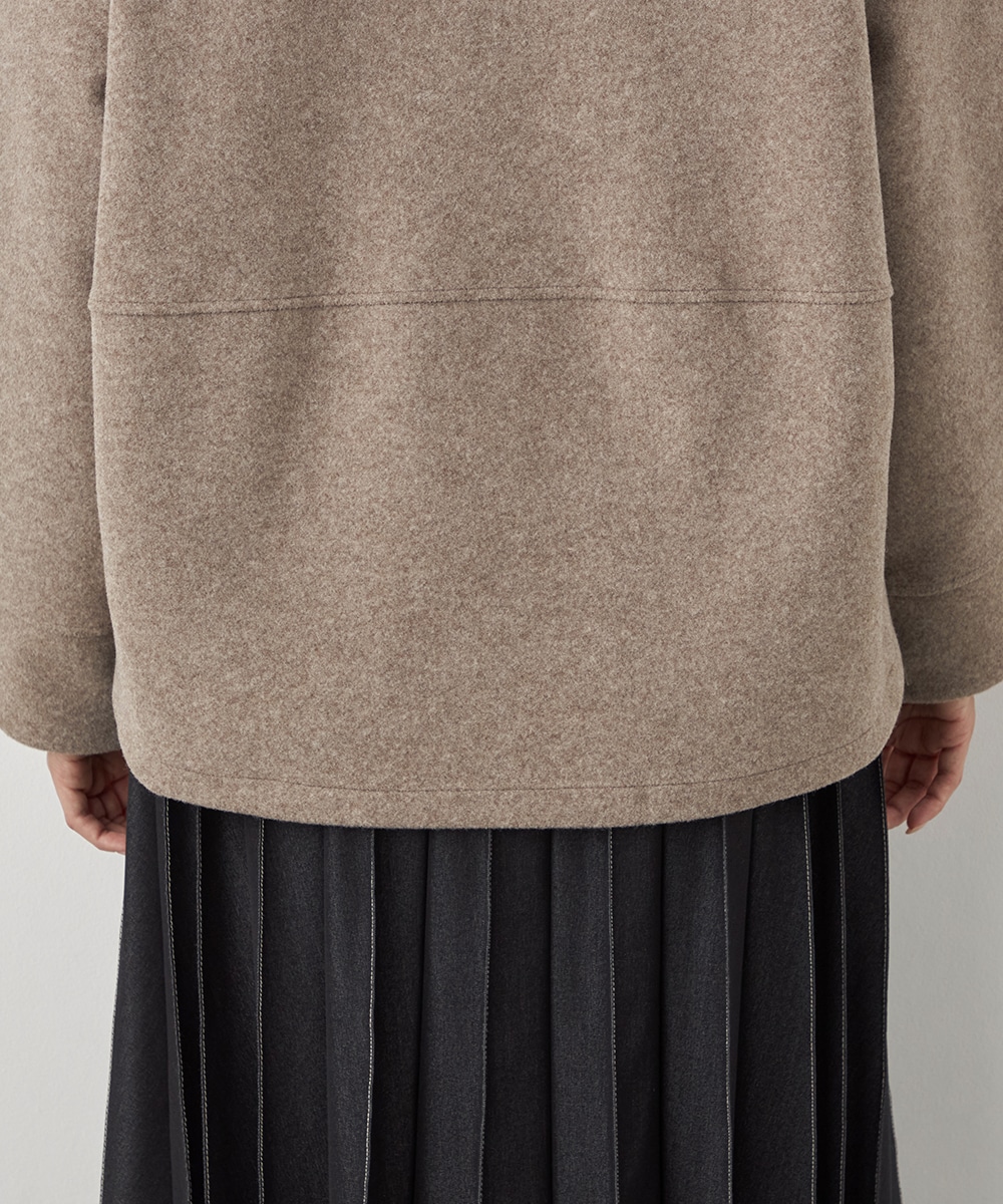コンパクトな印象ながらもヒップが隠れる着丈に仕上がっています。ジップ仕様のフロントにフード付きのスポーティなデザインです。トレンドライクなドロップショルダーを採用しています。裏側の縫い代の始末にはカラフルな別地を取り入れて、見えない部分にまでこだわりが十分です。