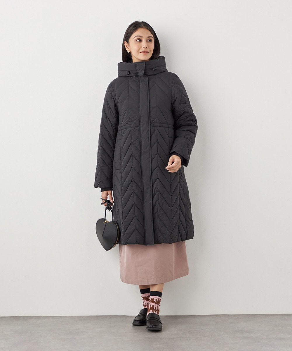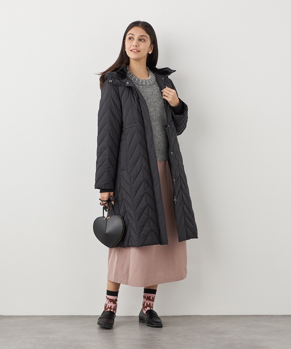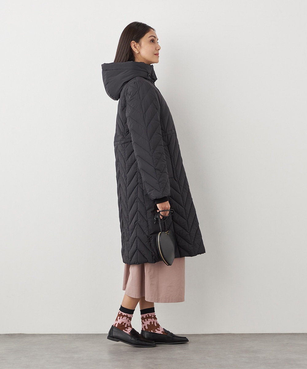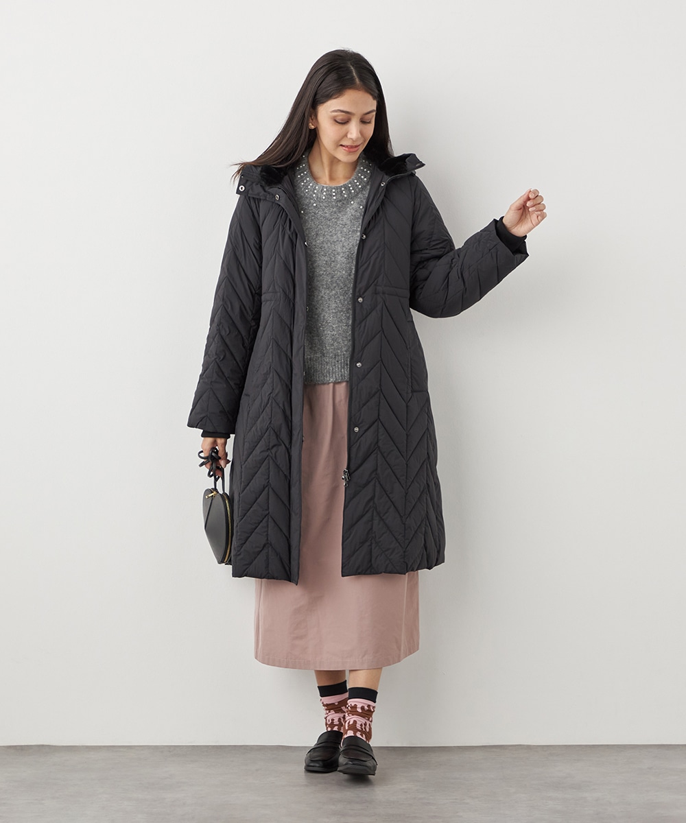 ヘリンボーン風のジグザグ柄のステッチが印象的。高めのウエスト位置ですっきり着こなせるロングコート。
