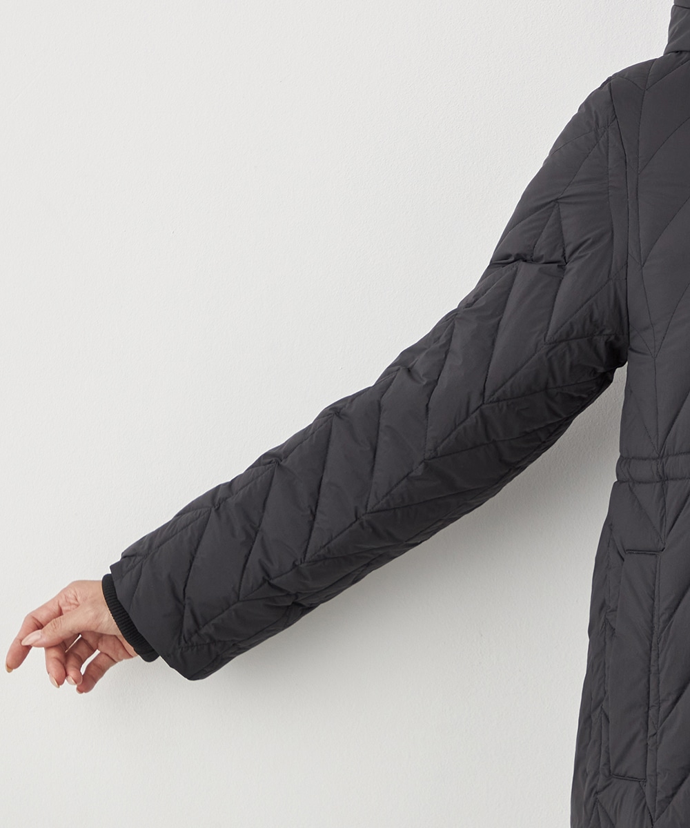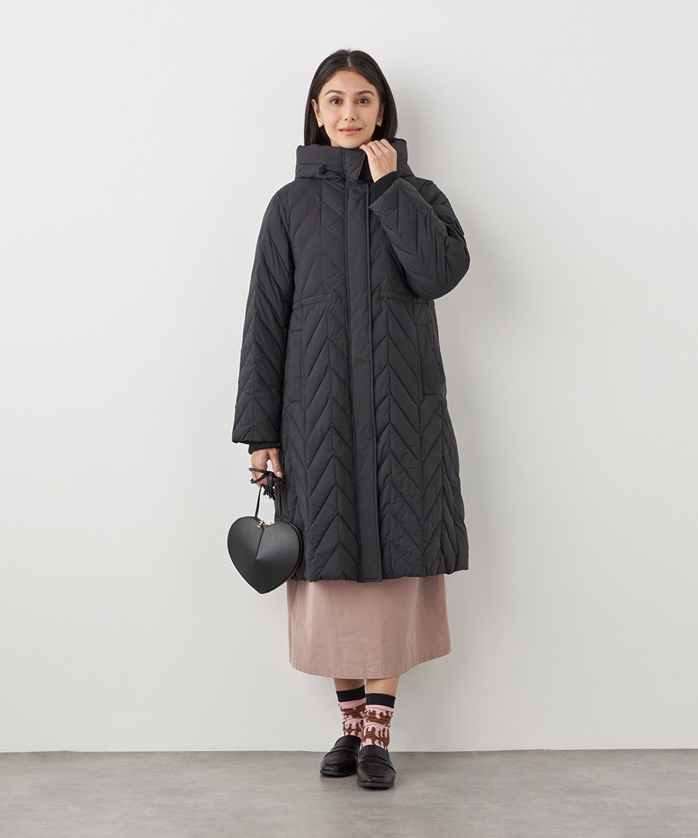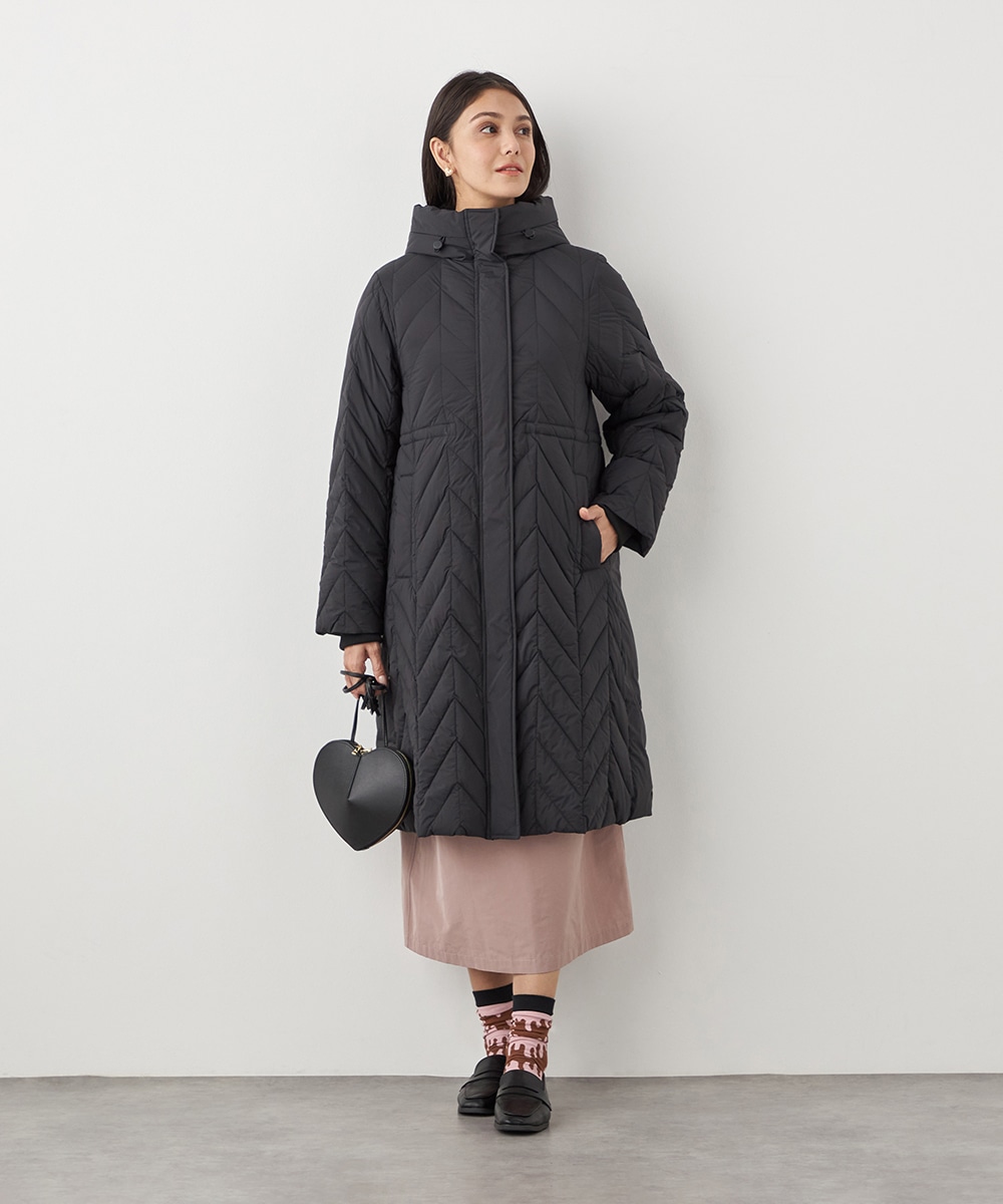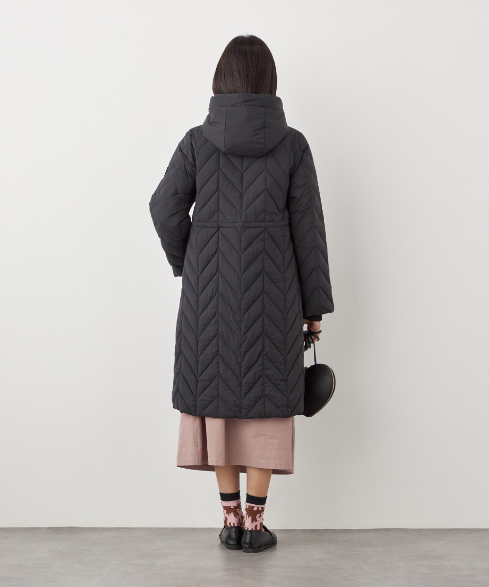 ヘリンボーン風のジグザグ柄のステッチが印象的。高めのウエスト位置ですっきり着こなせるロングコート。
