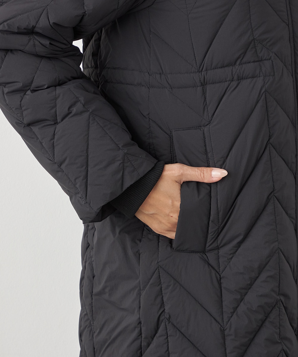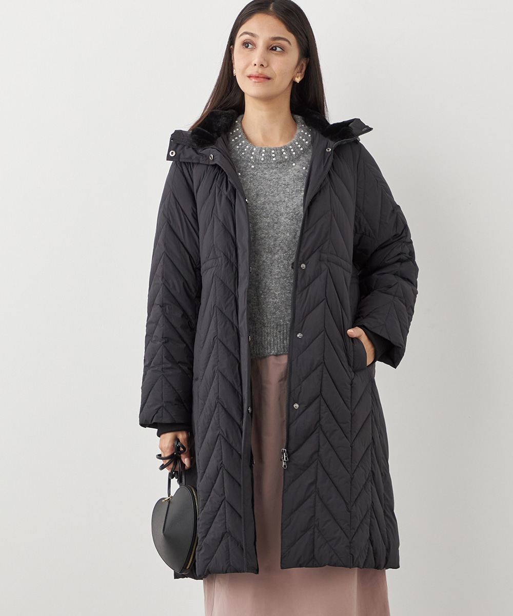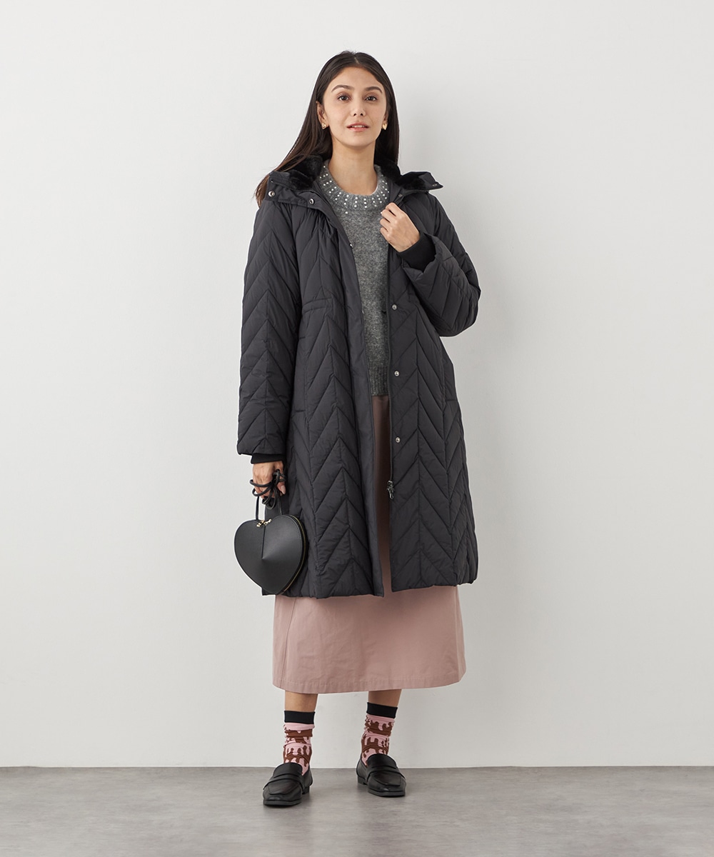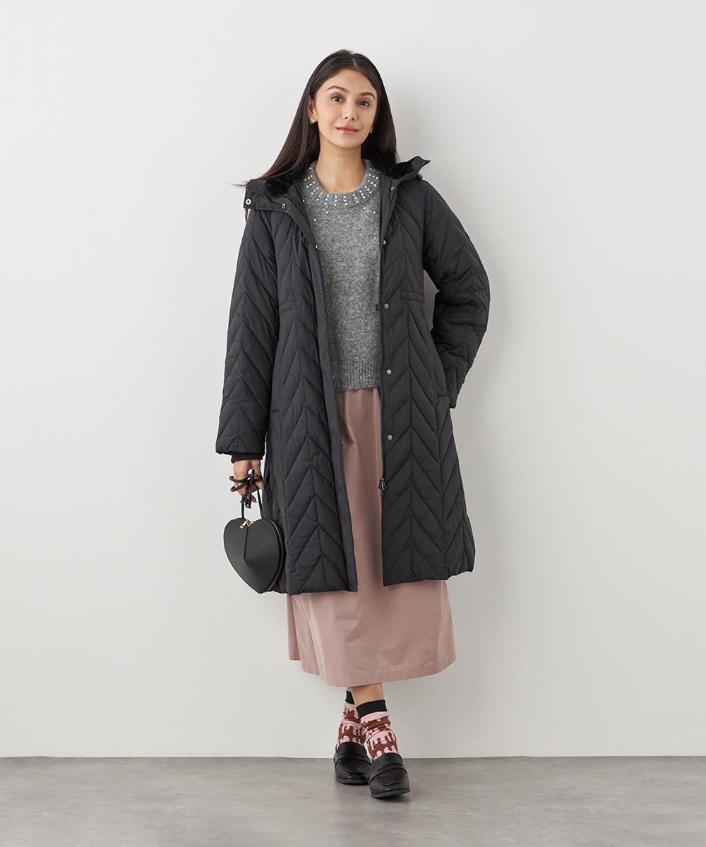 ヘリンボーン風のジグザグ柄のステッチが印象的。高めのウエスト位置ですっきり着こなせるロングコート。