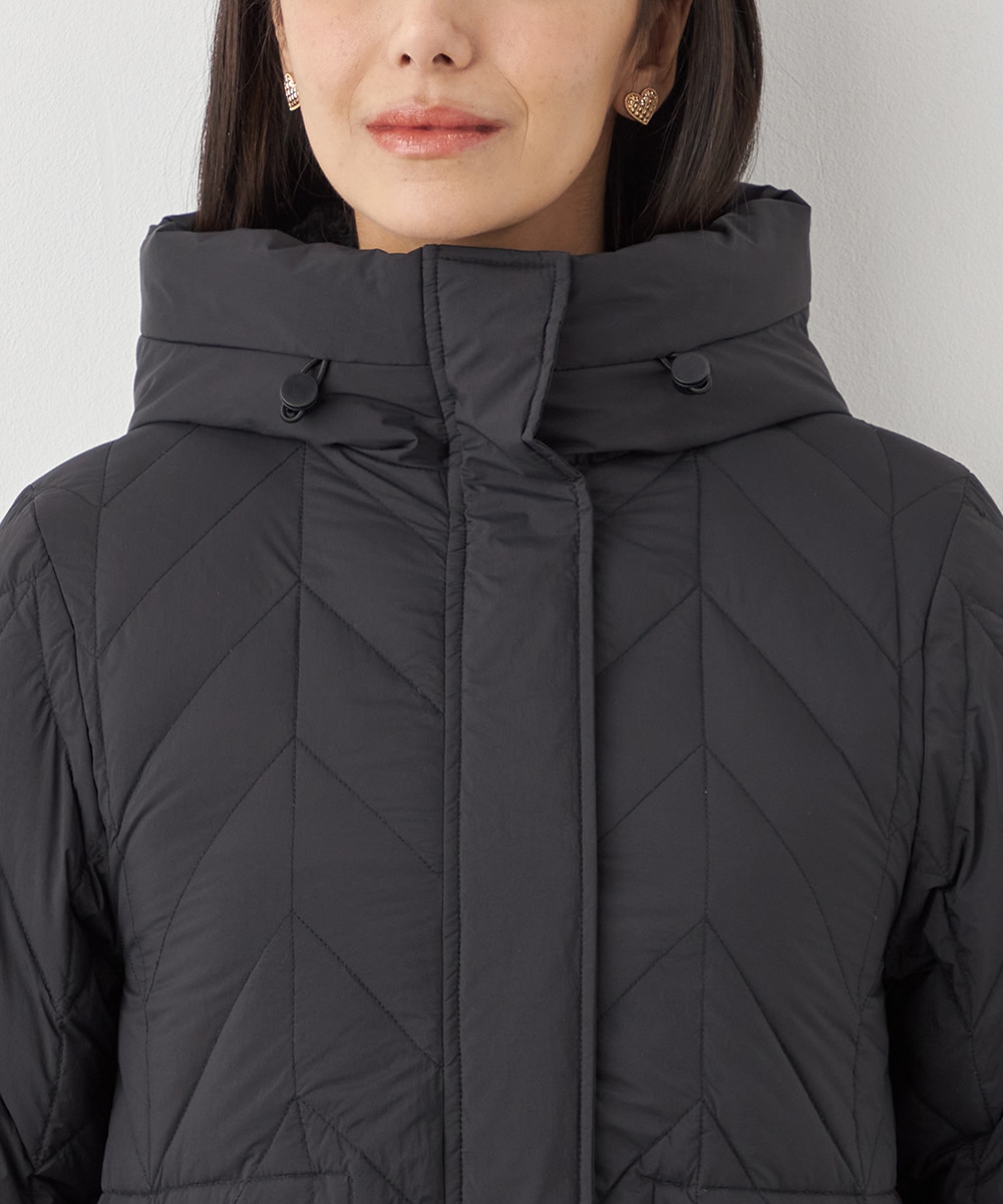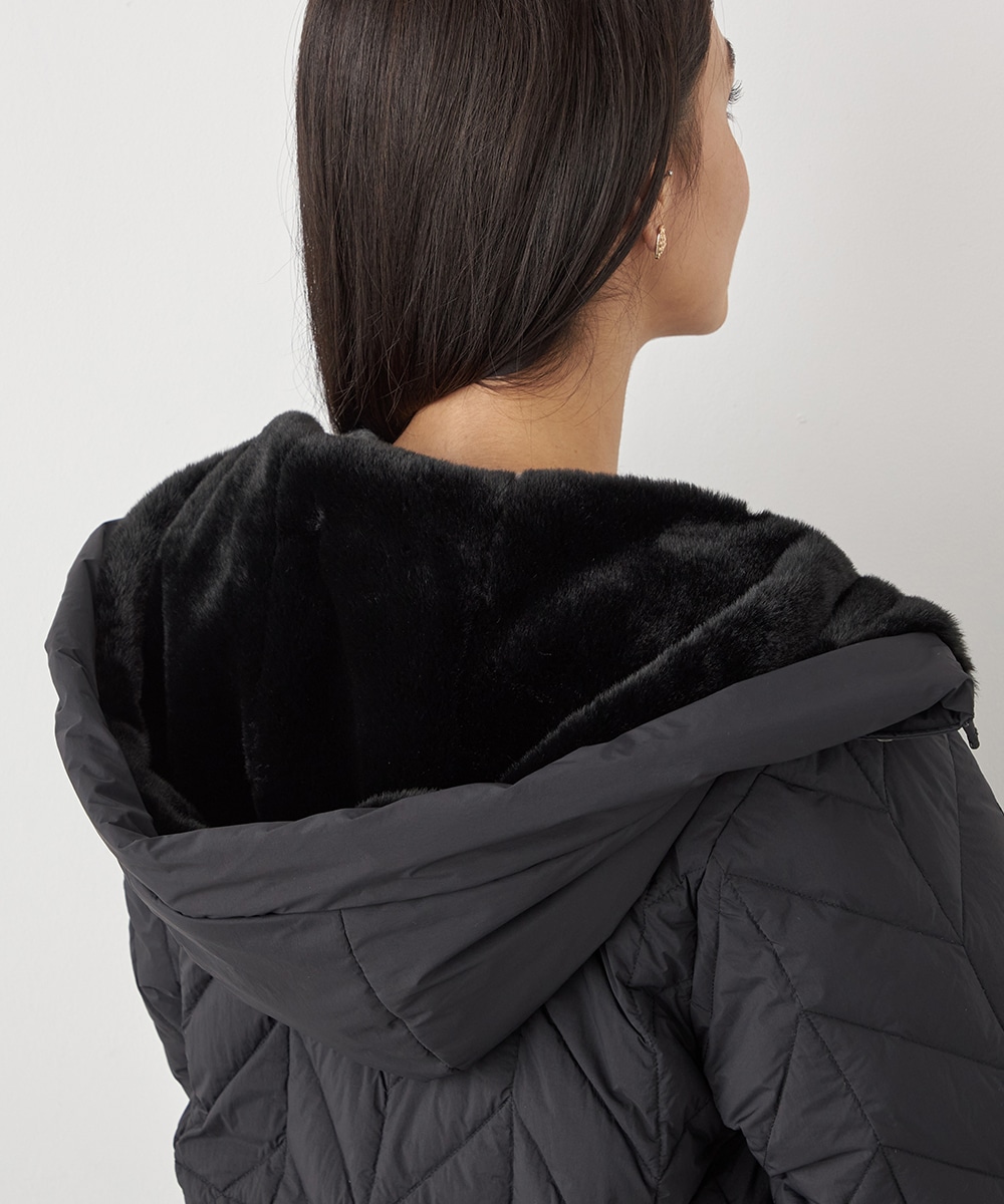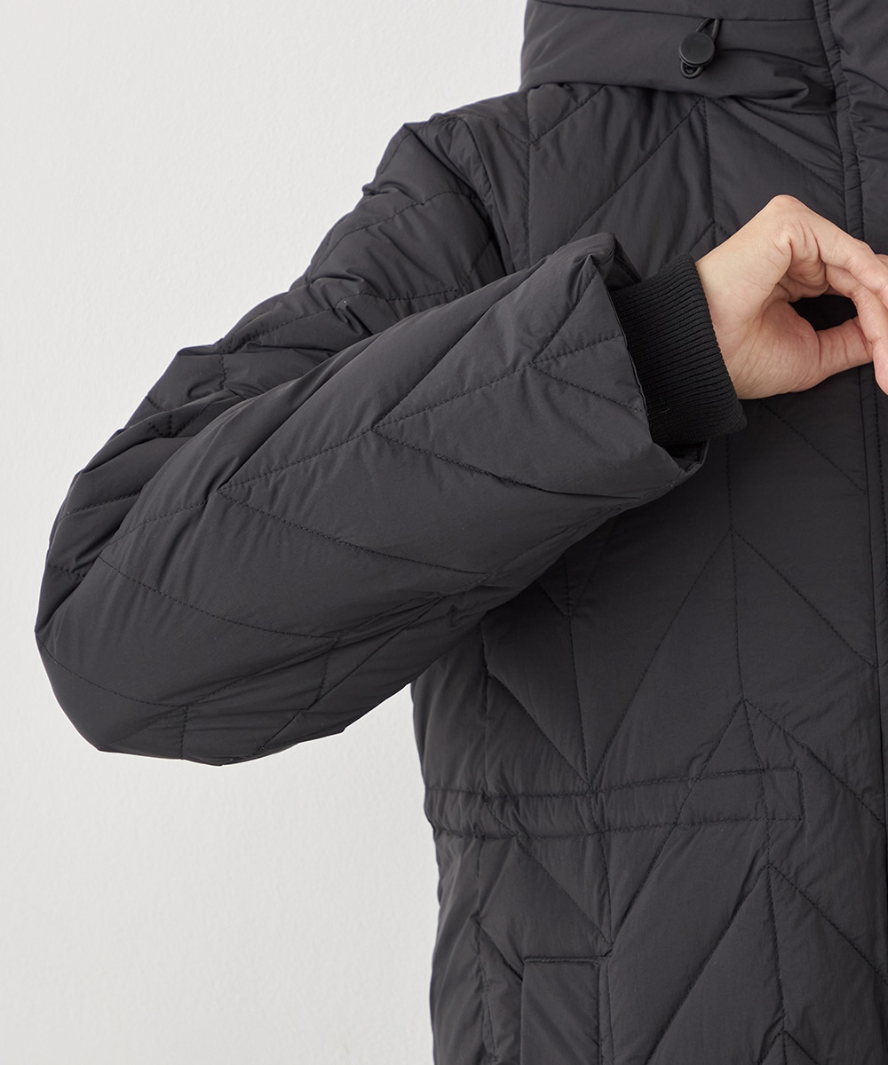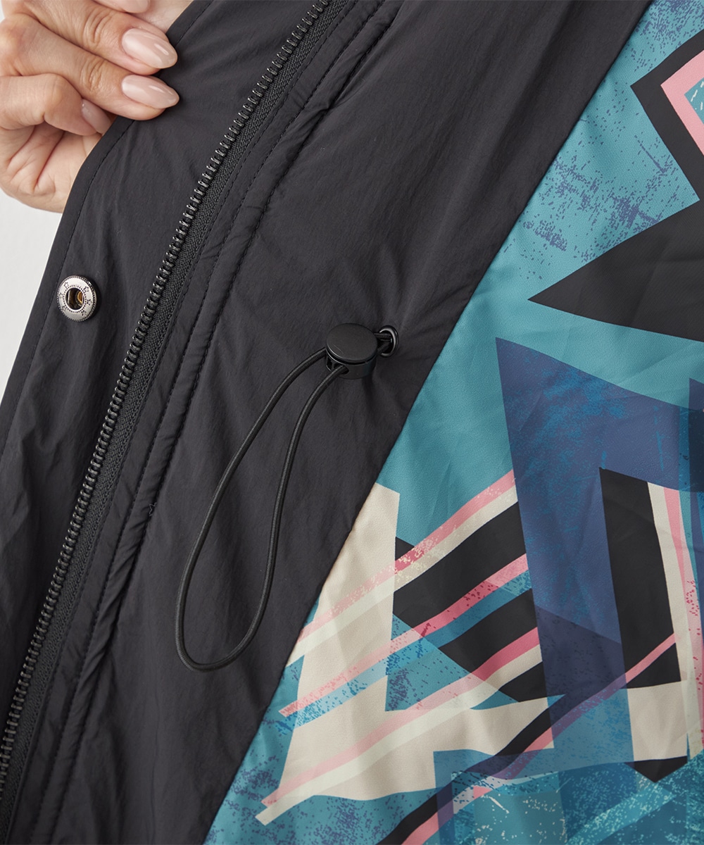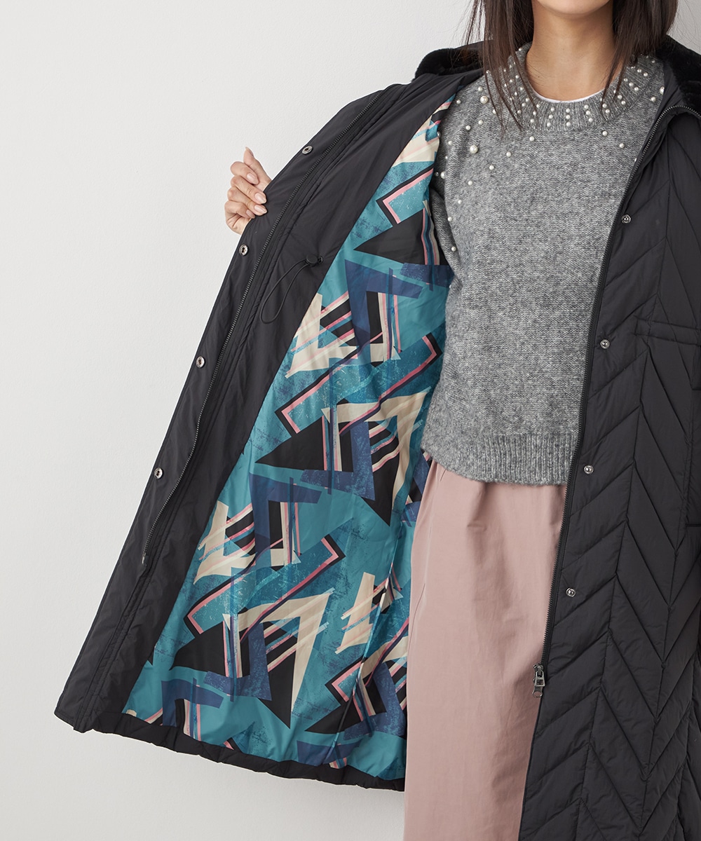 上品なベージュと定番のブラックの2色展開です。フード裏にはウォーム感あふれるボア素材があしらわれています。ウエスト裏側のコードの絞り具合によってシルエットのアレンジが可能。裏地はカラフルな幾何学柄が取り入れられ、見えない部分もおしゃれな仕上がりです。