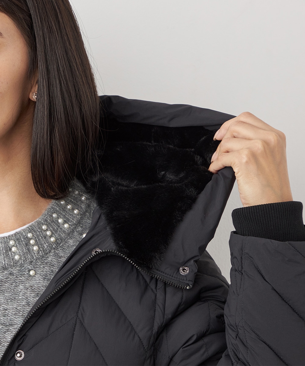 表地/ナイロン100%, 裏地/ポリエステル100%, ファー部分/ポリエステル100%, 袖リブ部分/ポリエステル100%, 中わた/ダウン80%, フェザー20%