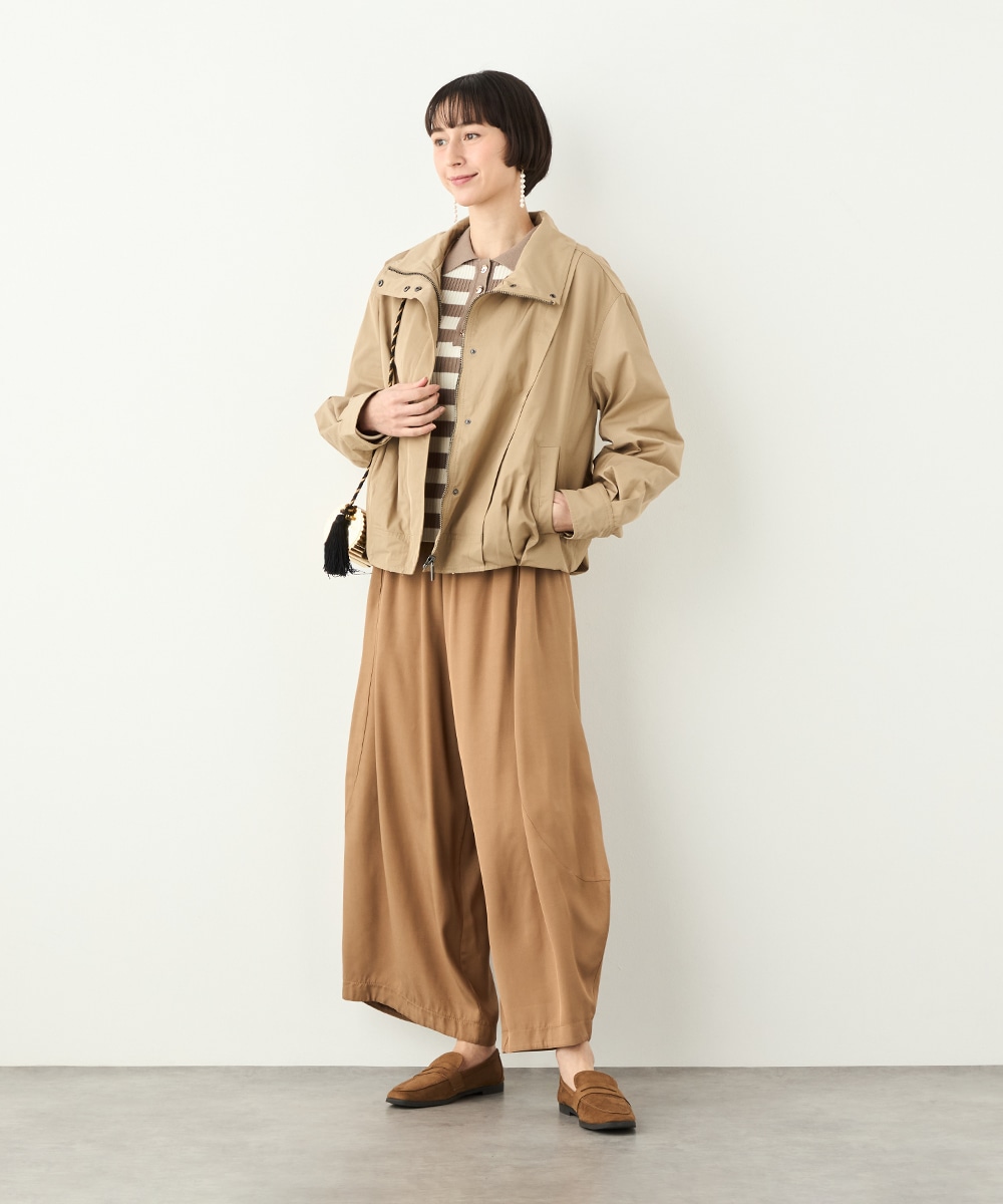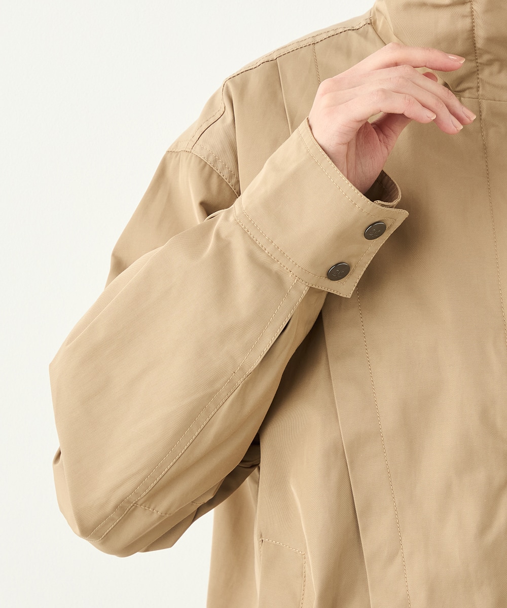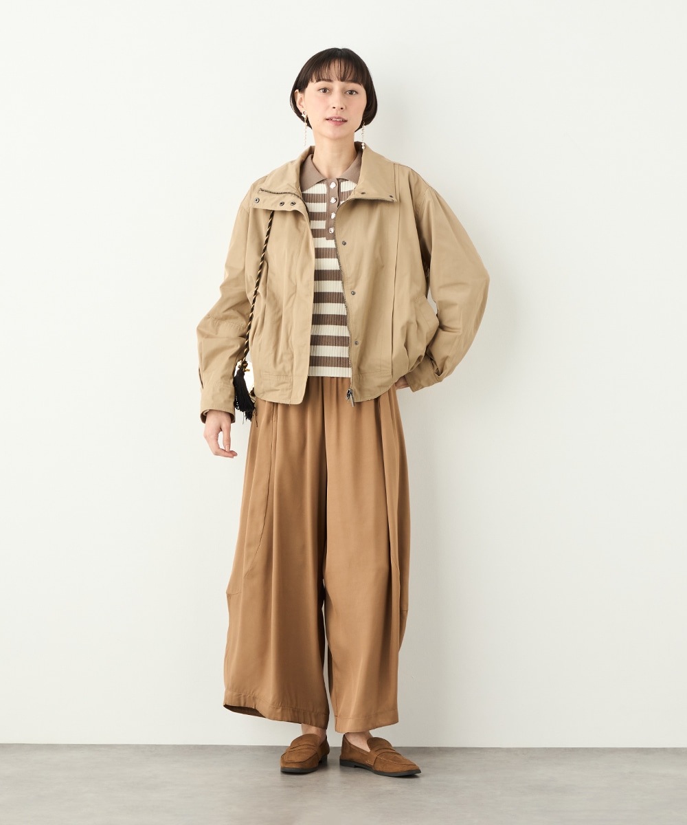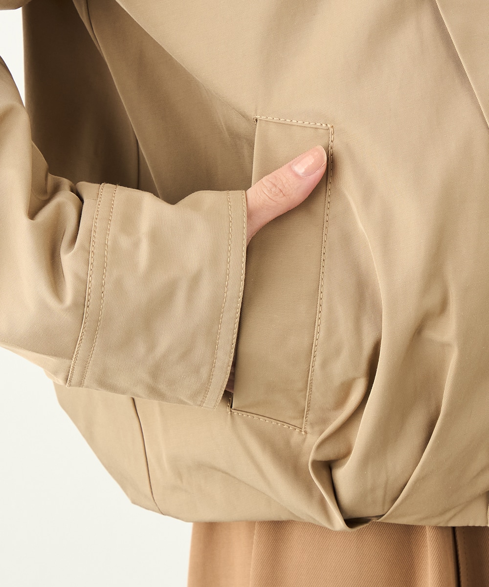 ベーシックなベージュの無地のデザインで着こなしやすくも、独特の存在感がある1枚です。ふんわりとしたシルエットやドロップショルダーでトレンド感が加わっています。大人っぽくスタイリッシュな印象の立ち襟は、フロントジップの開き具合によってアレンジが可能です。