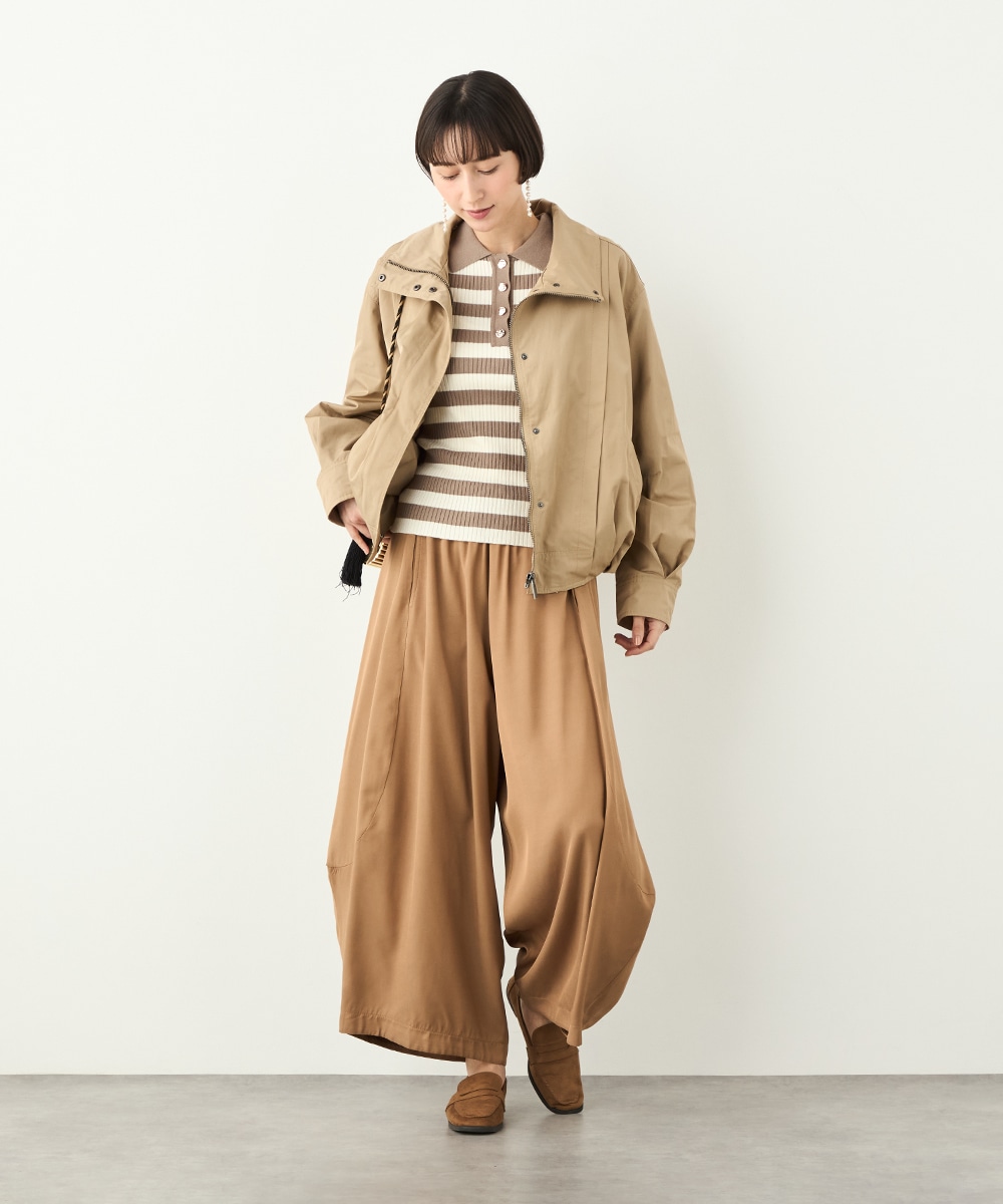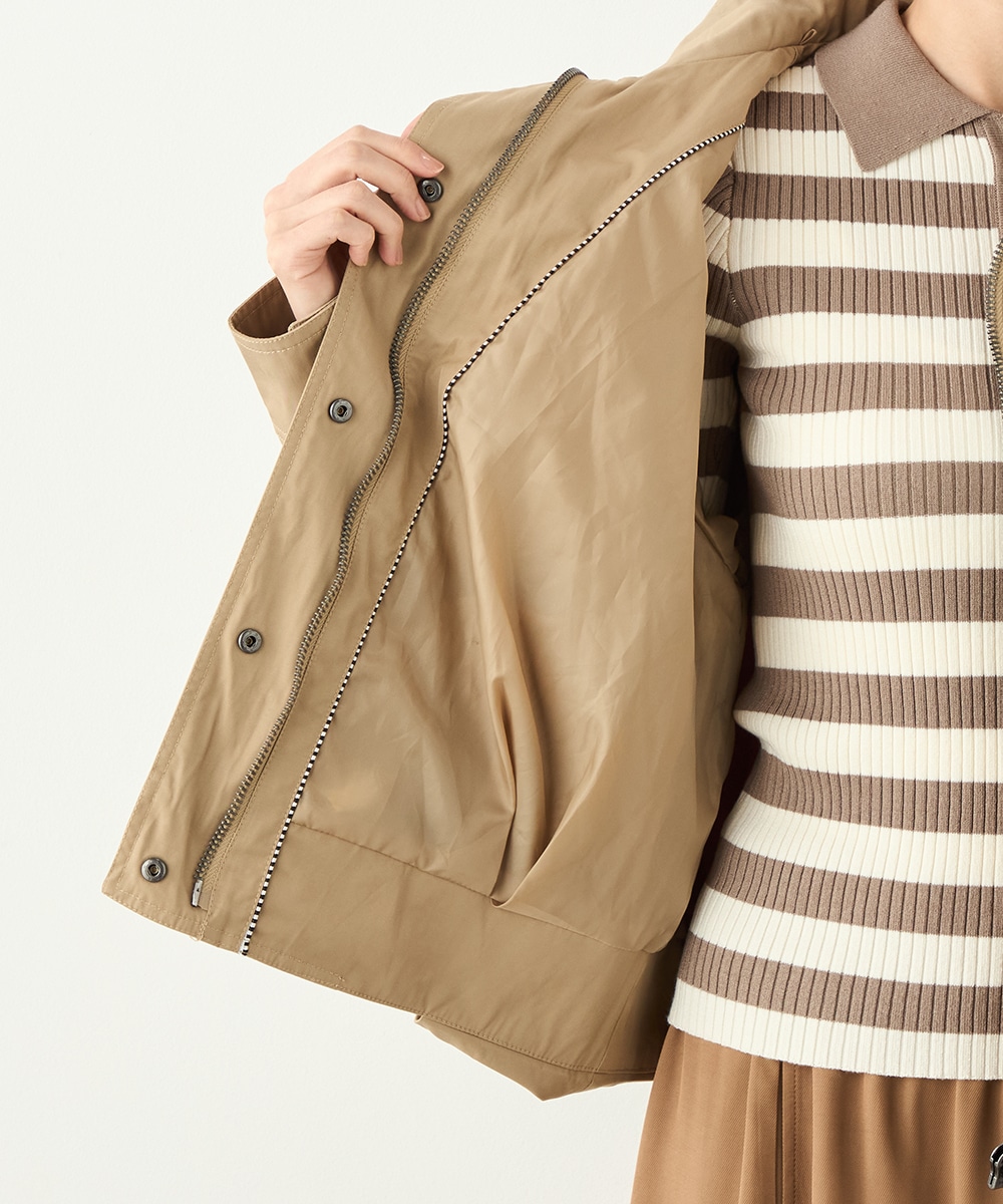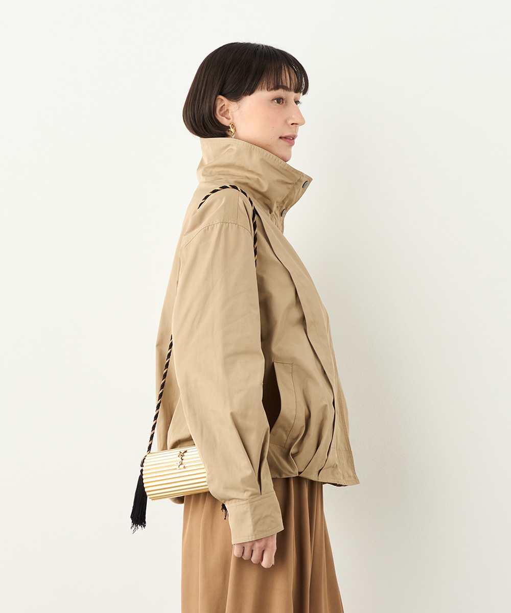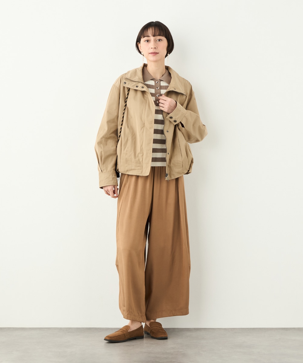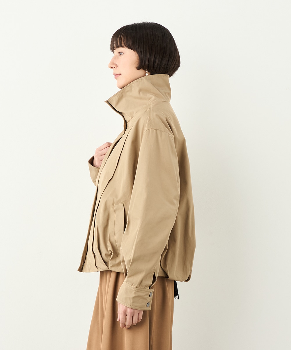 ベーシックなベージュの無地のデザインで着こなしやすくも、独特の存在感がある1枚です。ふんわりとしたシルエットやドロップショルダーでトレンド感が加わっています。大人っぽくスタイリッシュな印象の立ち襟は、フロントジップの開き具合によってアレンジが可能です。