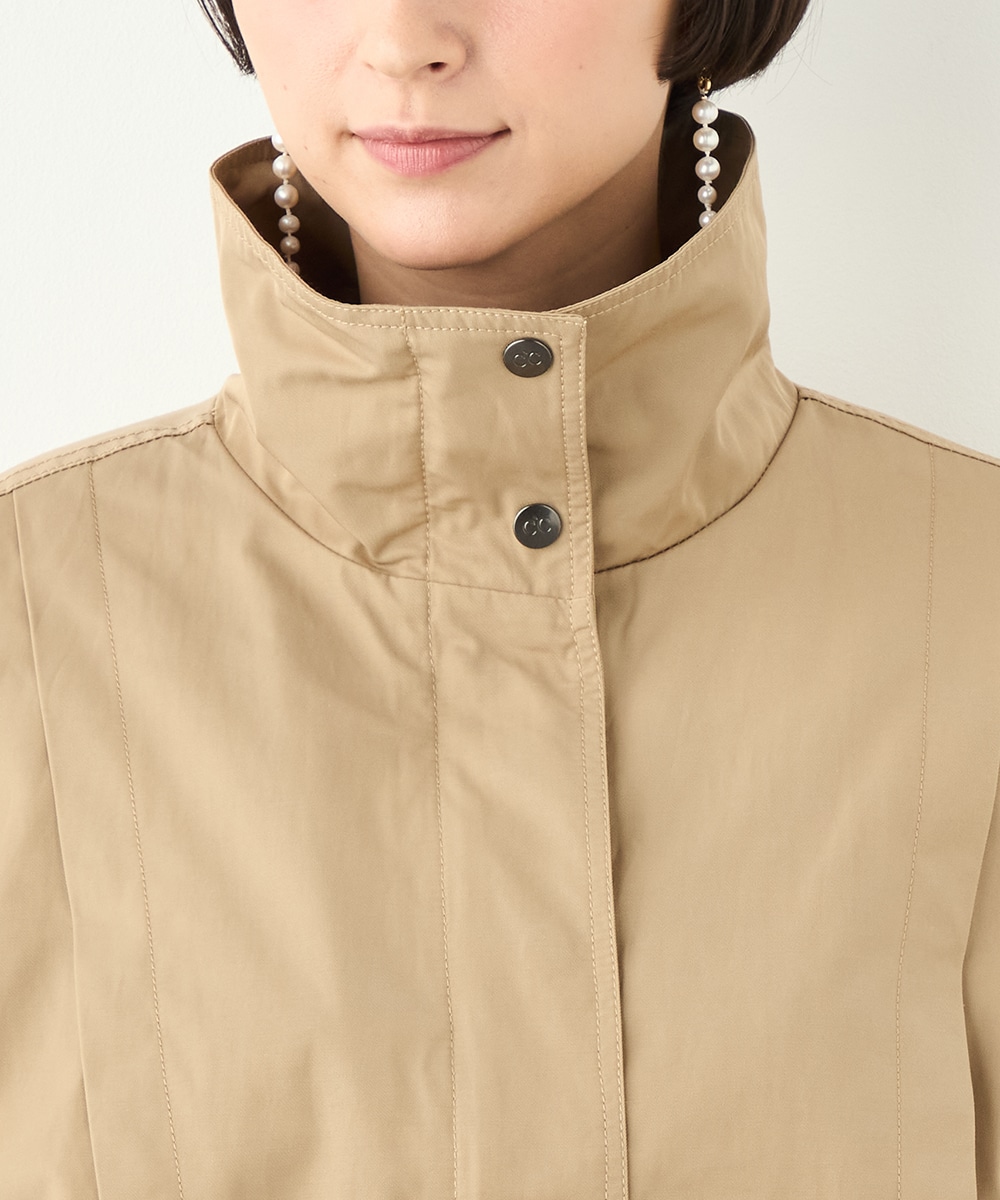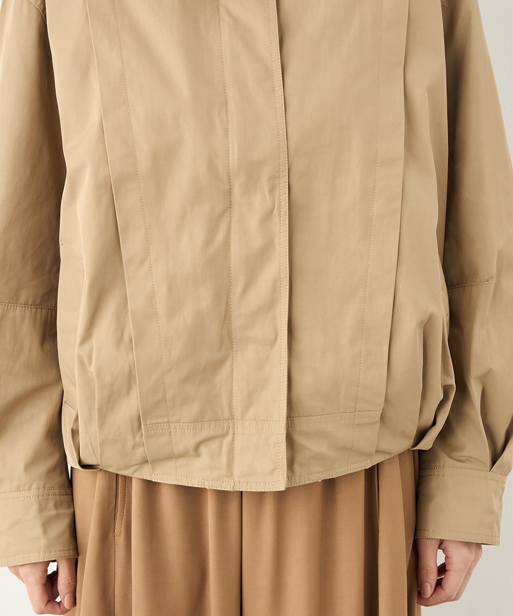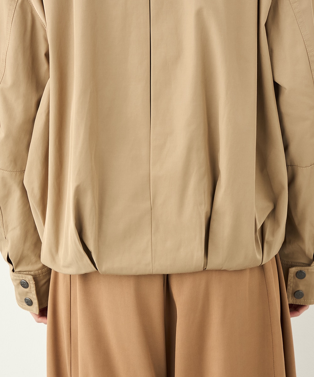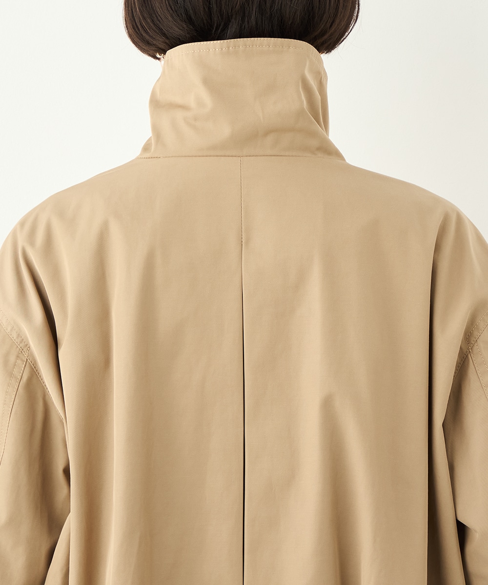 ベーシックなベージュの無地のデザインで着こなしやすくも、独特の存在感がある1枚です。ふんわりとしたシルエットやドロップショルダーでトレンド感が加わっています。大人っぽくスタイリッシュな印象の立ち襟は、フロントジップの開き具合によってアレンジが可能です。