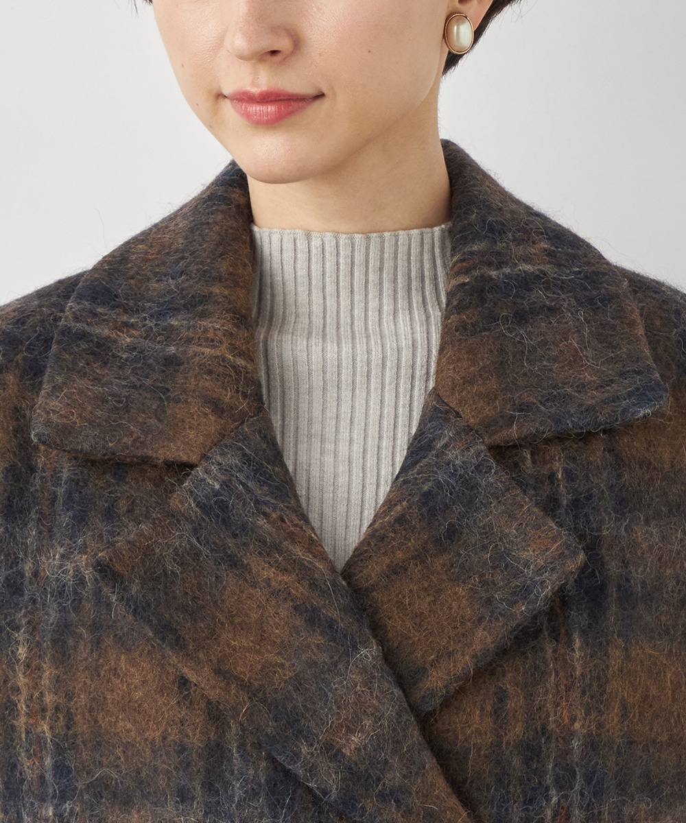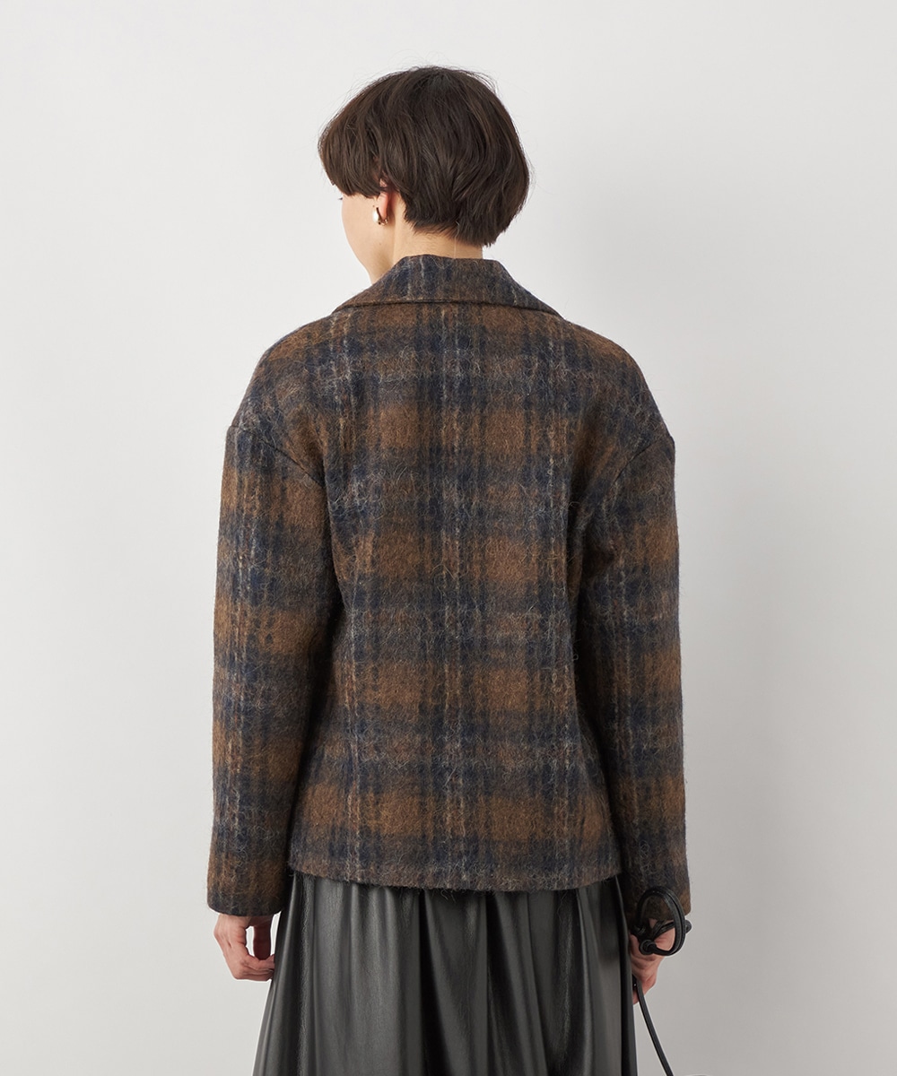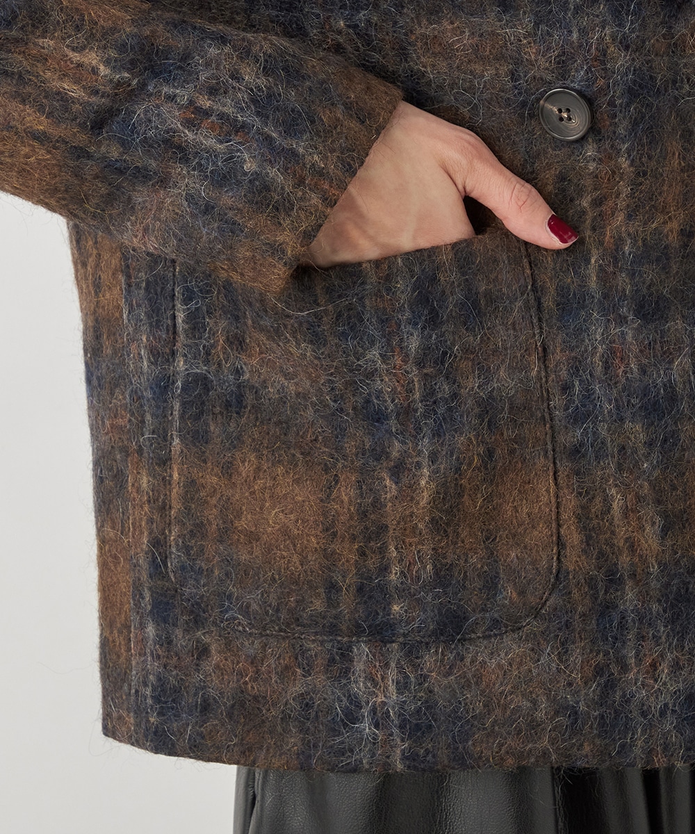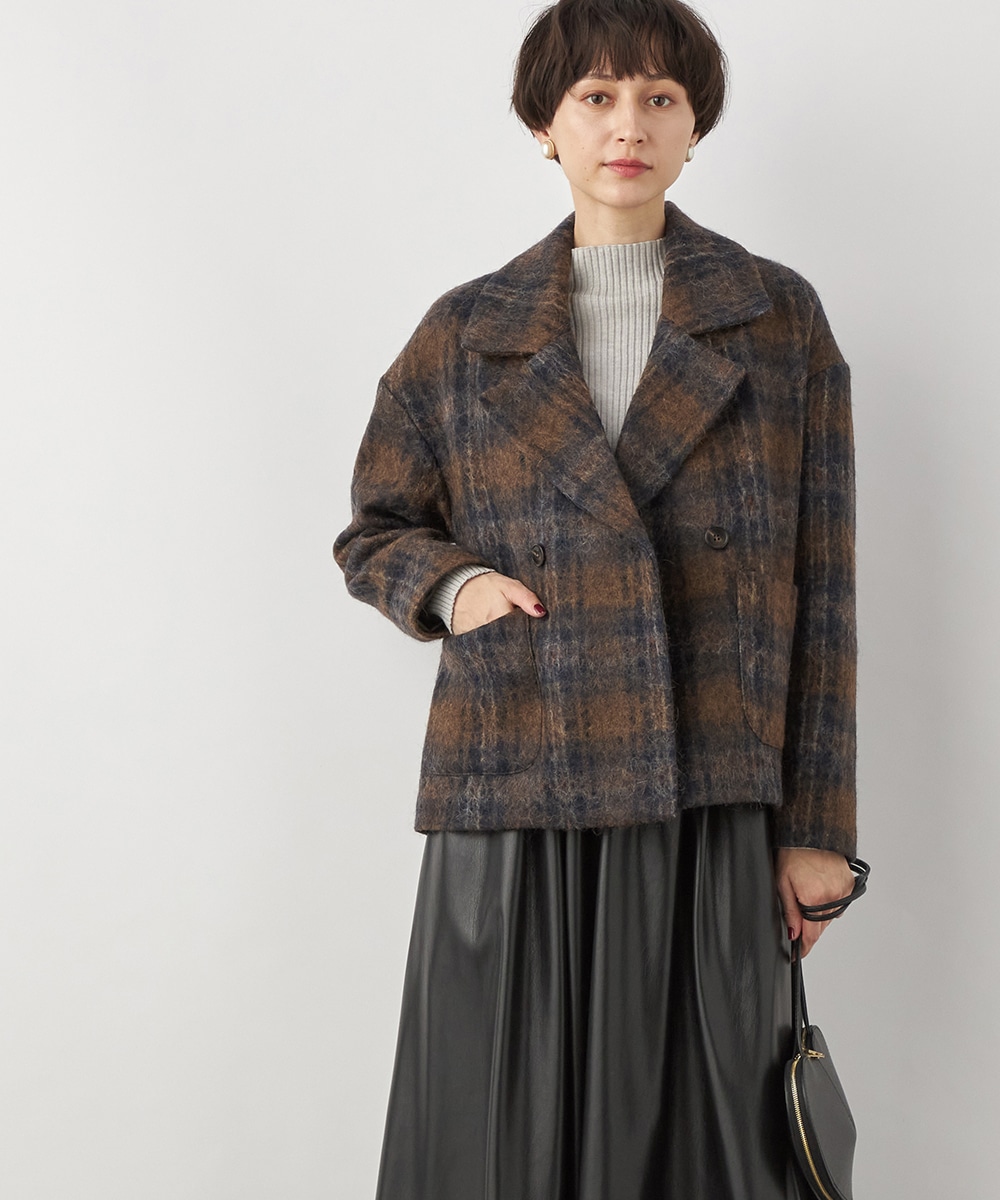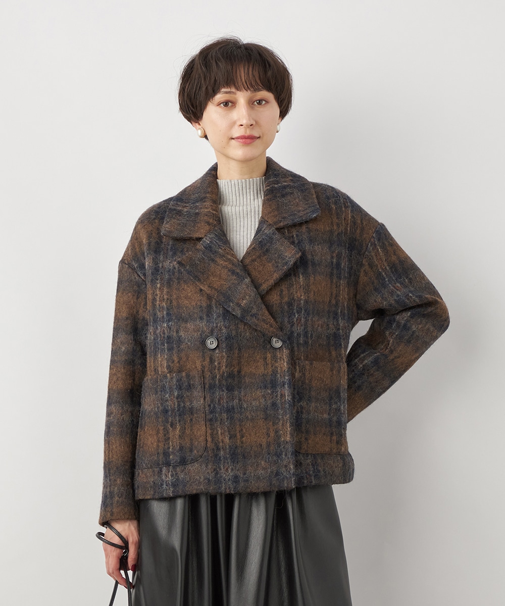 落ち着いた配色で品よく仕上げたチェック柄のショート丈コートです。トラディショナルな中にも、毛足の長いシャギー生地が旬なムードを漂わせます。フロントはボタンを2列にあしらった上品なデザインで、華やかな広めの襟幅も着こなしのポイントです。肩線を落としたボックス風シルエットにより、ルーズニットなどの上にもすっきり羽織れます。
