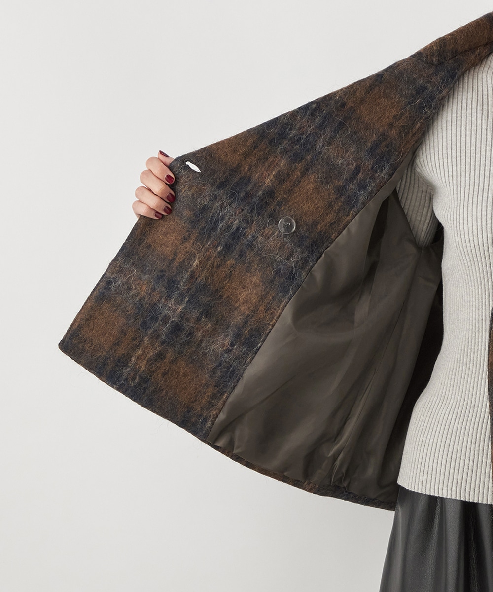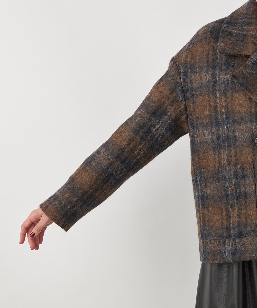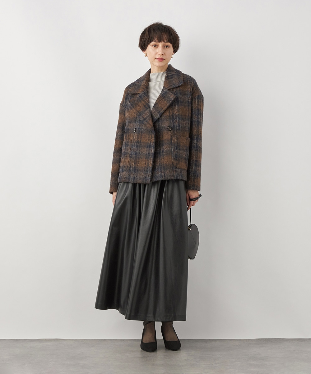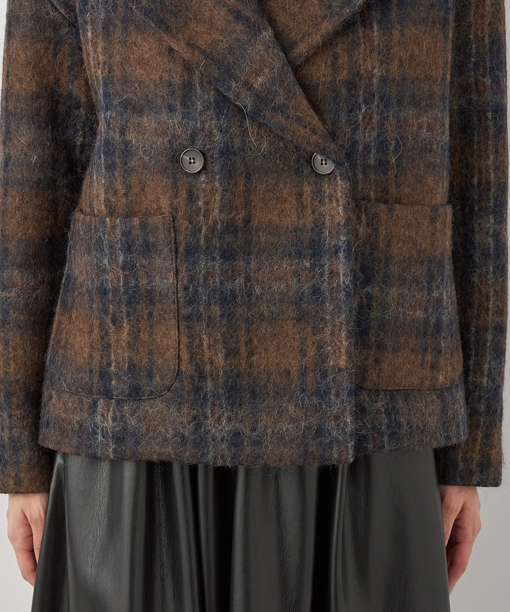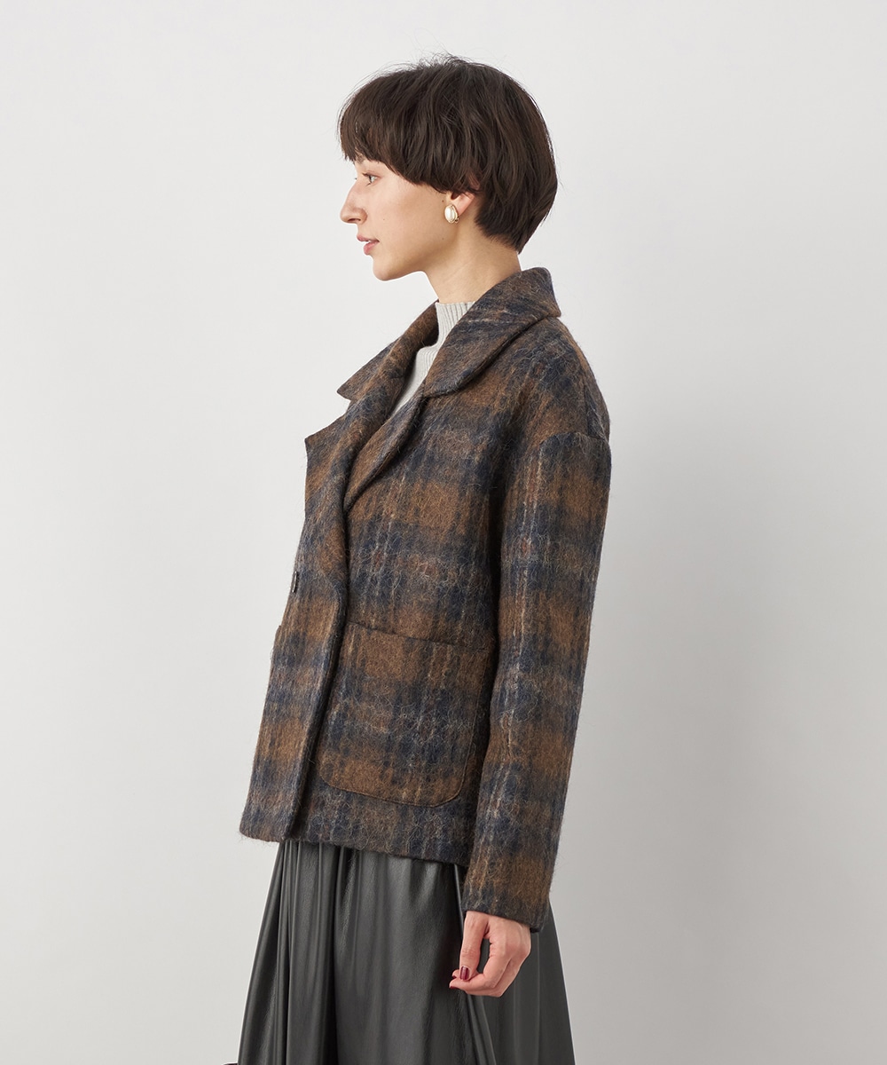 落ち着いた配色で品よく仕上げたチェック柄のショート丈コートです。トラディショナルな中にも、毛足の長いシャギー生地が旬なムードを漂わせます。フロントはボタンを2列にあしらった上品なデザインで、華やかな広めの襟幅も着こなしのポイントです。肩線を落としたボックス風シルエットにより、ルーズニットなどの上にもすっきり羽織れます。