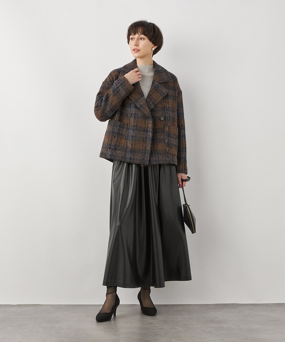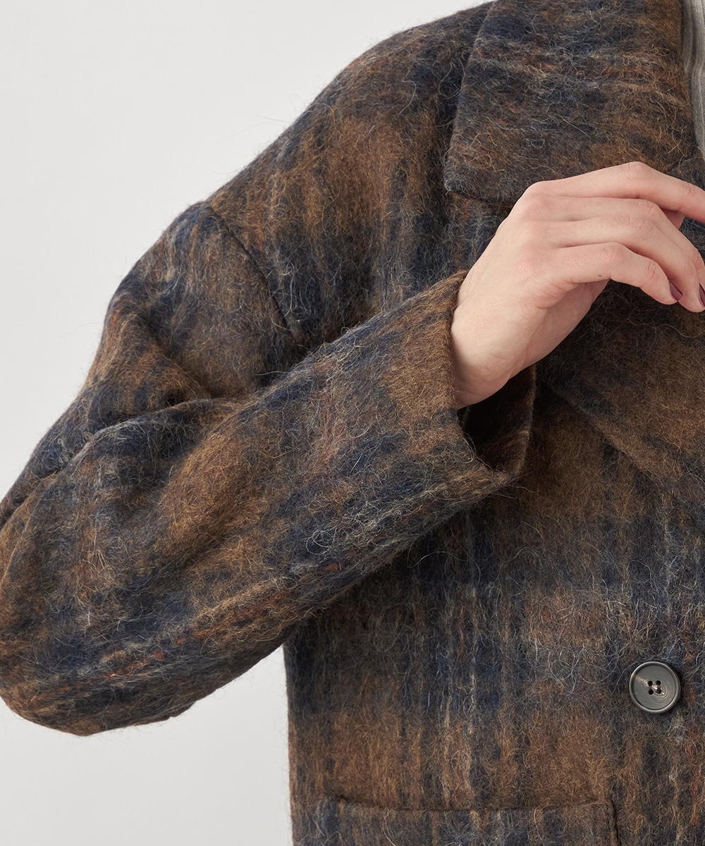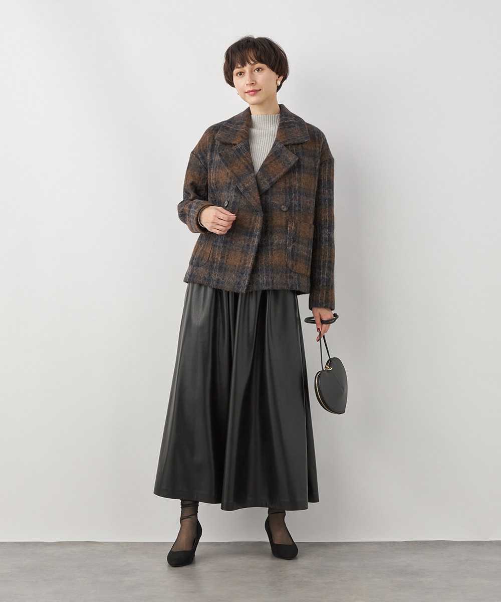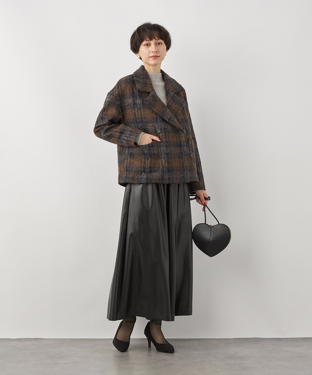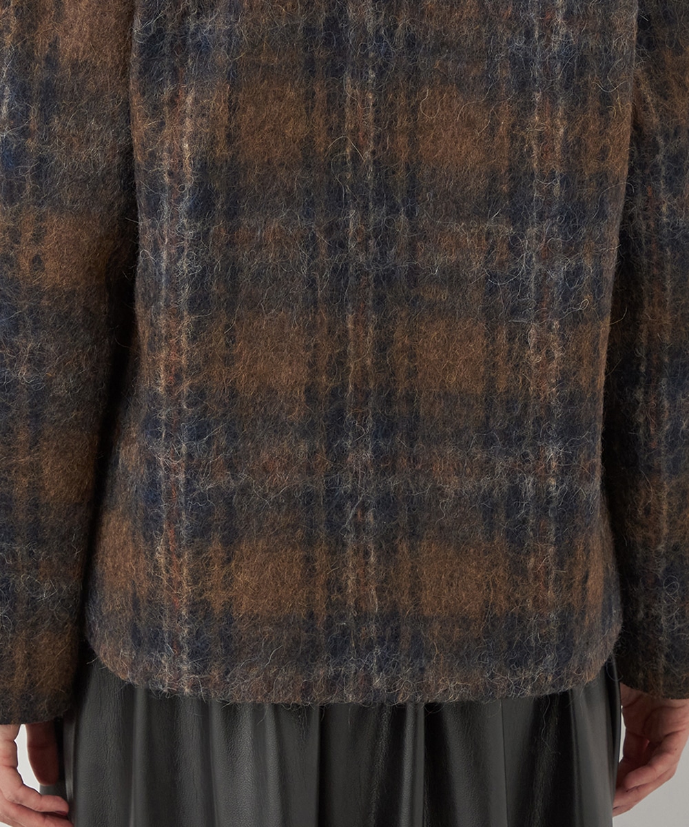 落ち着いた配色で品よく仕上げたチェック柄のショート丈コートです。トラディショナルな中にも、毛足の長いシャギー生地が旬なムードを漂わせます。フロントはボタンを2列にあしらった上品なデザインで、華やかな広めの襟幅も着こなしのポイントです。肩線を落としたボックス風シルエットにより、ルーズニットなどの上にもすっきり羽織れます。