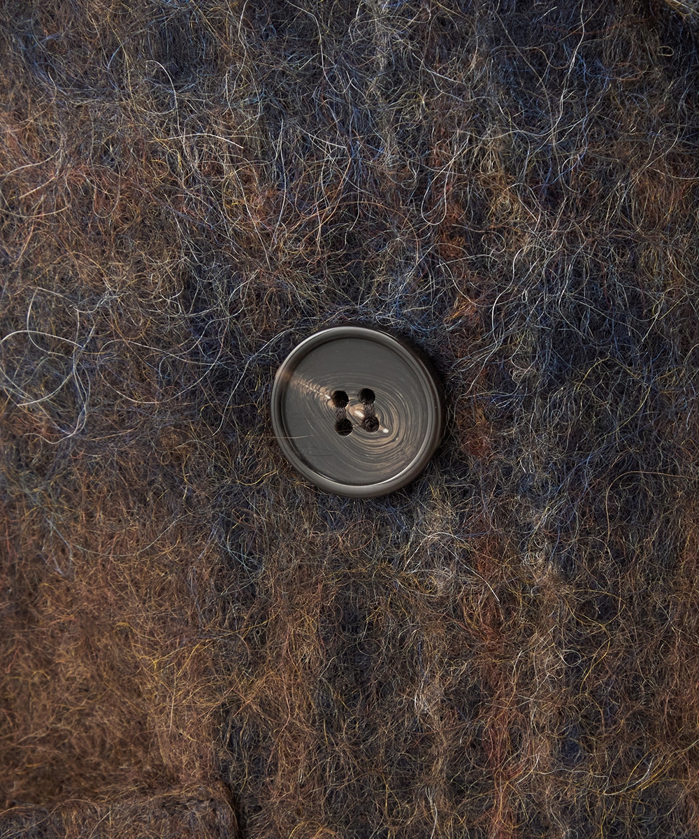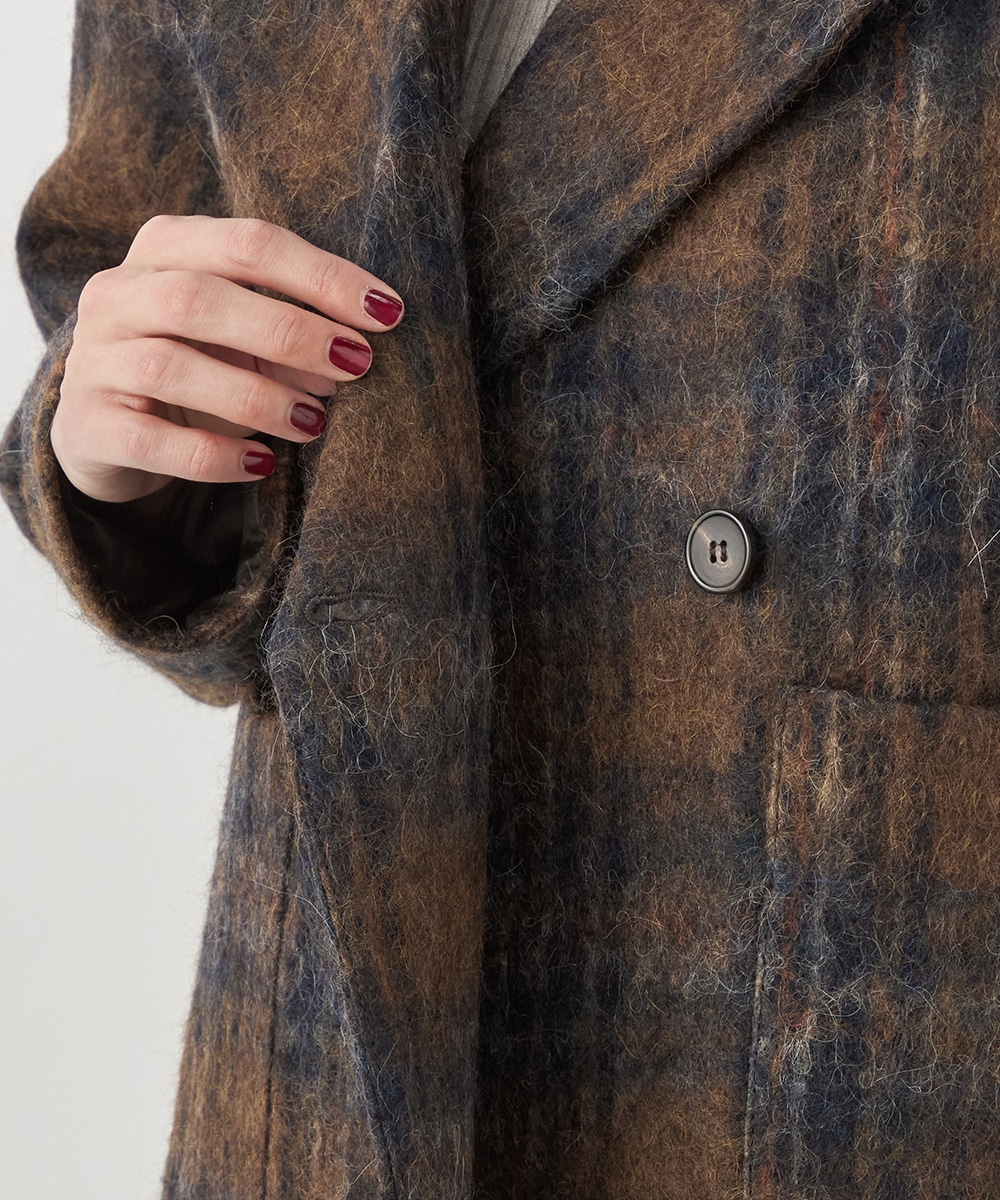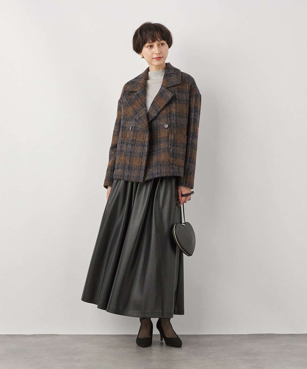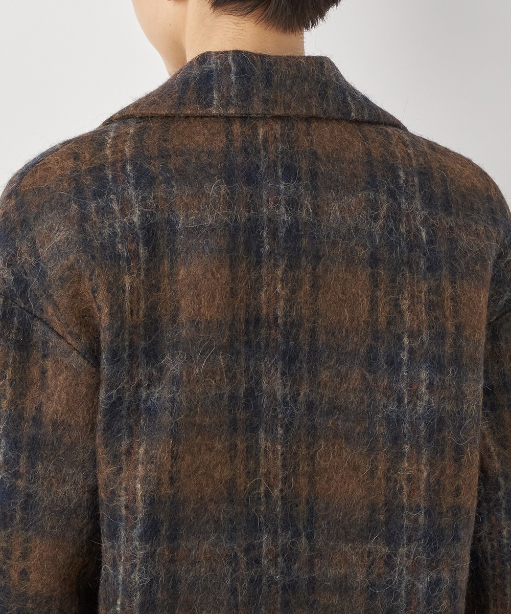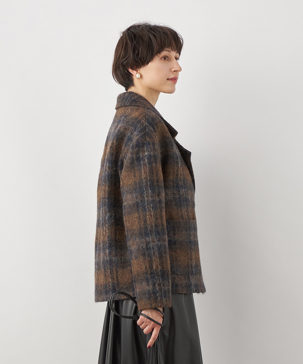 落ち着いた配色で品よく仕上げたチェック柄のショート丈コートです。トラディショナルな中にも、毛足の長いシャギー生地が旬なムードを漂わせます。フロントはボタンを2列にあしらった上品なデザインで、華やかな広めの襟幅も着こなしのポイントです。肩線を落としたボックス風シルエットにより、ルーズニットなどの上にもすっきり羽織れます。