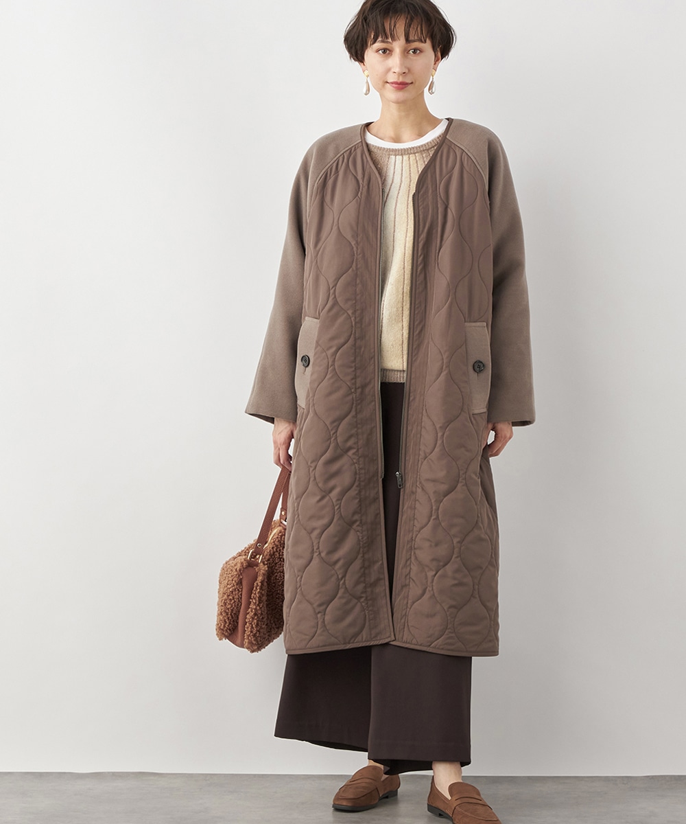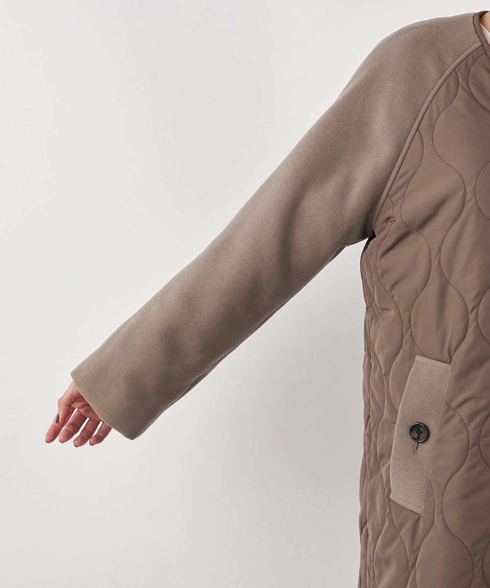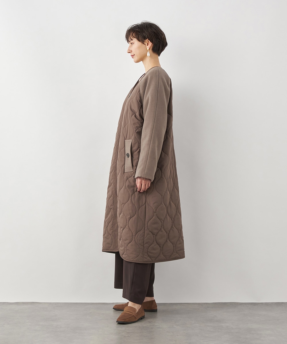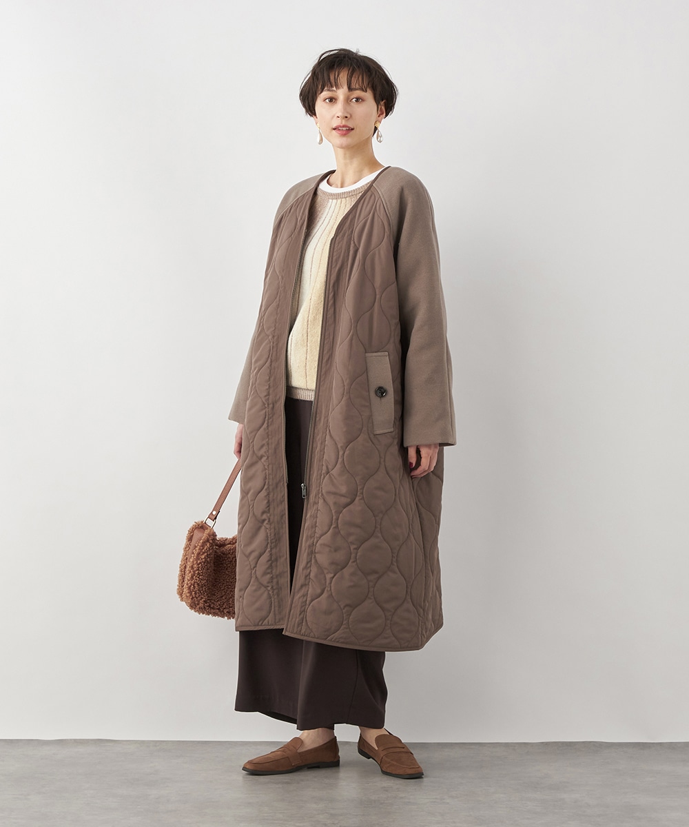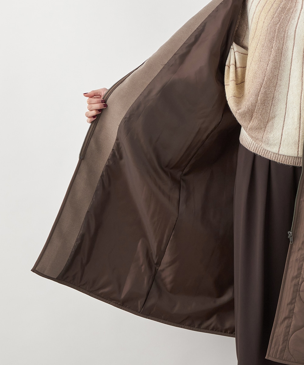 キルティング素材と布帛を組み合わせています。ほどよい分量感の中わたで、軽くて扱いやすいのも魅力です。フロントはスポーティな印象のジップ開きを採用。着丈は長めで重厚感があります。ストールやマフラー、フード付きトップスとの相性が良いノーカラーデザインです。