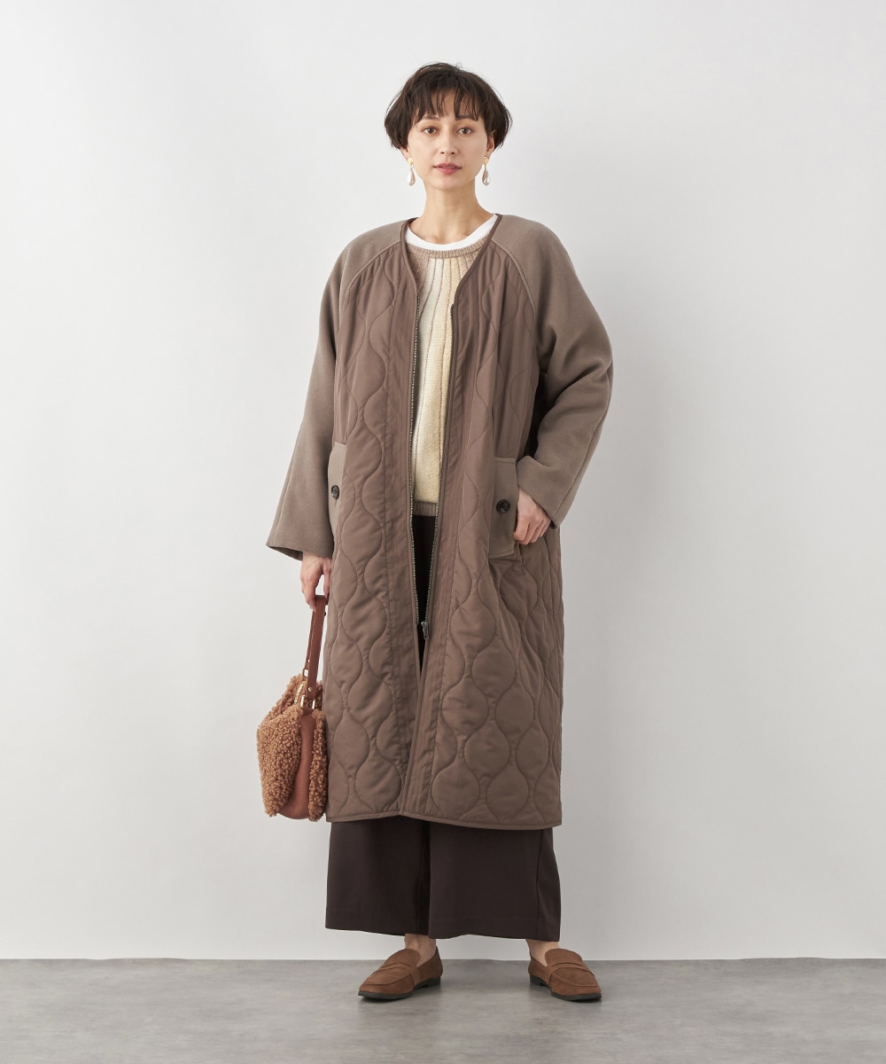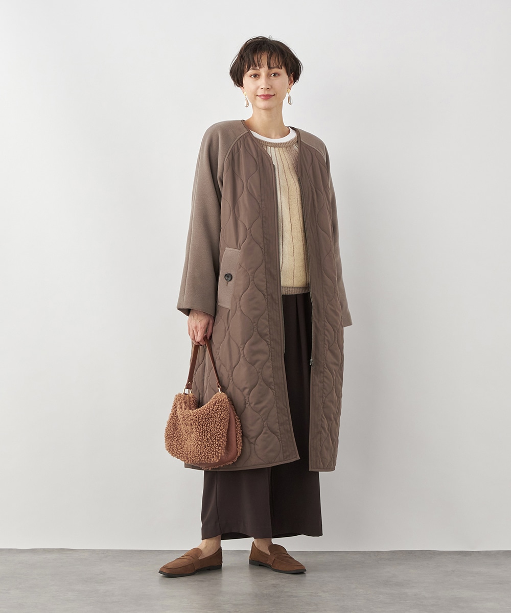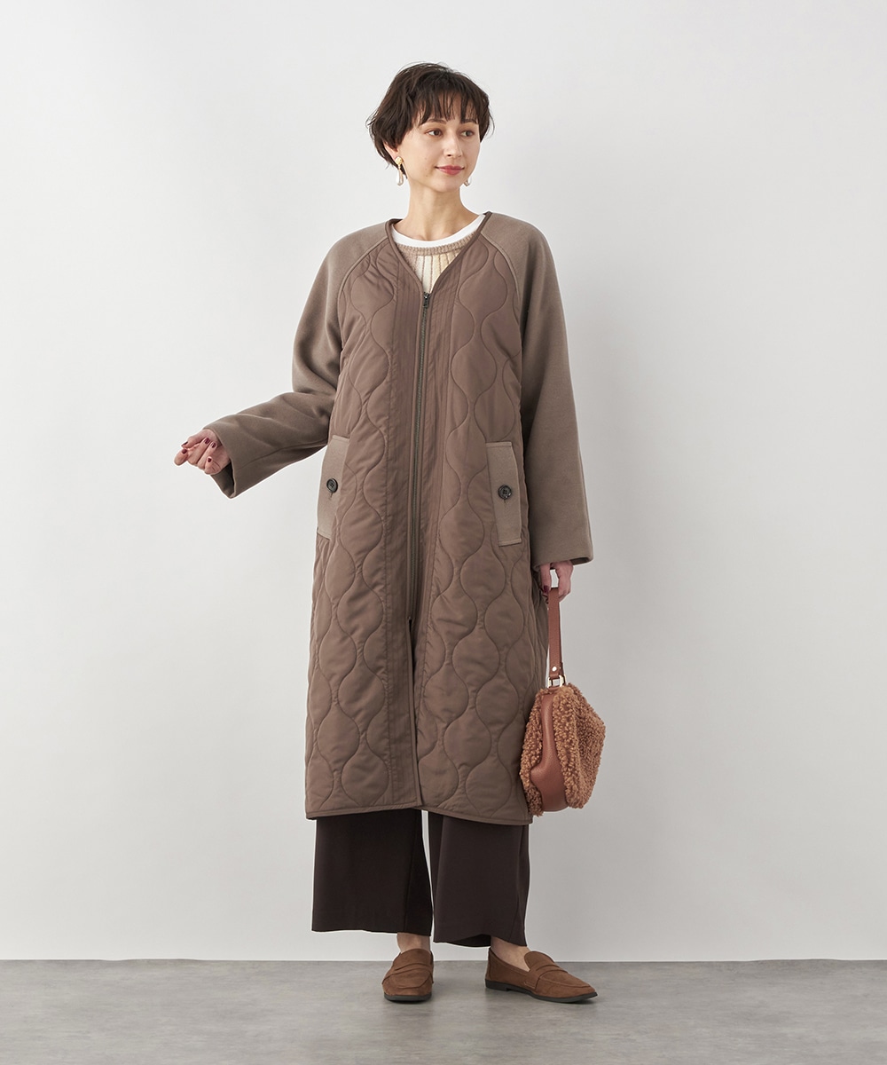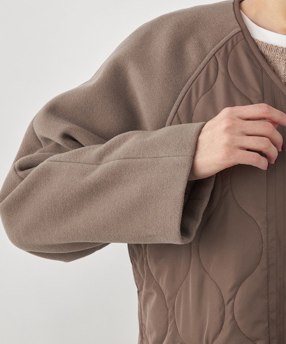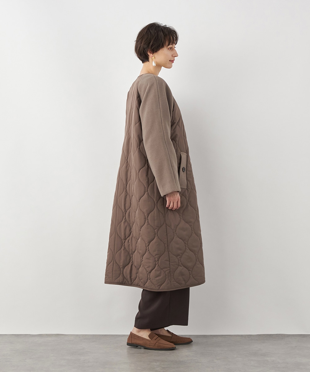 キルティング素材と布帛を組み合わせています。ほどよい分量感の中わたで、軽くて扱いやすいのも魅力です。フロントはスポーティな印象のジップ開きを採用。着丈は長めで重厚感があります。ストールやマフラー、フード付きトップスとの相性が良いノーカラーデザインです。