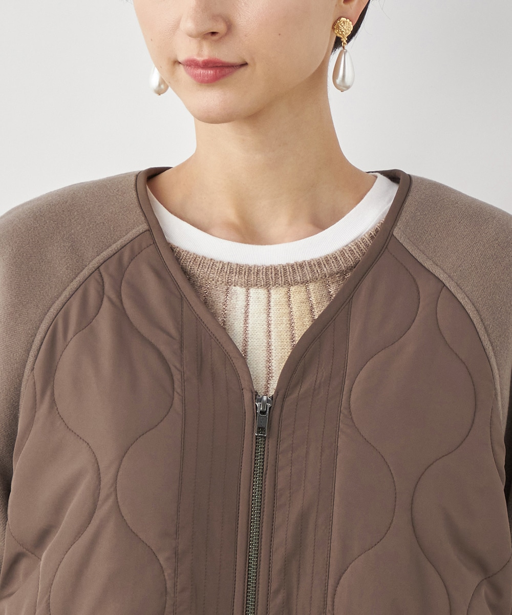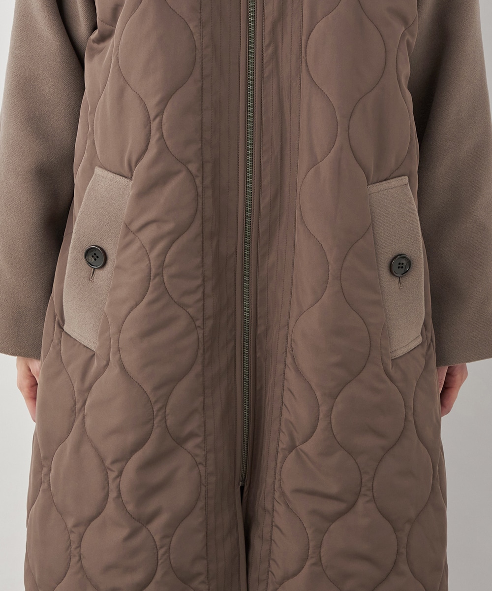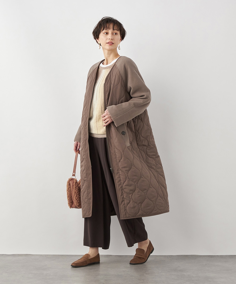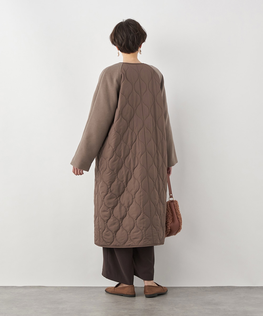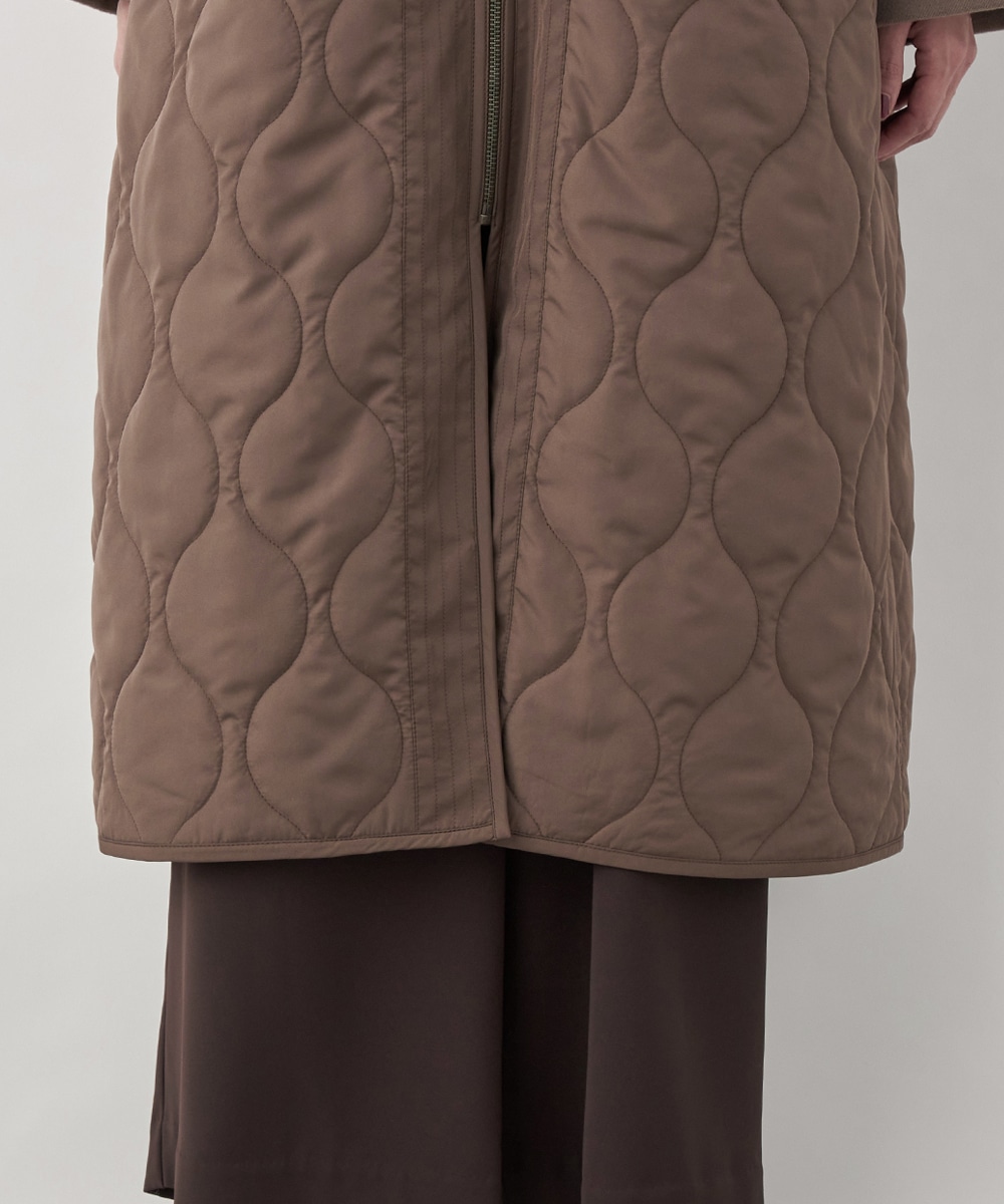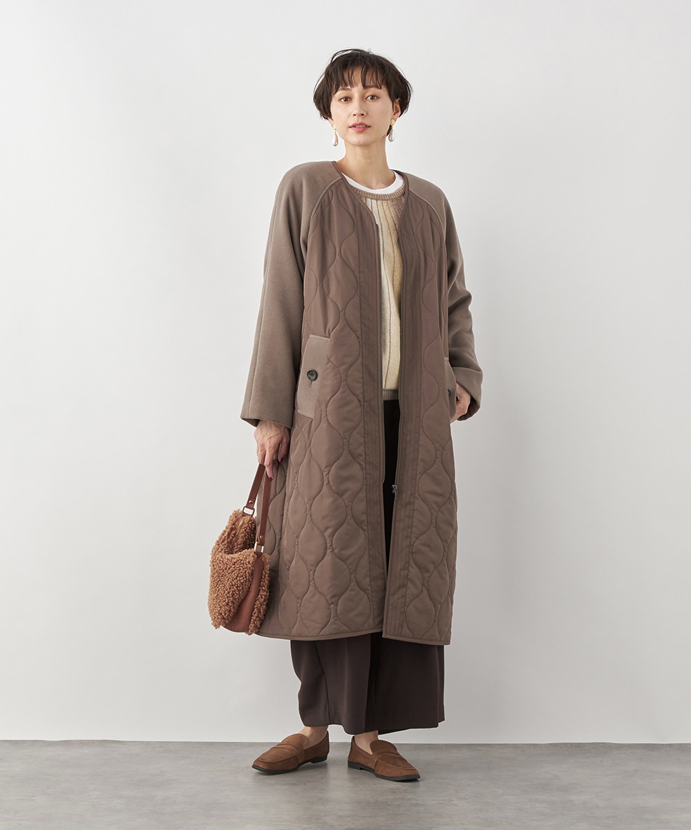 キルティング素材と布帛を組み合わせています。ほどよい分量感の中わたで、軽くて扱いやすいのも魅力です。フロントはスポーティな印象のジップ開きを採用。着丈は長めで重厚感があります。ストールやマフラー、フード付きトップスとの相性が良いノーカラーデザインです。