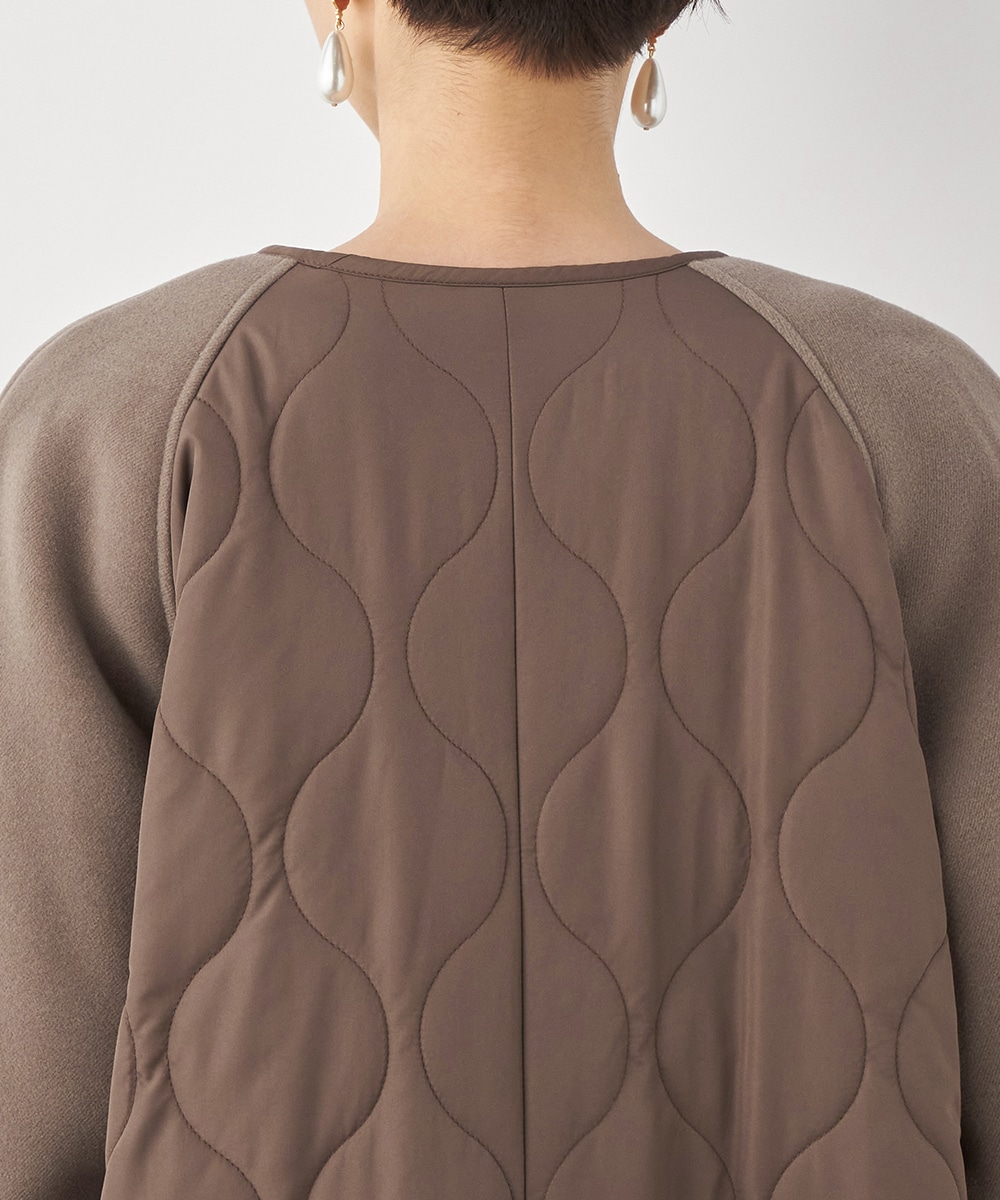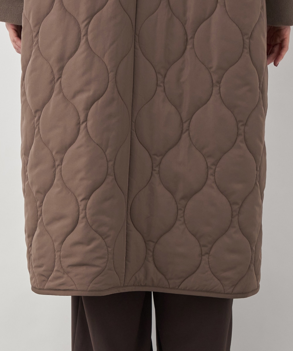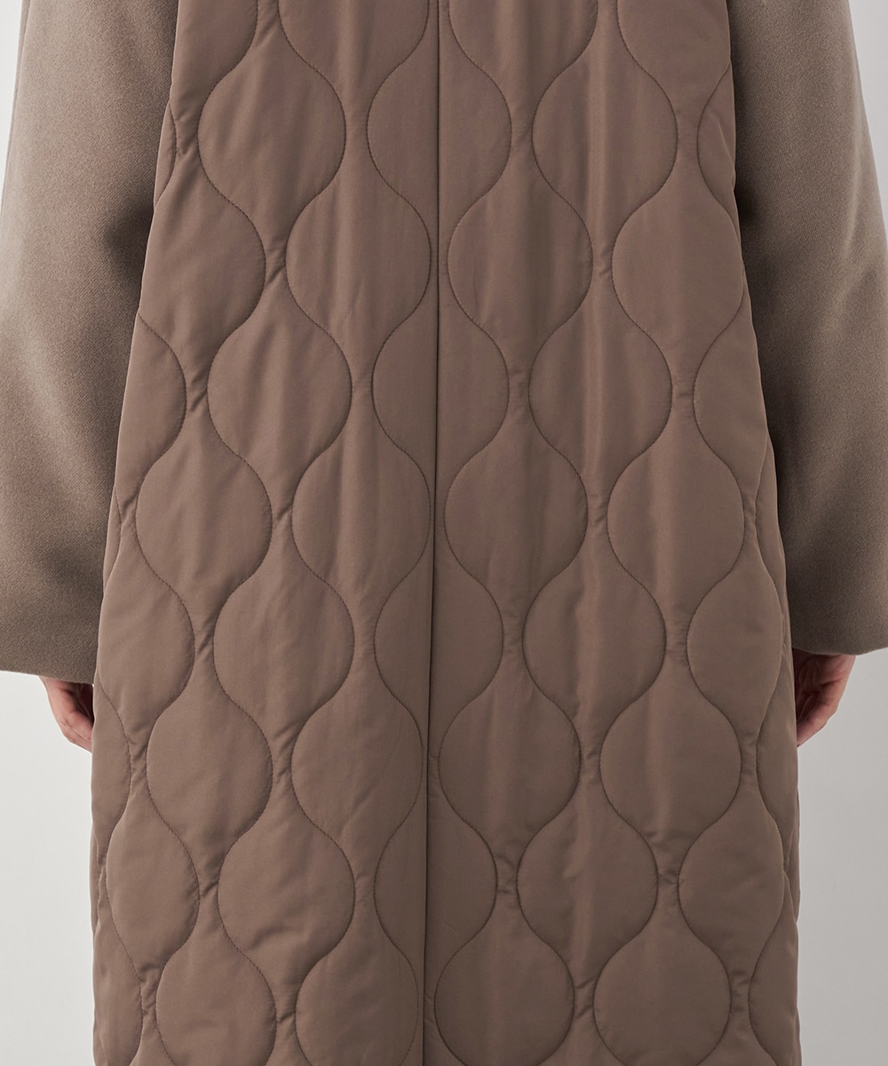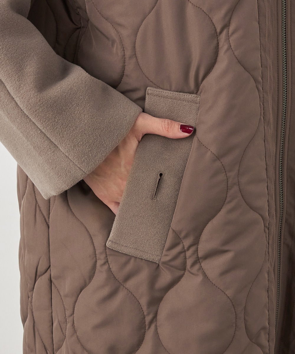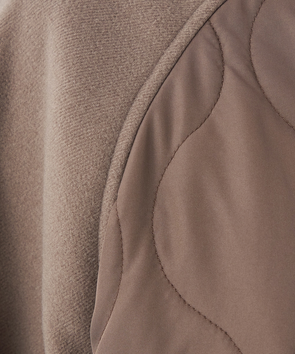 キルティング素材と布帛を組み合わせています。ほどよい分量感の中わたで、軽くて扱いやすいのも魅力です。フロントはスポーティな印象のジップ開きを採用。着丈は長めで重厚感があります。ストールやマフラー、フード付きトップスとの相性が良いノーカラーデザインです。