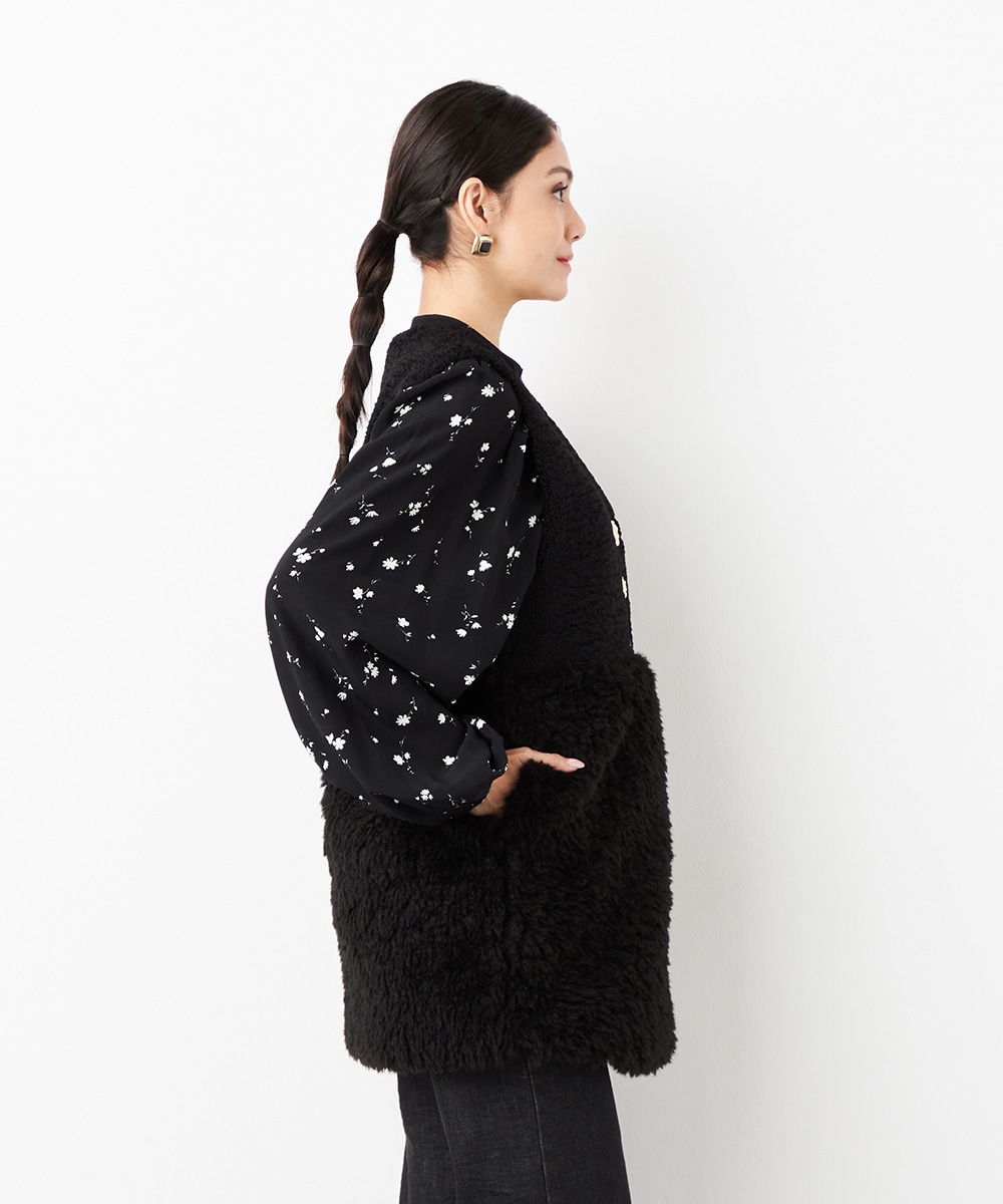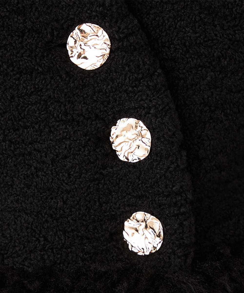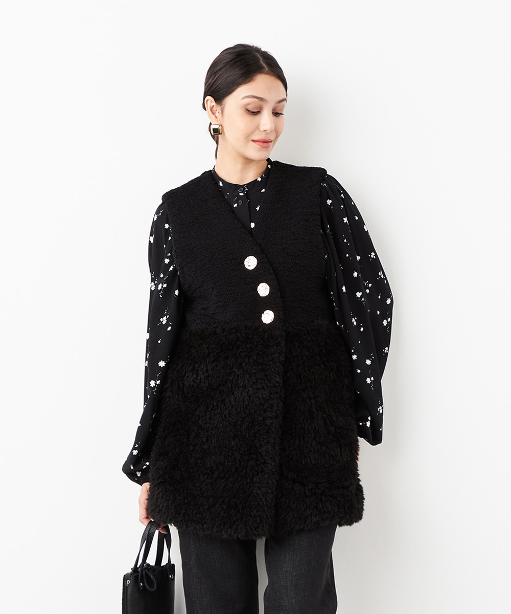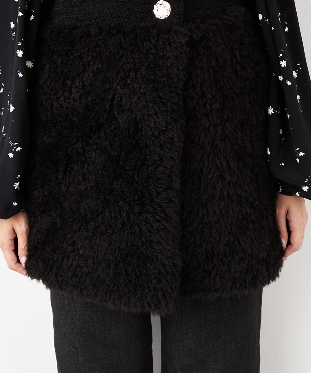 毛足の長さが異なるボア素材を組み合わせています。ウエストより下にボリュームを持たせており、すっきりと着こなせるのもポイント。光沢感のある大きなボタンが華やかなアクセントとして効いています。ワンピースに合わせるのはもちろん、パンツスタイルにもおすすめです。
