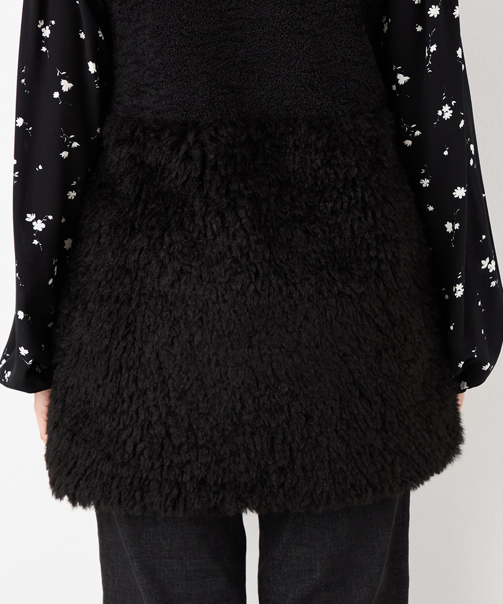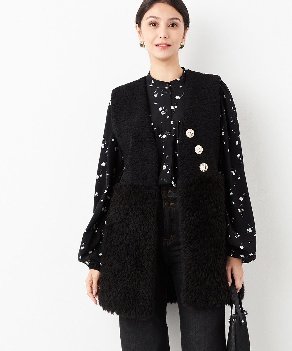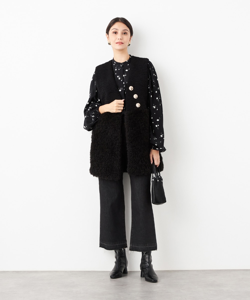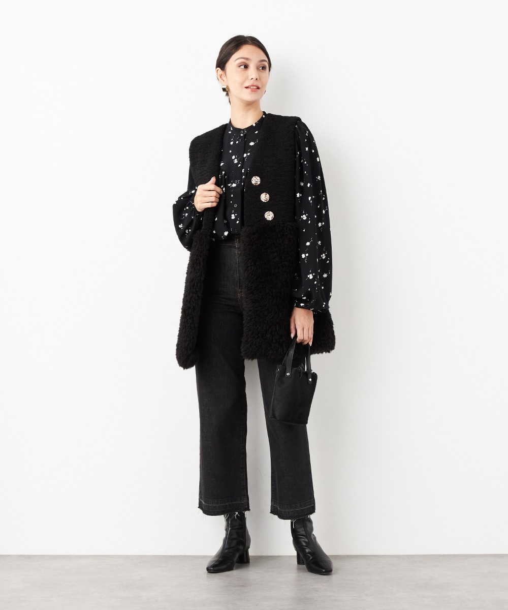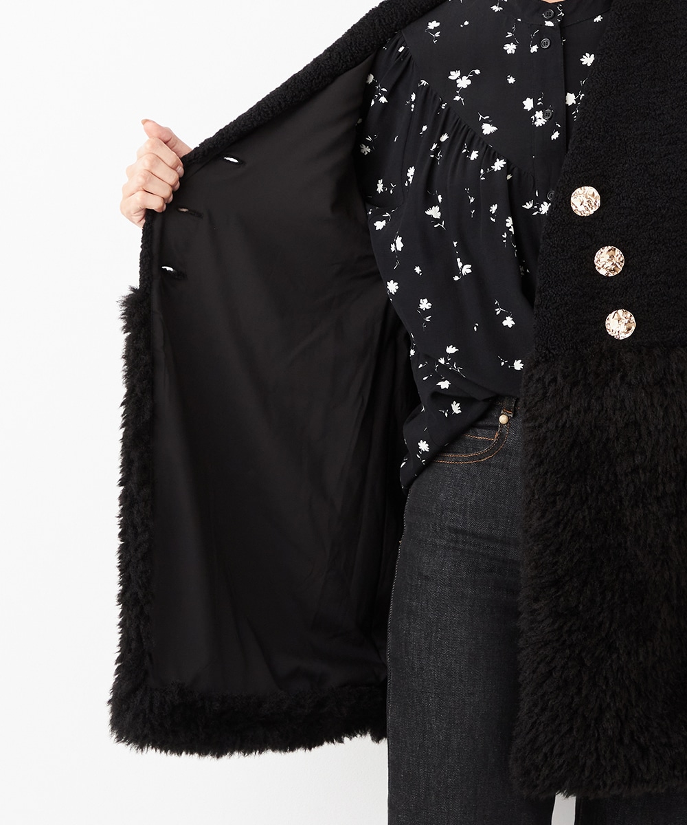 毛足の長さが異なるボア素材を組み合わせています。ウエストより下にボリュームを持たせており、すっきりと着こなせるのもポイント。光沢感のある大きなボタンが華やかなアクセントとして効いています。ワンピースに合わせるのはもちろん、パンツスタイルにもおすすめです。
