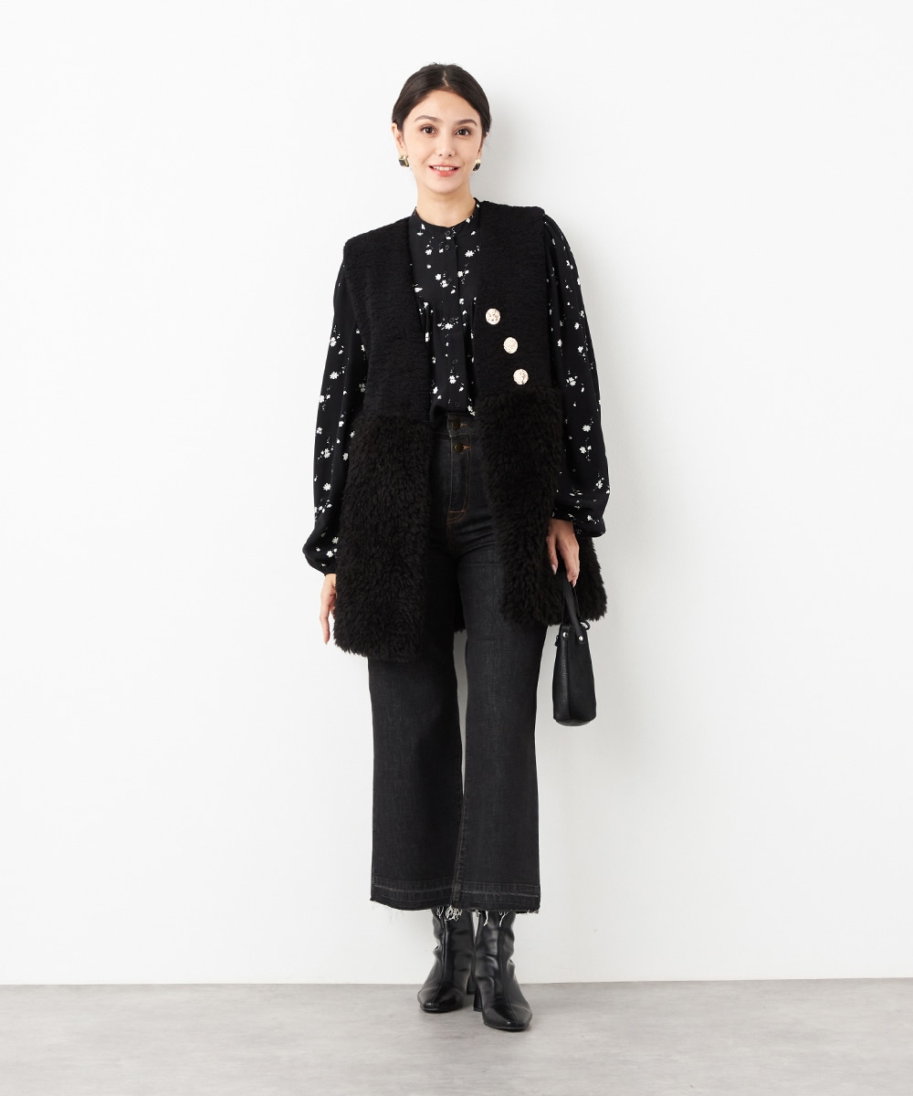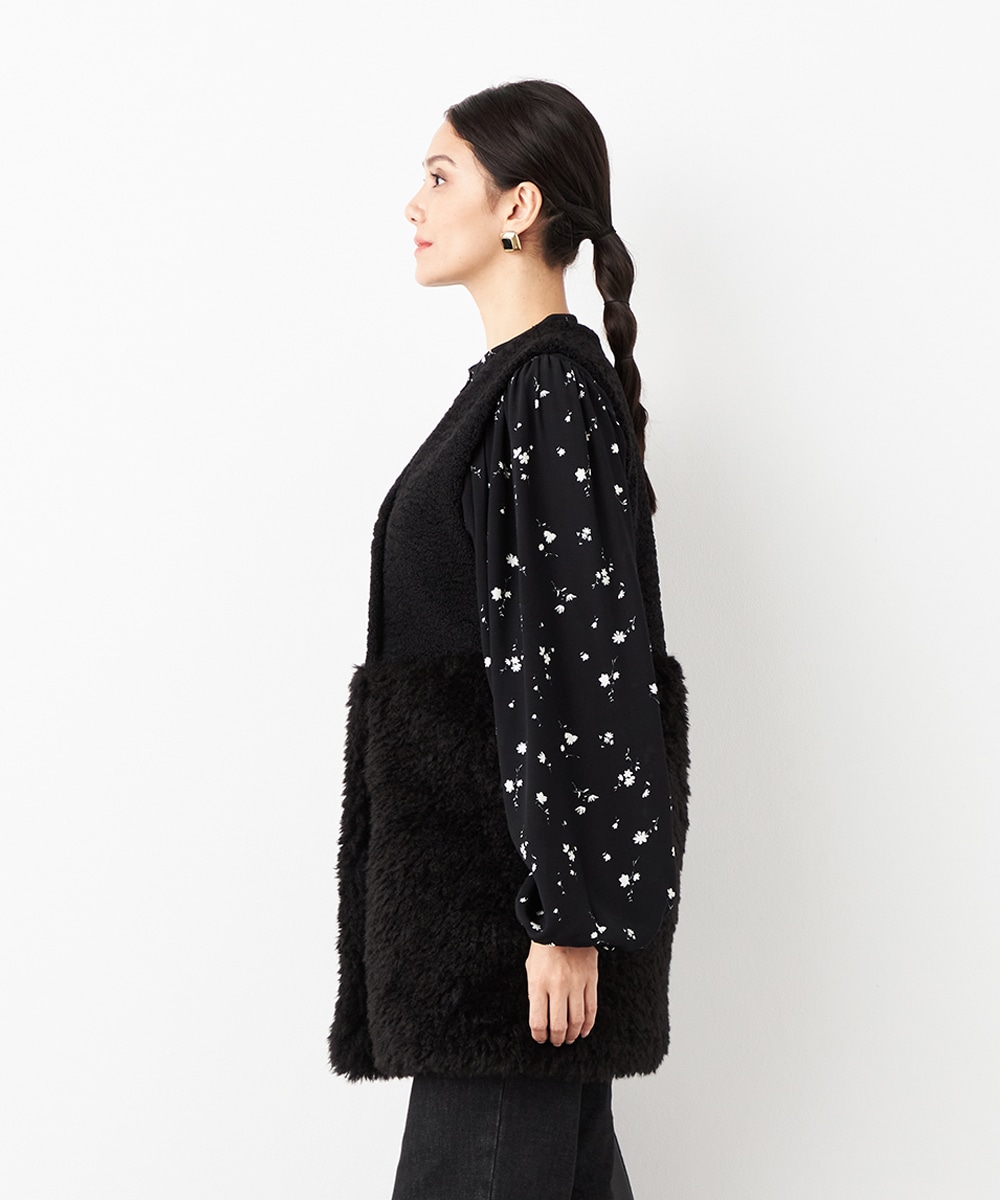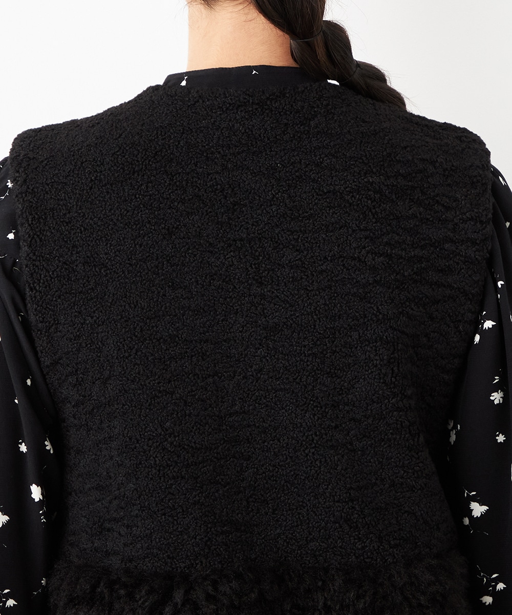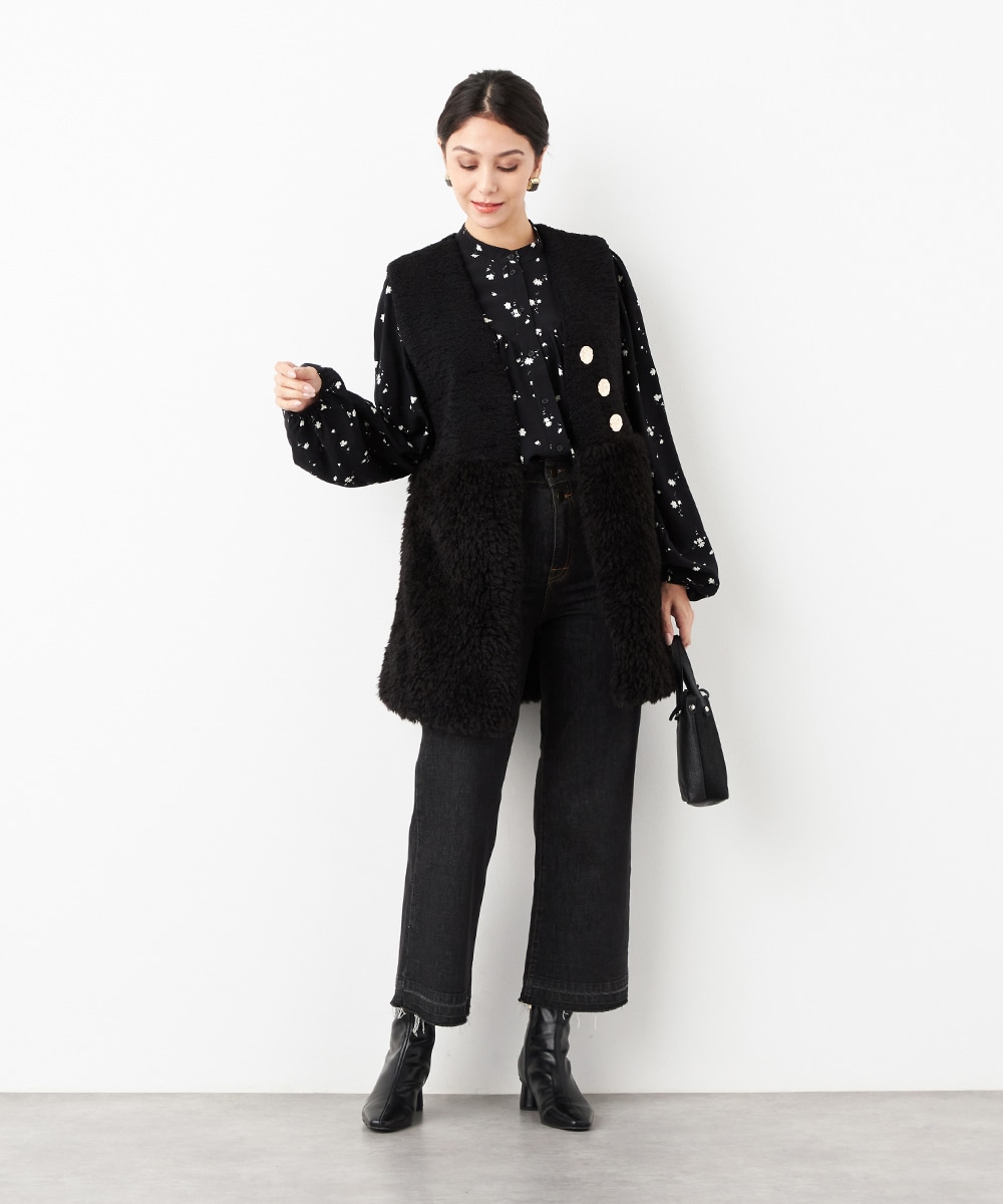 毛足の長さが異なるボア素材を組み合わせています。ウエストより下にボリュームを持たせており、すっきりと着こなせるのもポイント。光沢感のある大きなボタンが華やかなアクセントとして効いています。ワンピースに合わせるのはもちろん、パンツスタイルにもおすすめです。