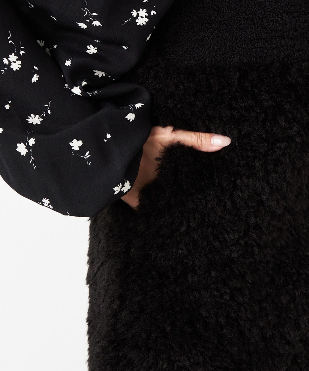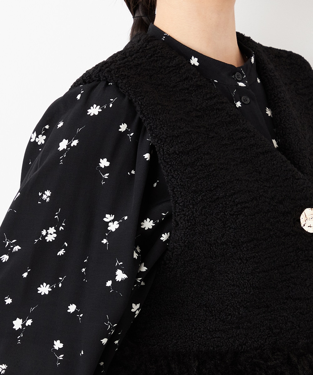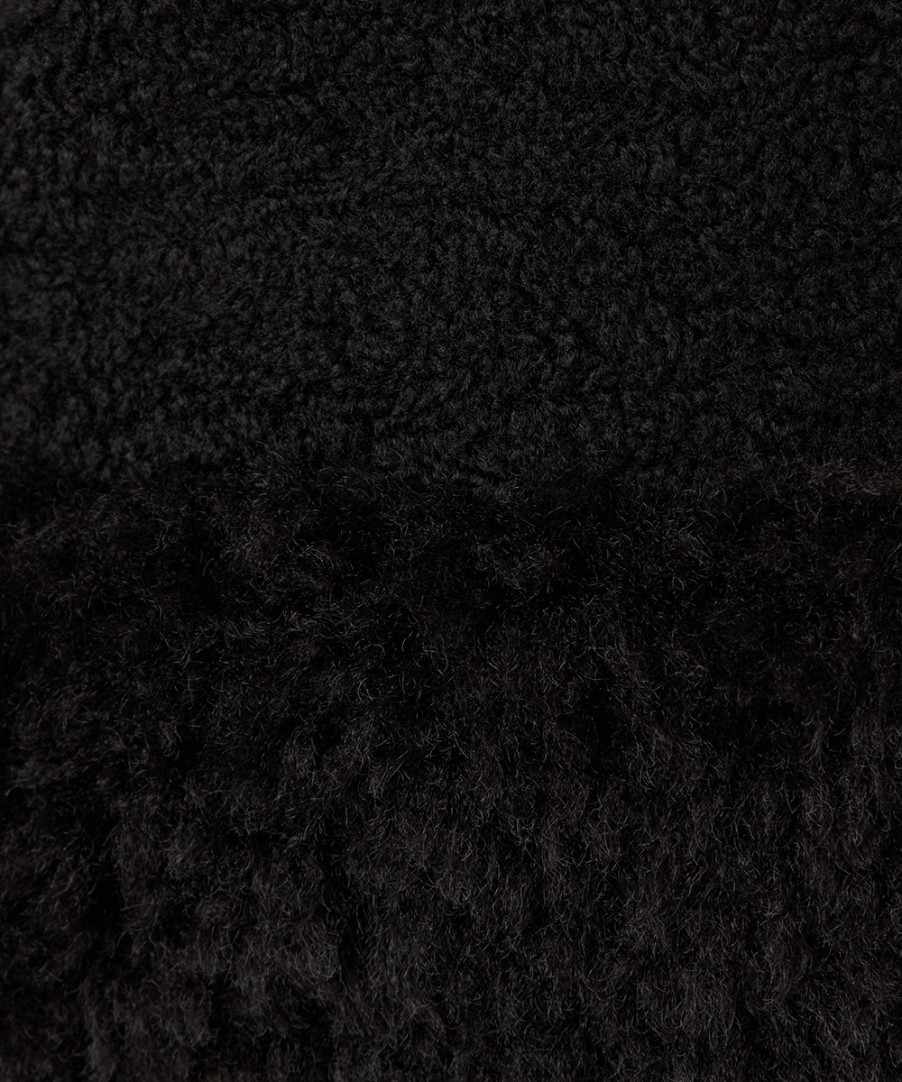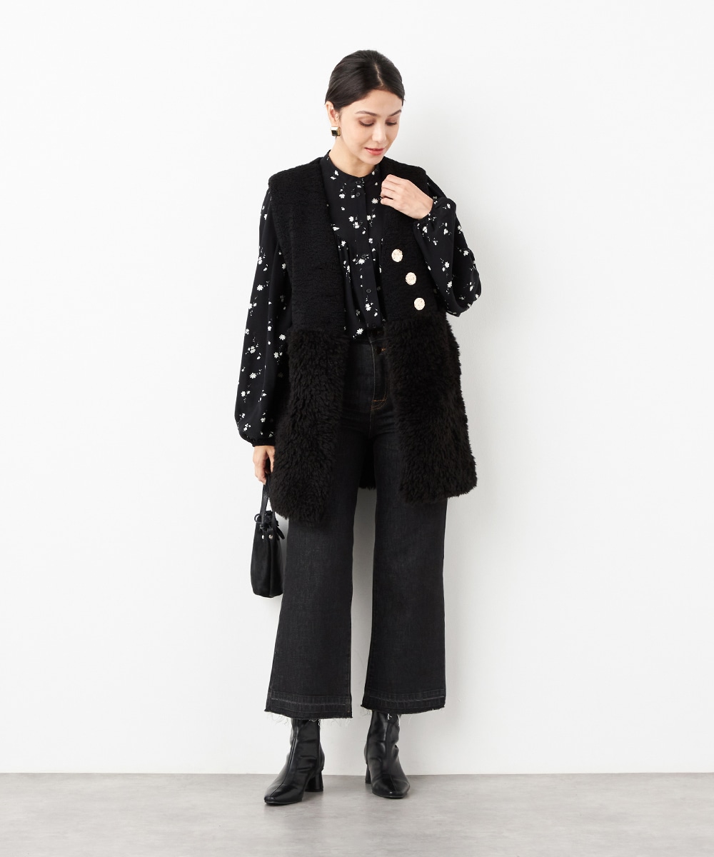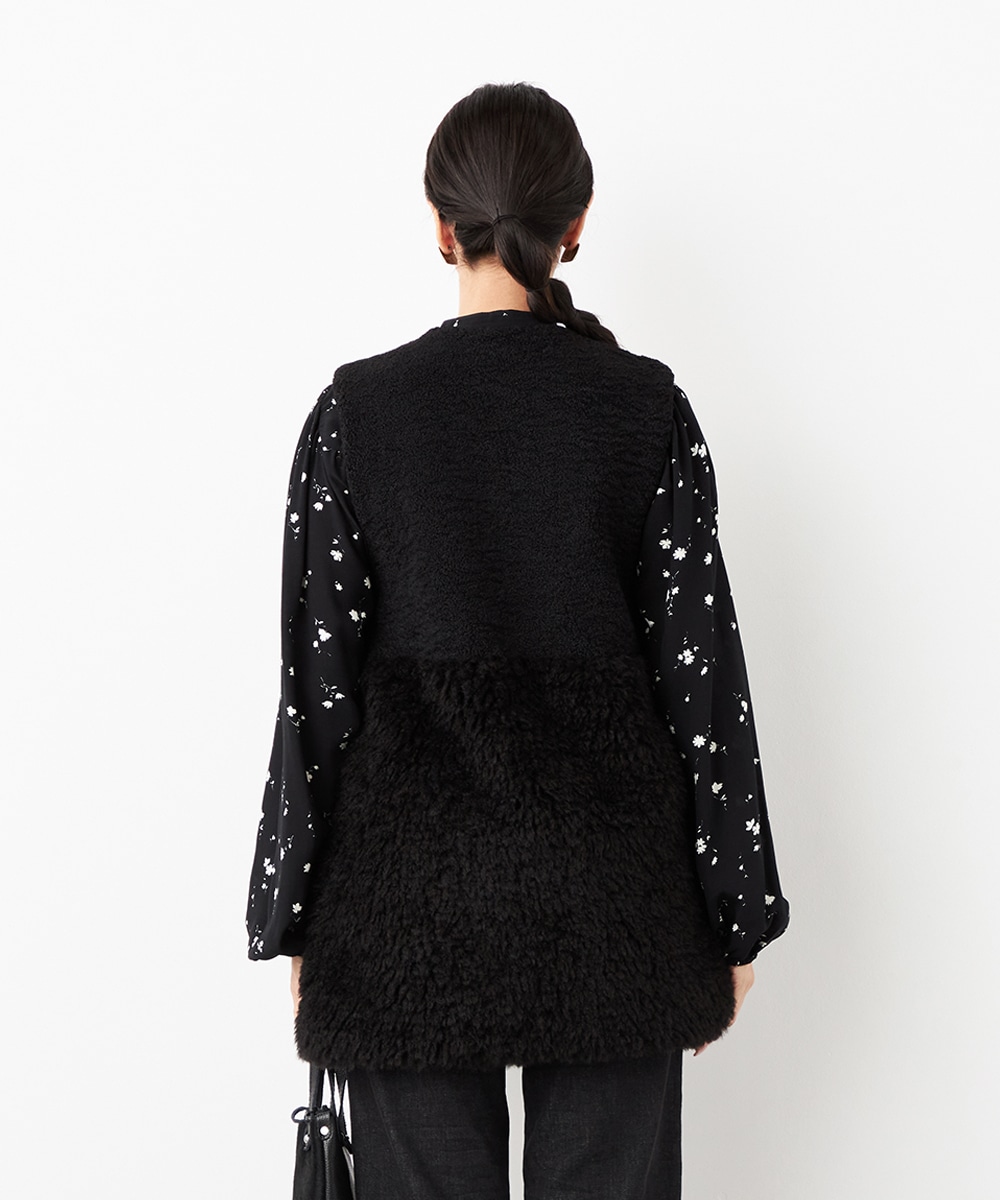 毛足の長さが異なるボア素材を組み合わせています。ウエストより下にボリュームを持たせており、すっきりと着こなせるのもポイント。光沢感のある大きなボタンが華やかなアクセントとして効いています。ワンピースに合わせるのはもちろん、パンツスタイルにもおすすめです。