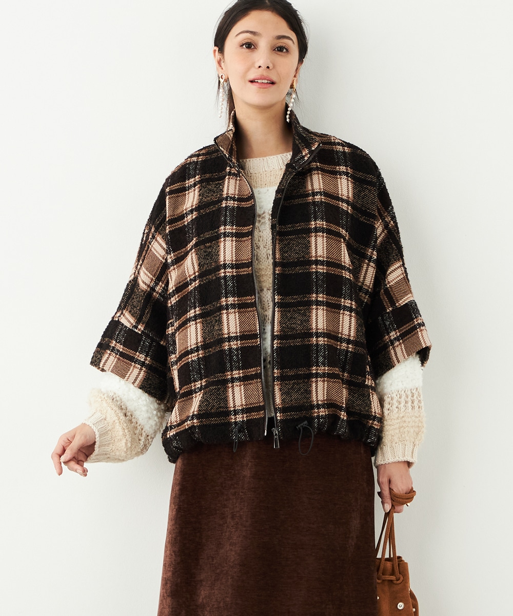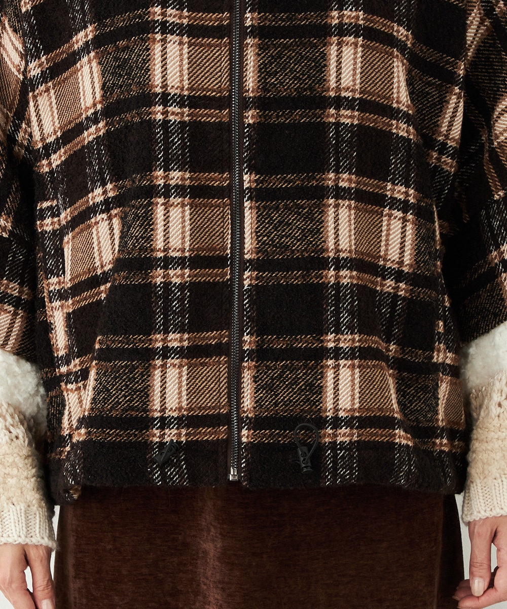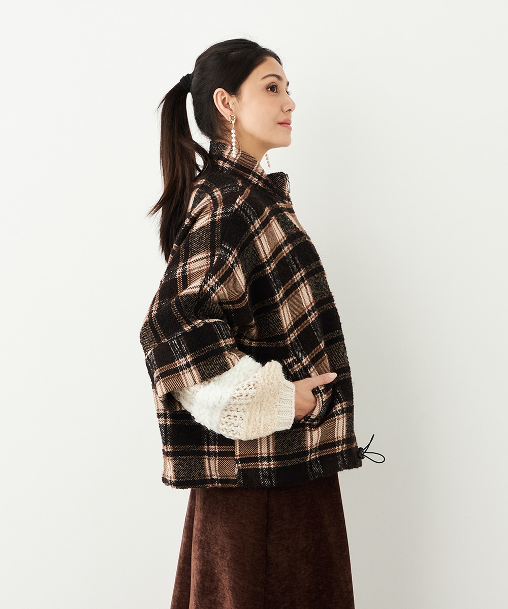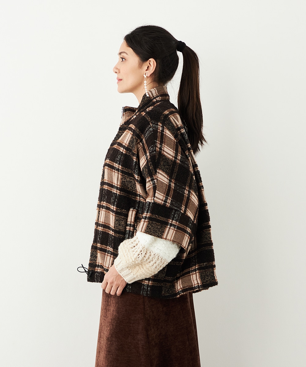 トラディショナルに着こなせるチェック柄を、トレンドの配色でデザインしました。ゆる感のあるシルエットとショート丈のバランスにもこだわっています。七分袖ならではの軽やかな印象も魅力です。裾はストッパー付きのコードがあしらわれ、フィット感を自在に調整できます。
