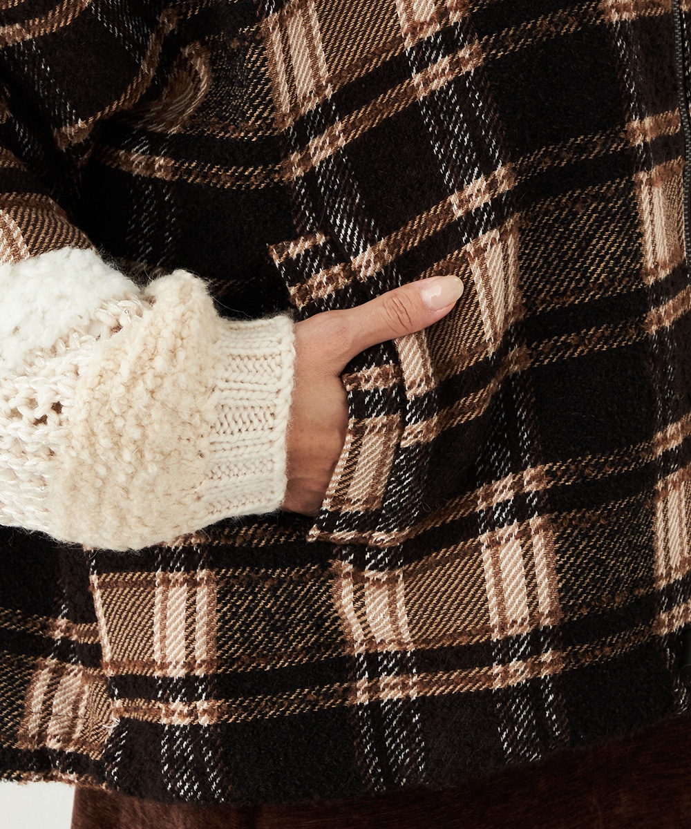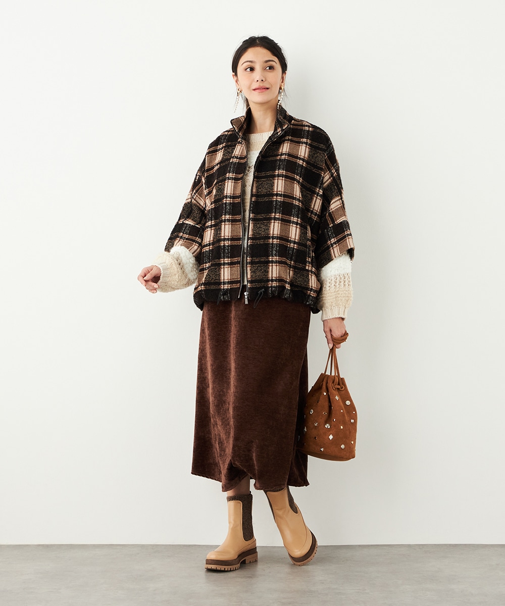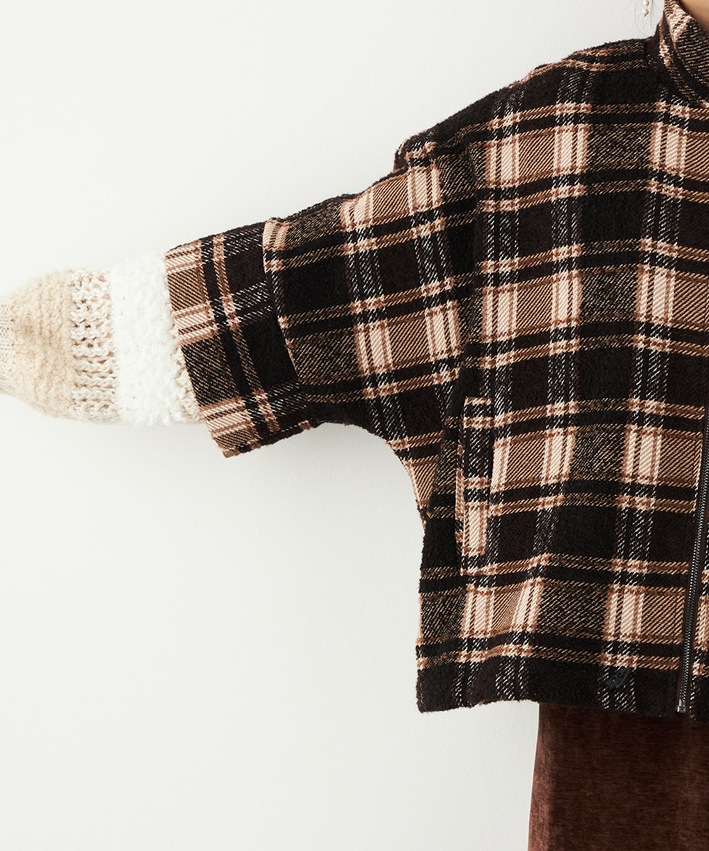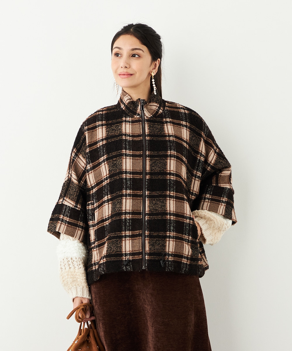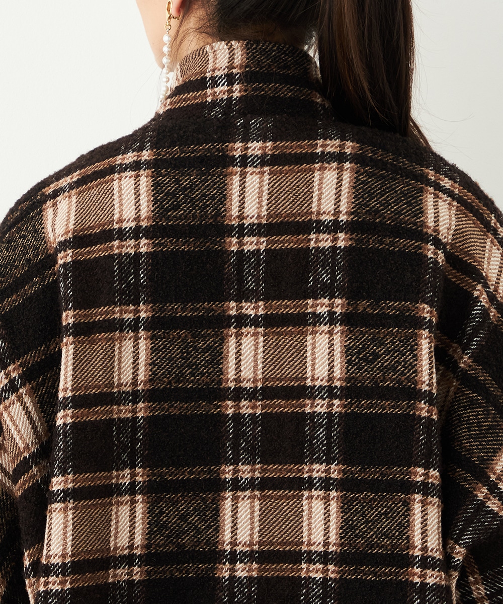 トラディショナルに着こなせるチェック柄を、トレンドの配色でデザインしました。ゆる感のあるシルエットとショート丈のバランスにもこだわっています。七分袖ならではの軽やかな印象も魅力です。裾はストッパー付きのコードがあしらわれ、フィット感を自在に調整できます。