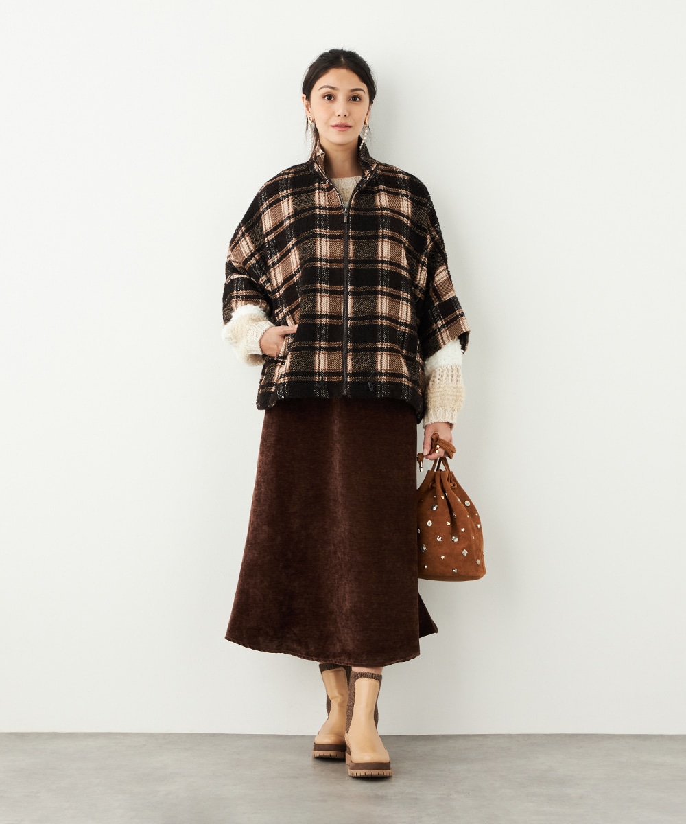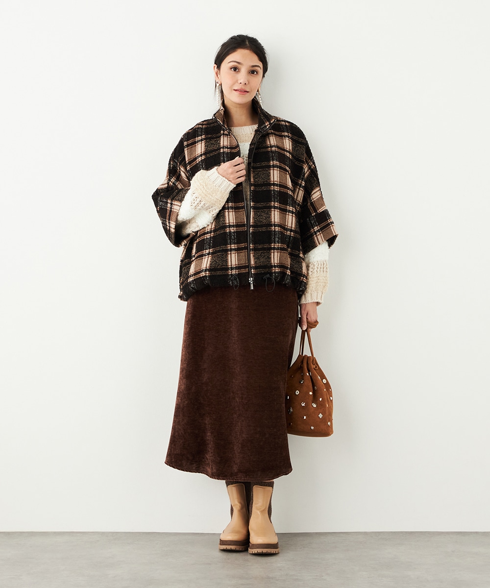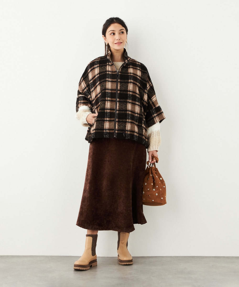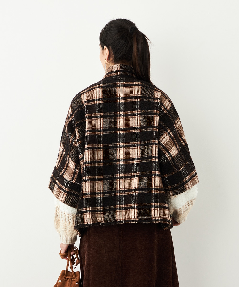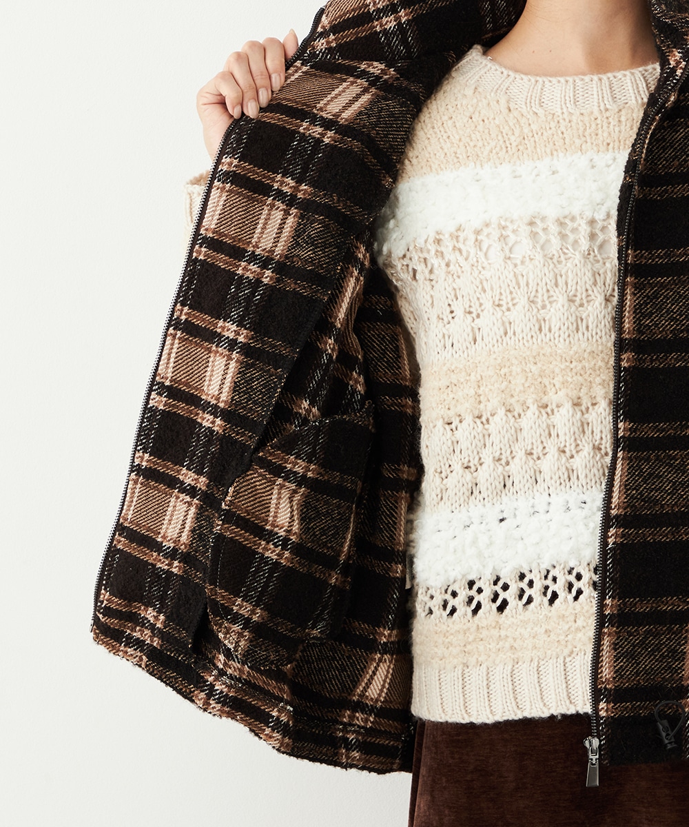 トラディショナルに着こなせるチェック柄を、トレンドの配色でデザインしました。ゆる感のあるシルエットとショート丈のバランスにもこだわっています。七分袖ならではの軽やかな印象も魅力です。裾はストッパー付きのコードがあしらわれ、フィット感を自在に調整できます。