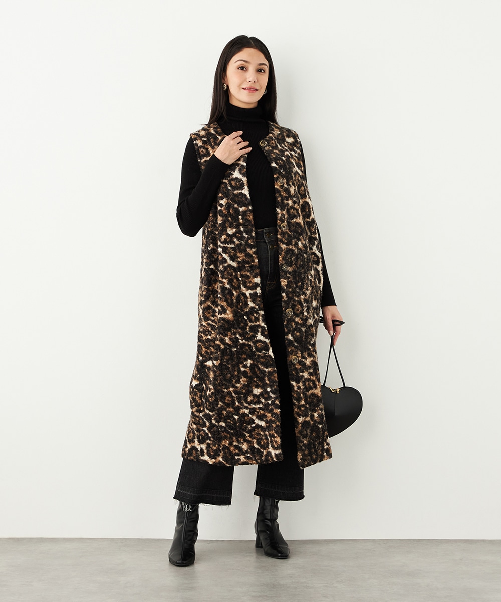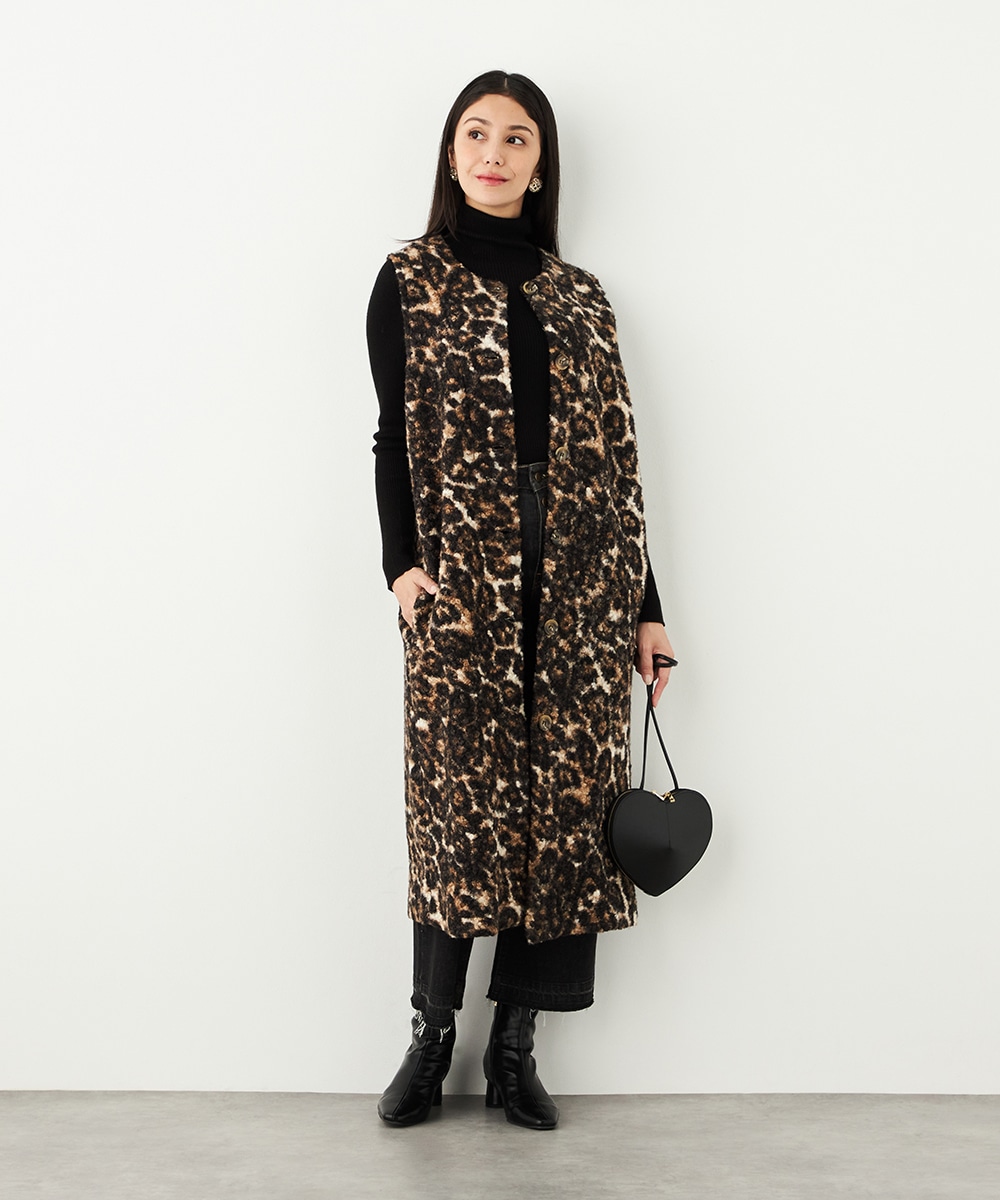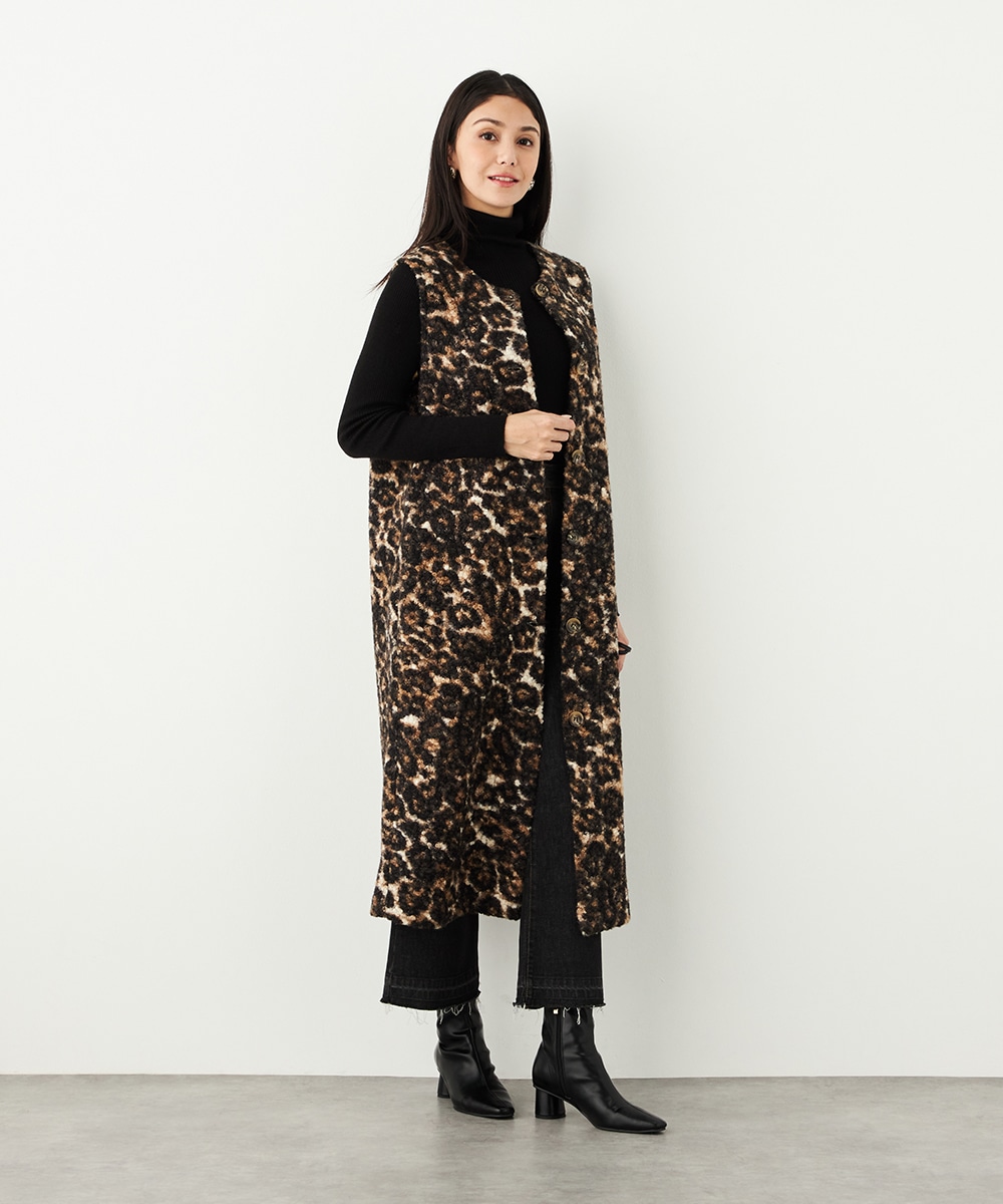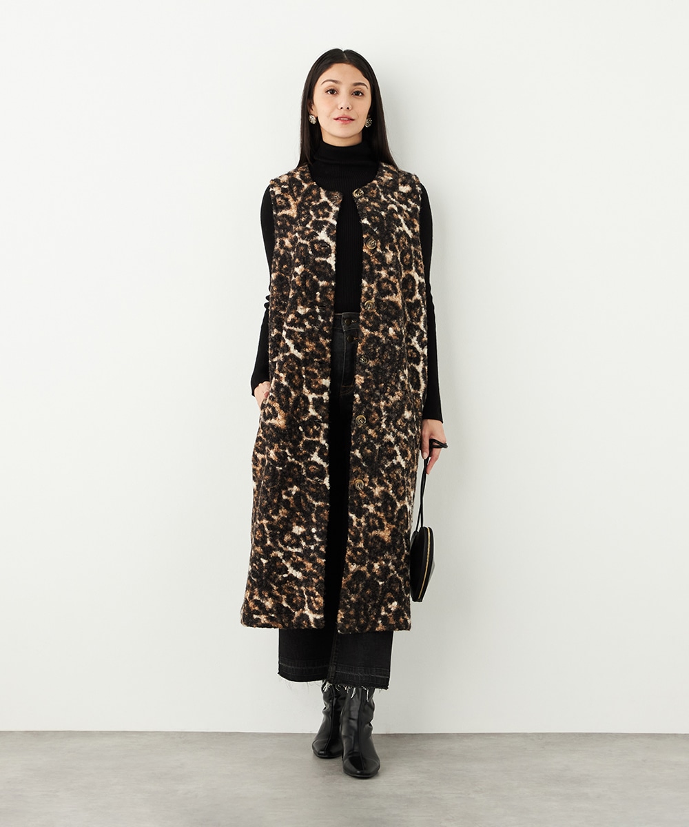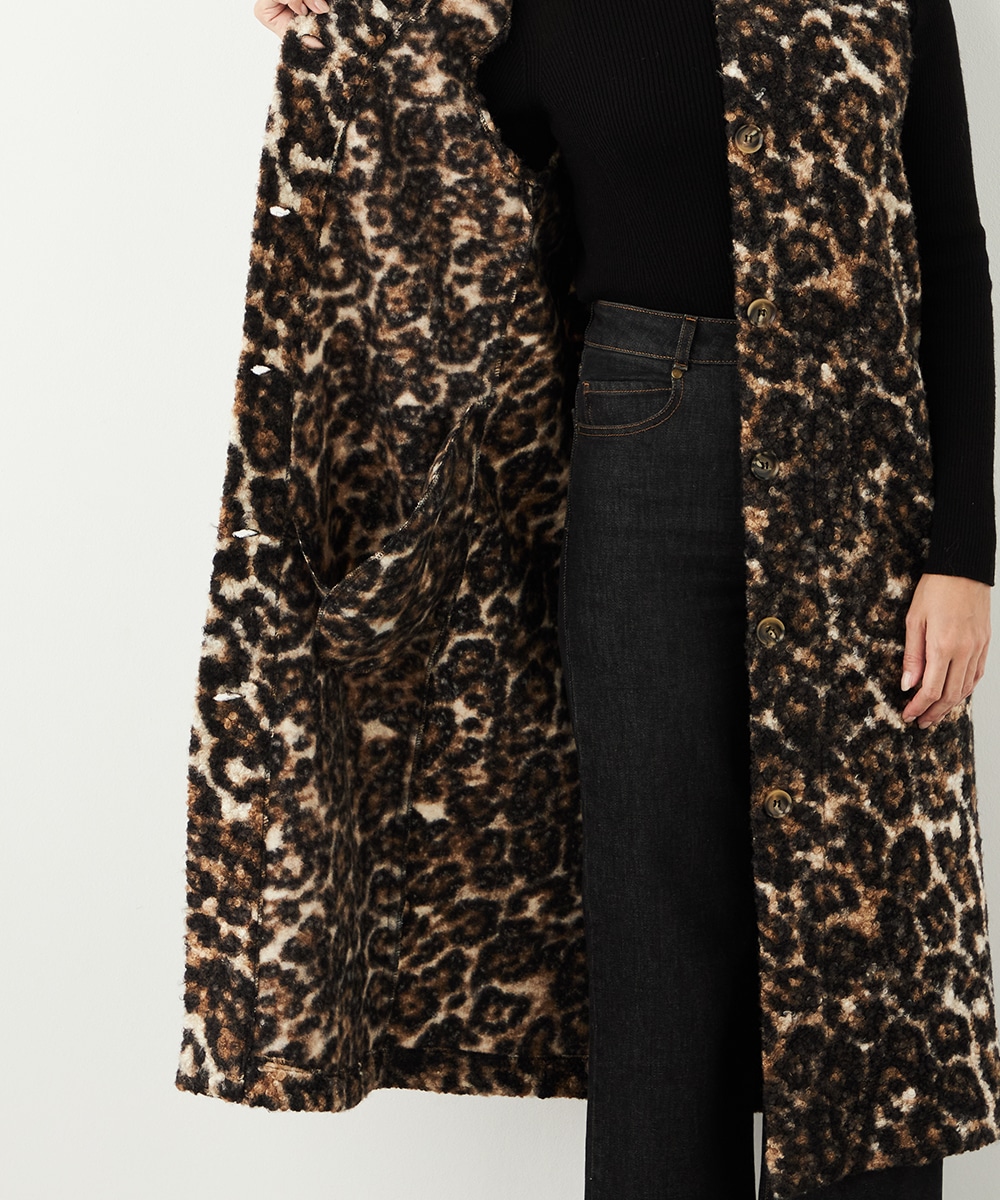インパクト十分の柄とロング丈のボリュームがコーディネートの主役にぴったりです。裏地は省き、ソフトな風合いを生かしています。表情には暖かみも感じられて、秋冬シーズンらしさの演出にもおすすめのアイテム。フロントボタンを留めてジャンパースカート風に着こなしても素敵です。