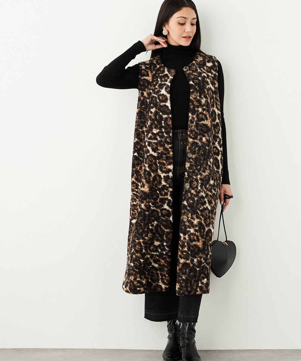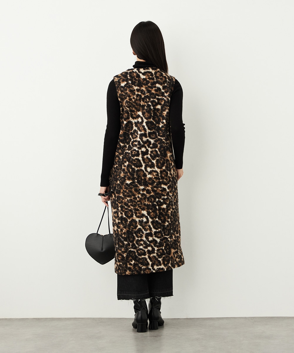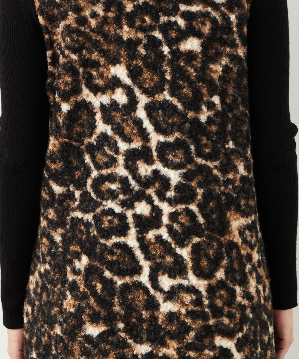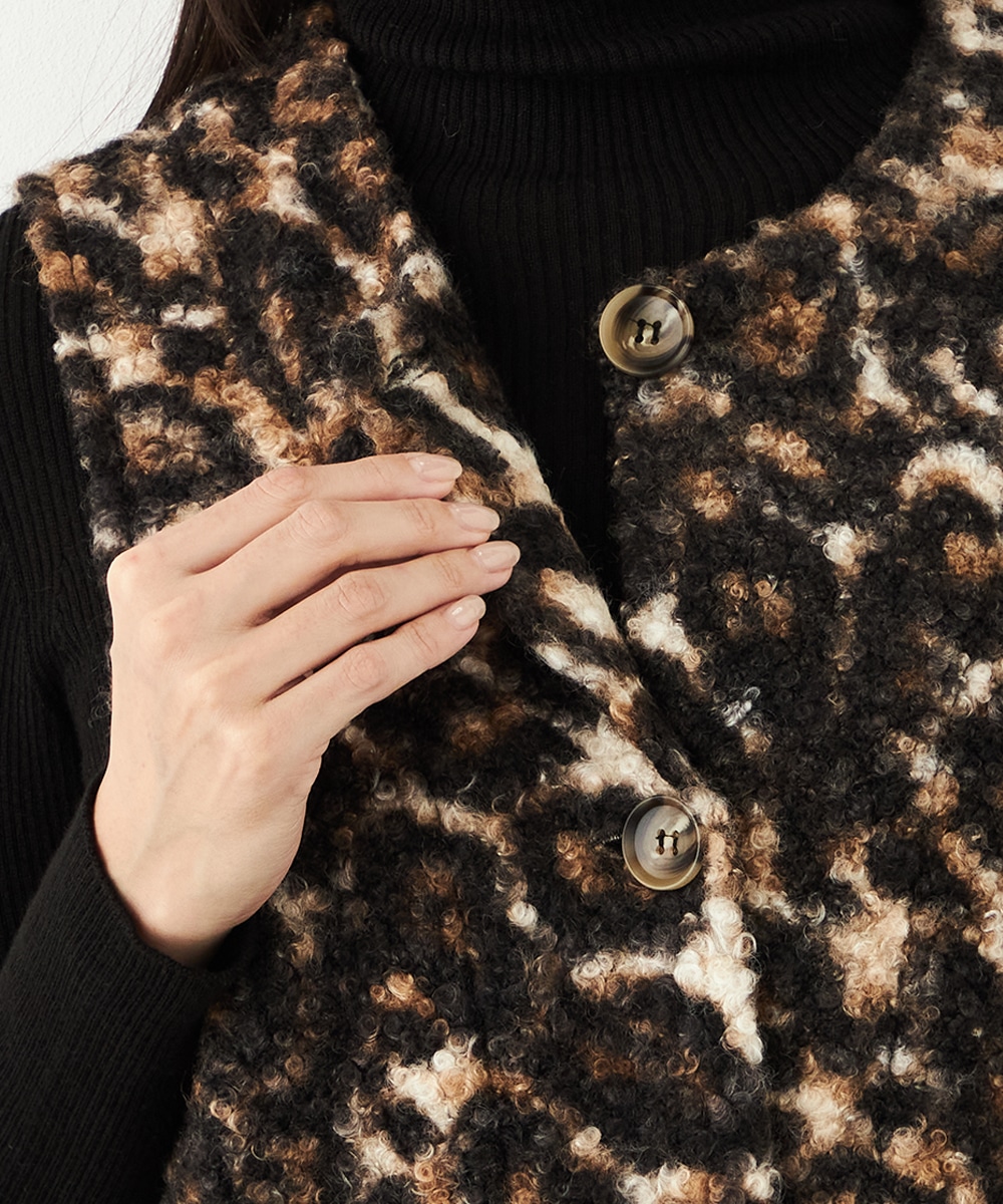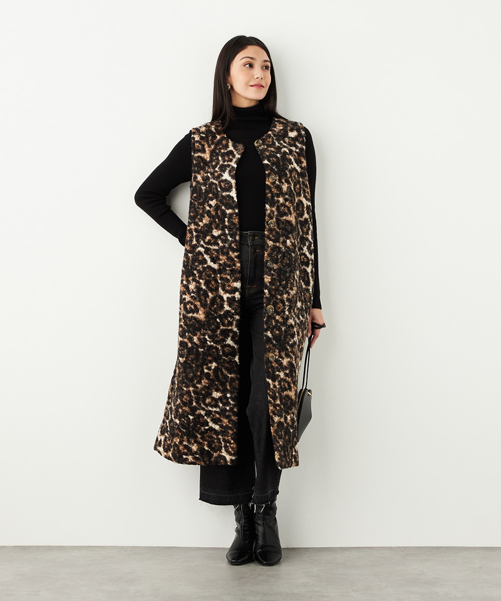 インパクト十分の柄とロング丈のボリュームがコーディネートの主役にぴったりです。裏地は省き、ソフトな風合いを生かしています。表情には暖かみも感じられて、秋冬シーズンらしさの演出にもおすすめのアイテム。フロントボタンを留めてジャンパースカート風に着こなしても素敵です。