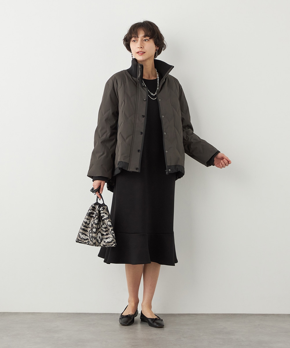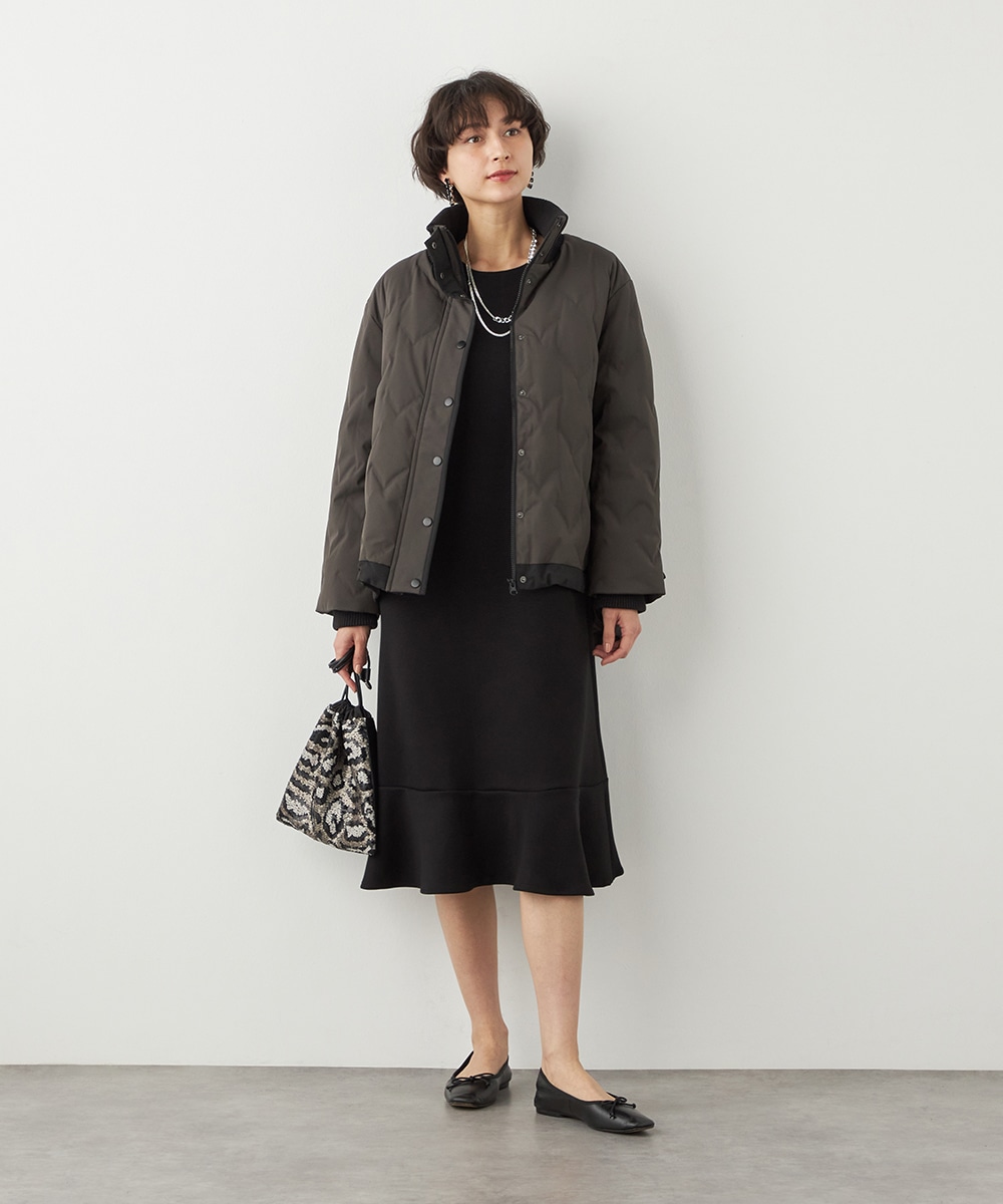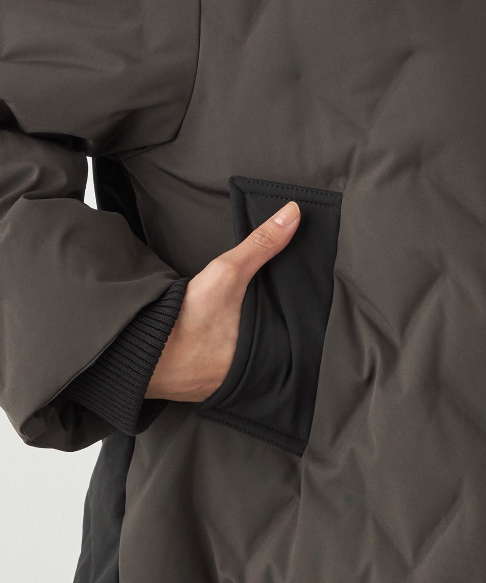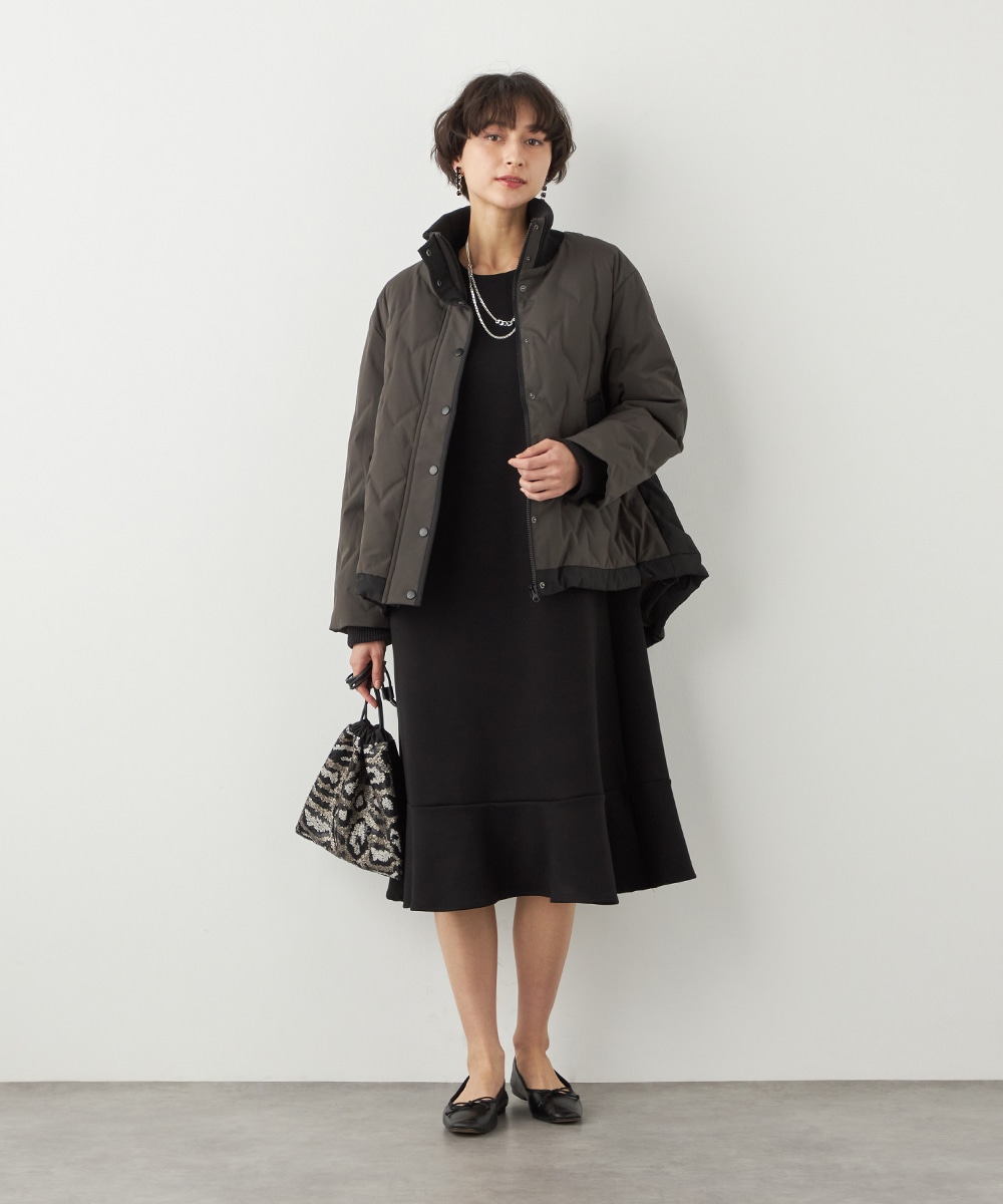 ダウン90%の高い混率で、しっかりとした暖かさのある着心地です。スタンドカラーや袖口のリブ使いなど、冷えやすい部分を外気からカバーするように工夫をしています。バックのフレアシルエットがひと味違った雰囲気のポイント。裾のコードの絞り具合でアレンジも楽しめます。