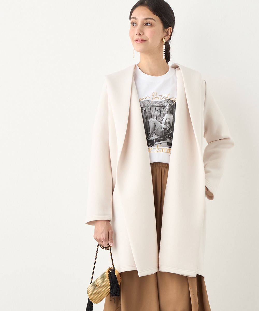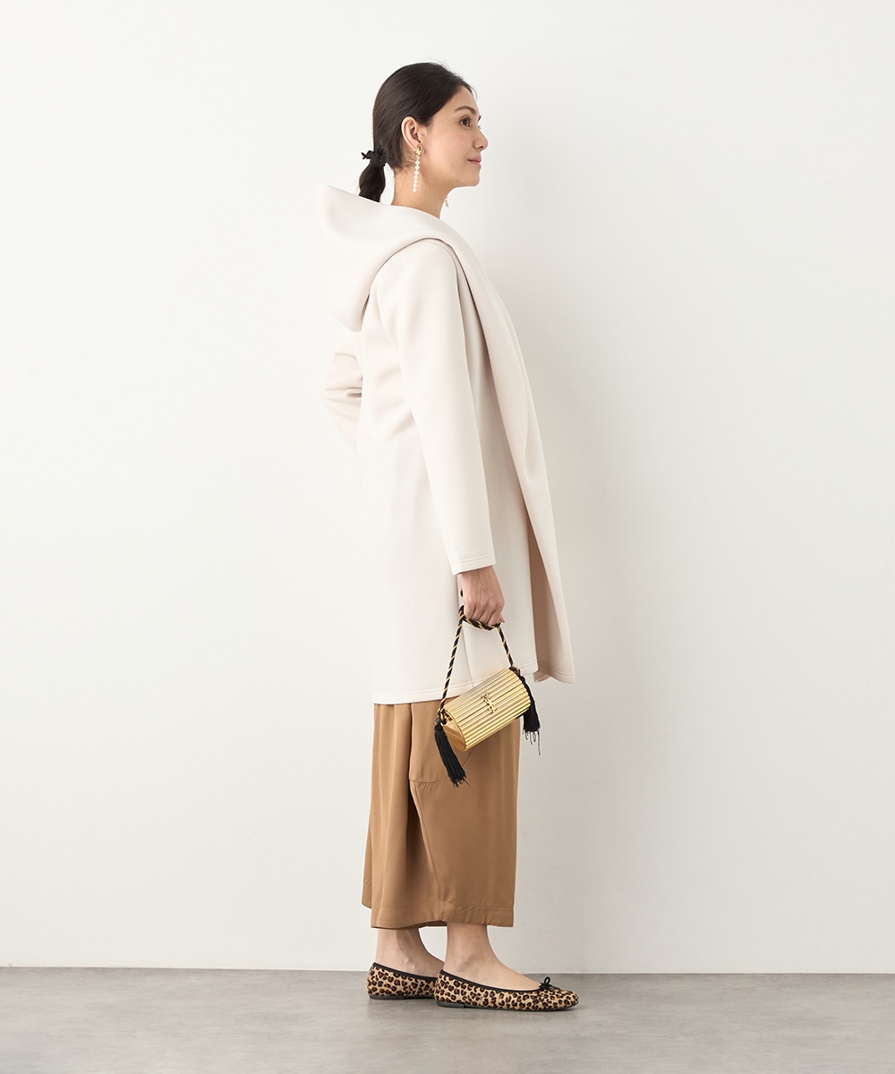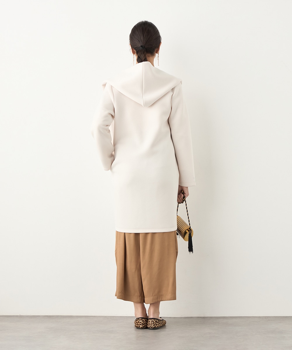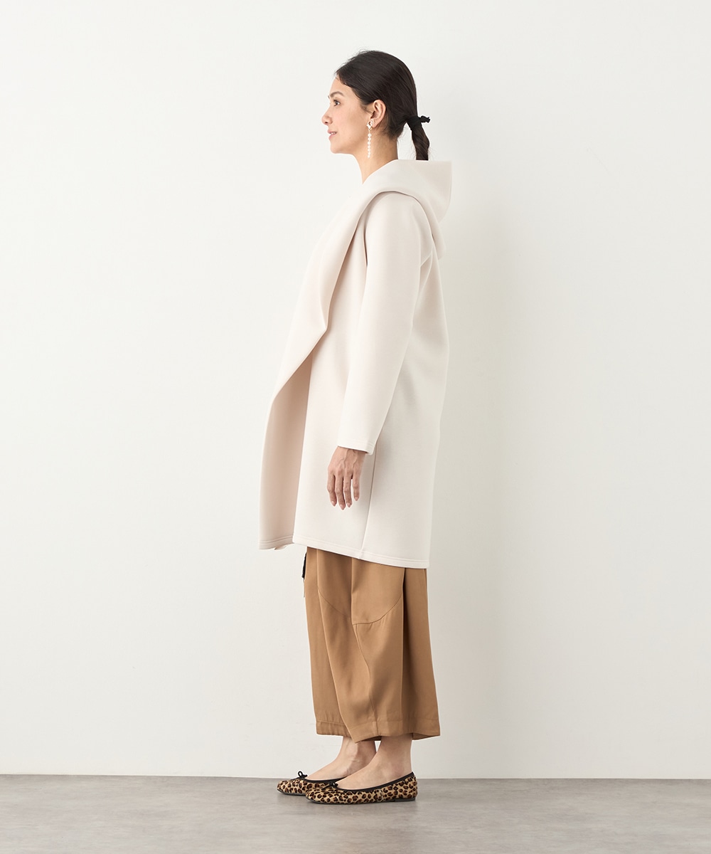 軽やかな印象のノーボタンのデザイン。普段使いにも適したフード付きコート。