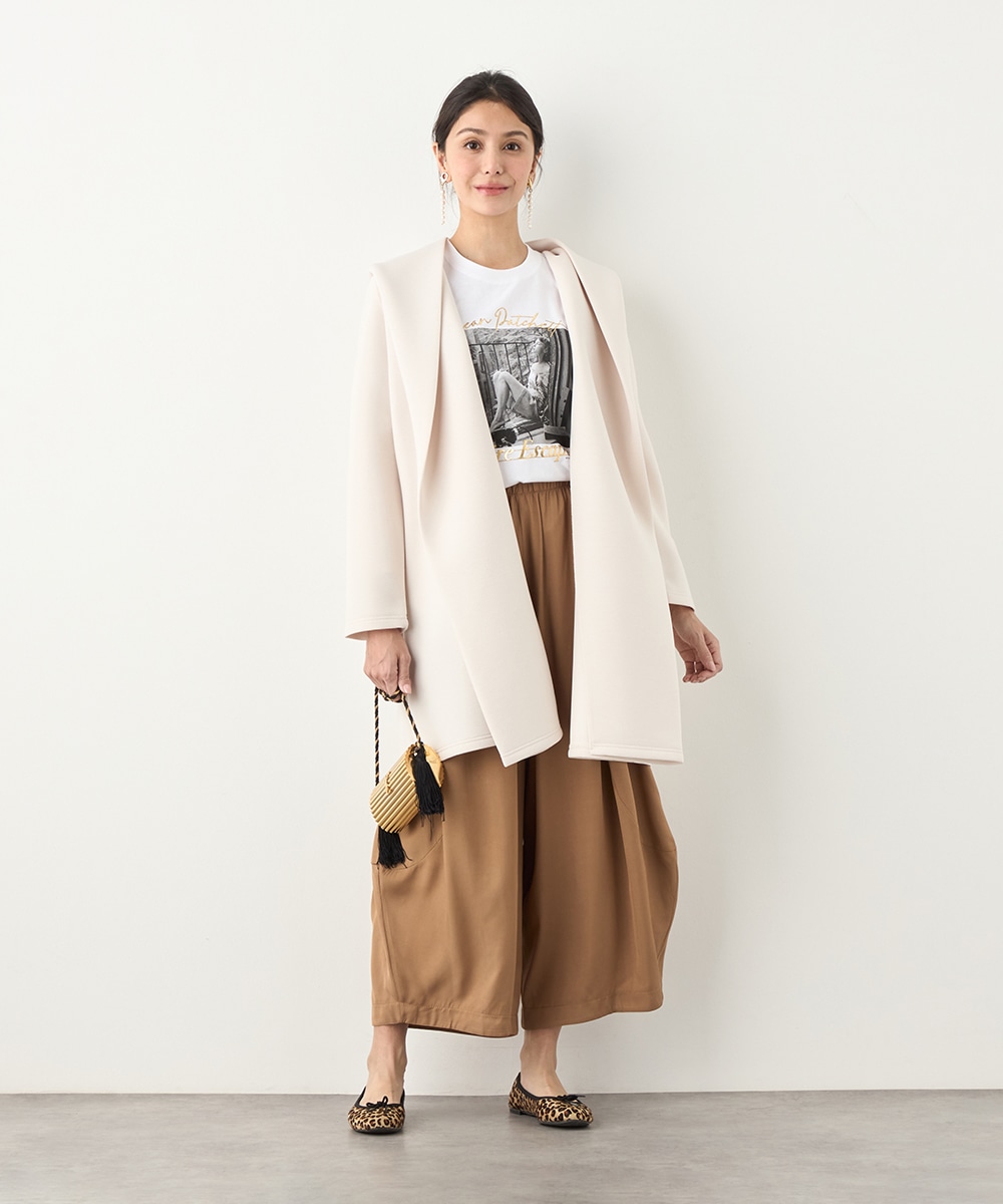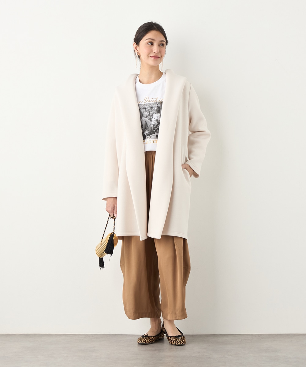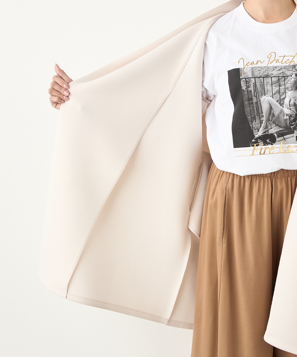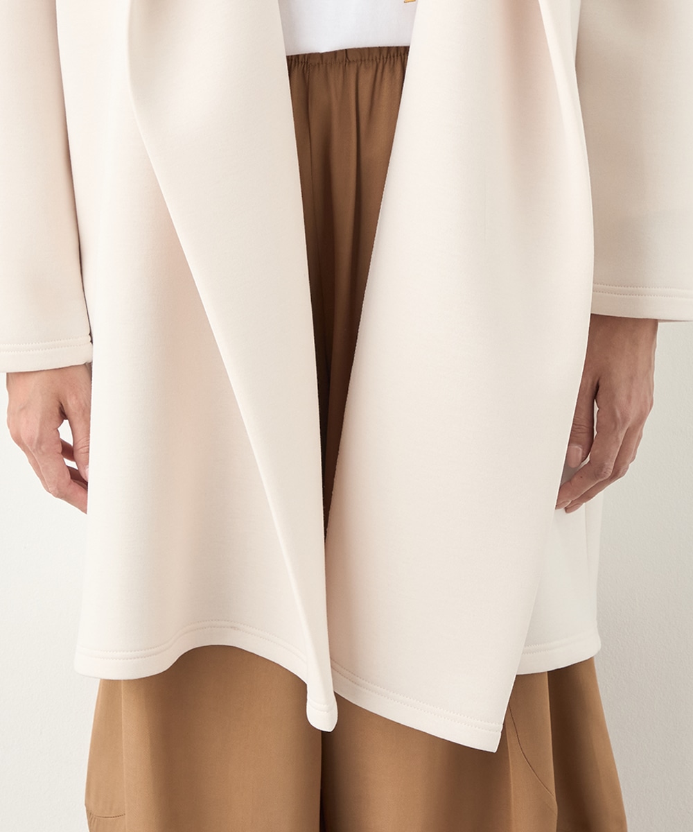 風合いがしなやかなダンボール素材を使用しており、フロントのドレープ感がきれいに現れます。シンプルながらも、羽織るだけでエレガントにまとまるアイテム。長すぎない着丈で取り入れやすく、幅広く活用できます。サイドポケットは切り替えに沿ってすっきりとまとめました。