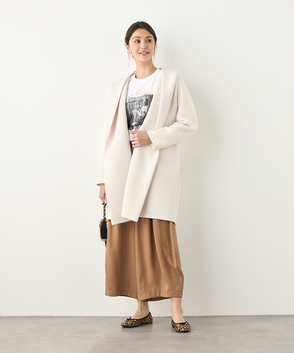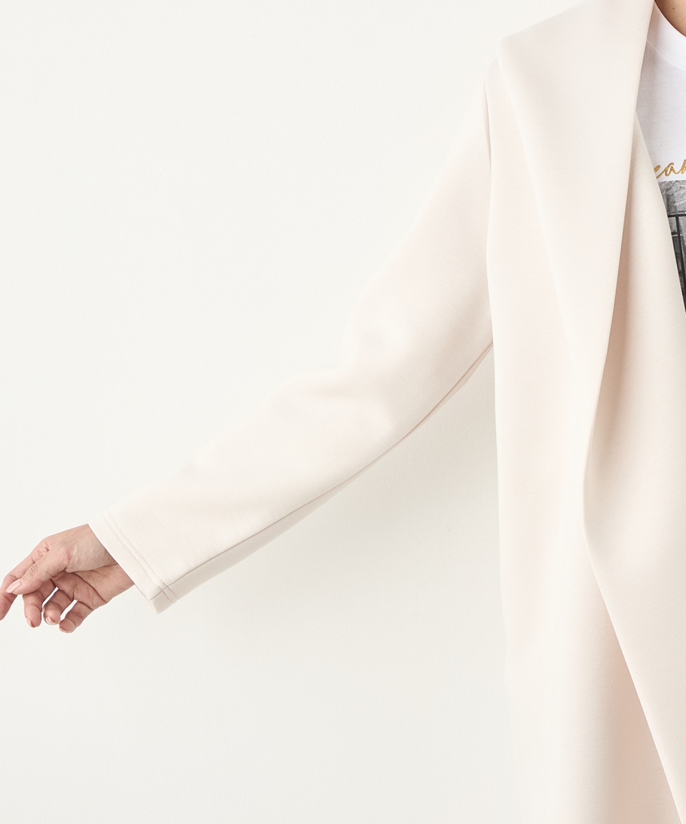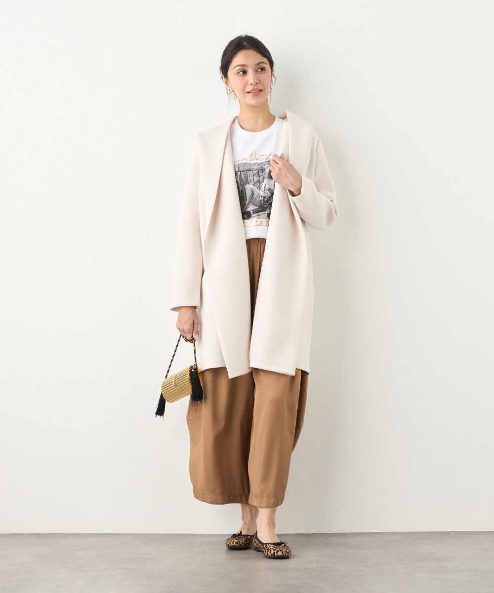 風合いがしなやかなダンボール素材を使用しており、フロントのドレープ感がきれいに現れます。シンプルながらも、羽織るだけでエレガントにまとまるアイテム。長すぎない着丈で取り入れやすく、幅広く活用できます。サイドポケットは切り替えに沿ってすっきりとまとめました。