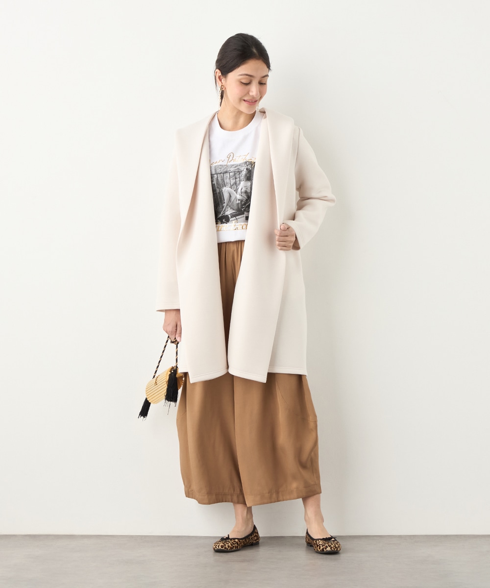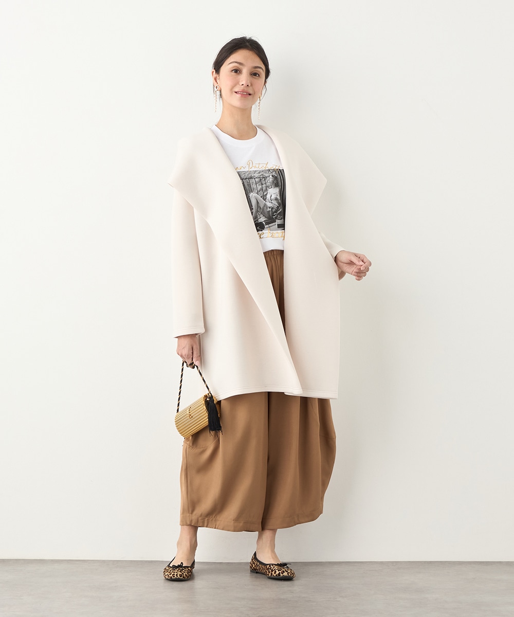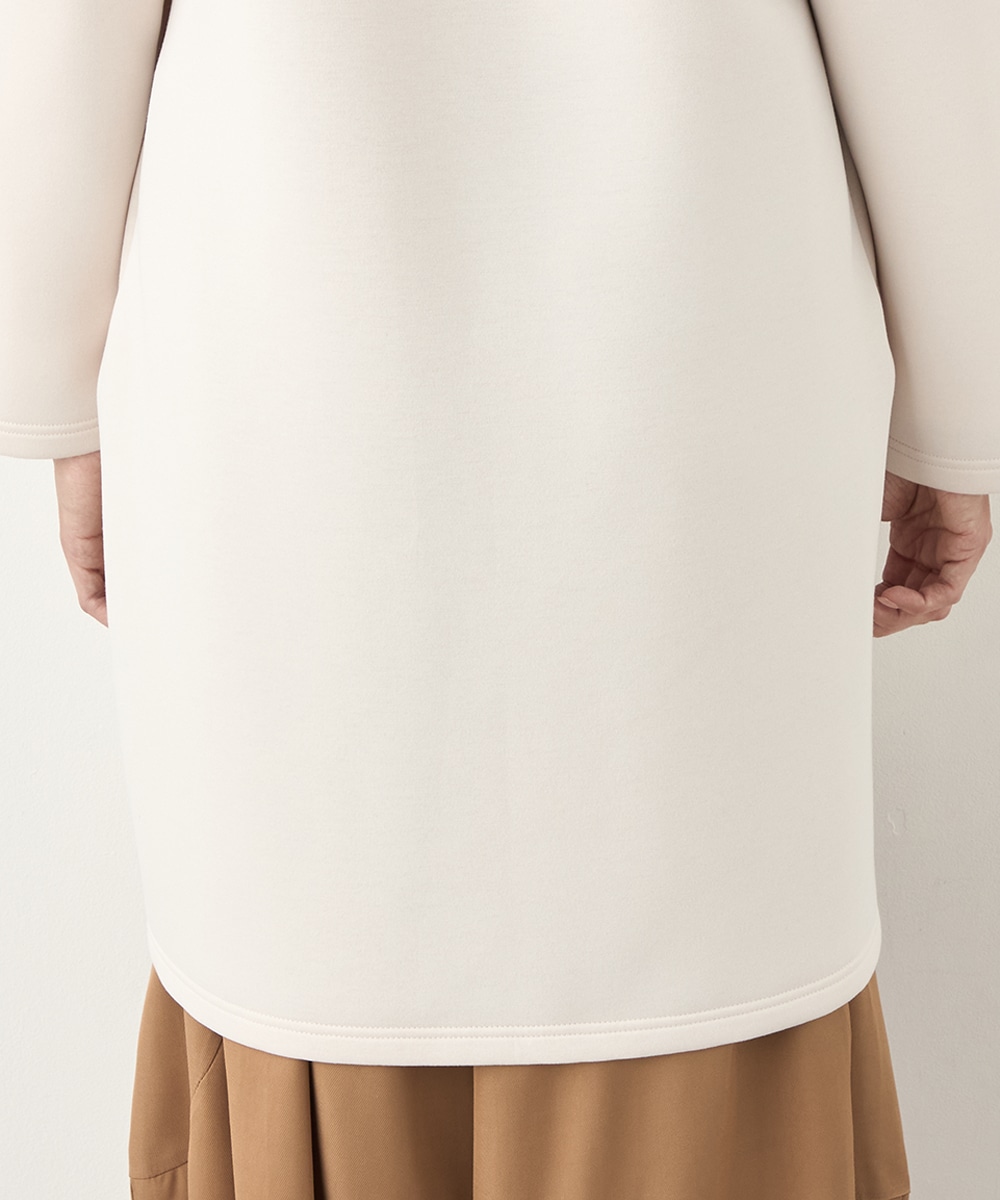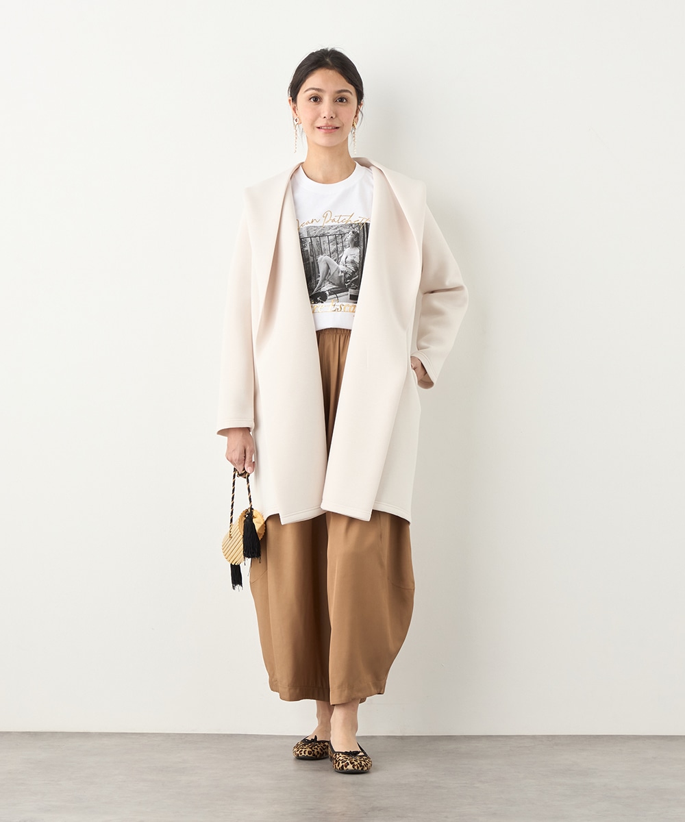 風合いがしなやかなダンボール素材を使用しており、フロントのドレープ感がきれいに現れます。シンプルながらも、羽織るだけでエレガントにまとまるアイテム。長すぎない着丈で取り入れやすく、幅広く活用できます。サイドポケットは切り替えに沿ってすっきりとまとめました。