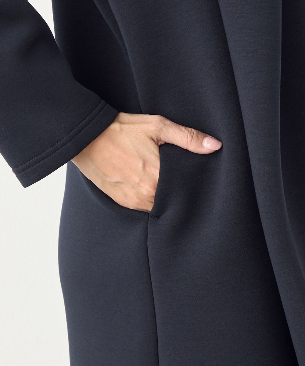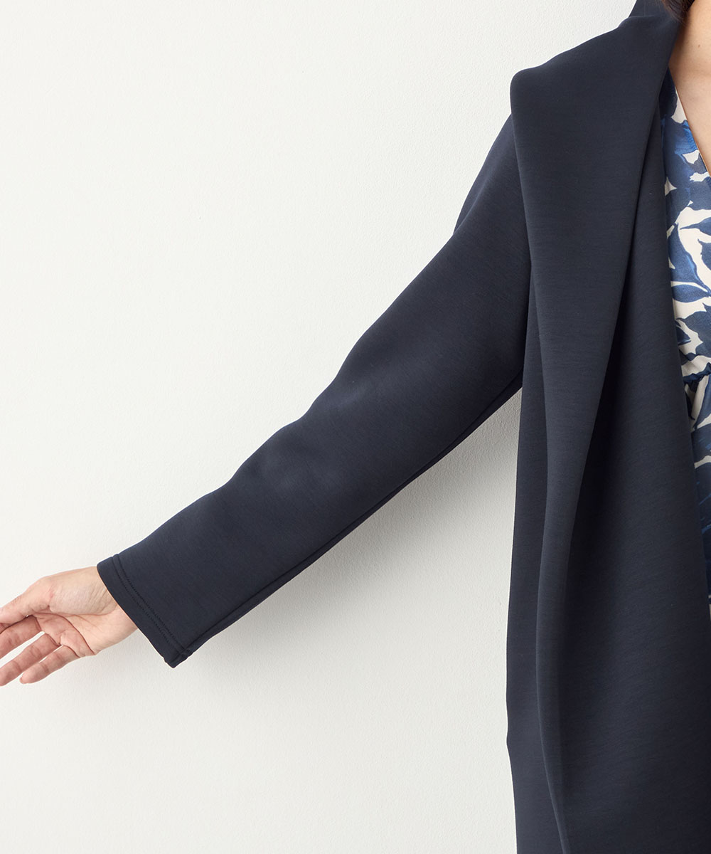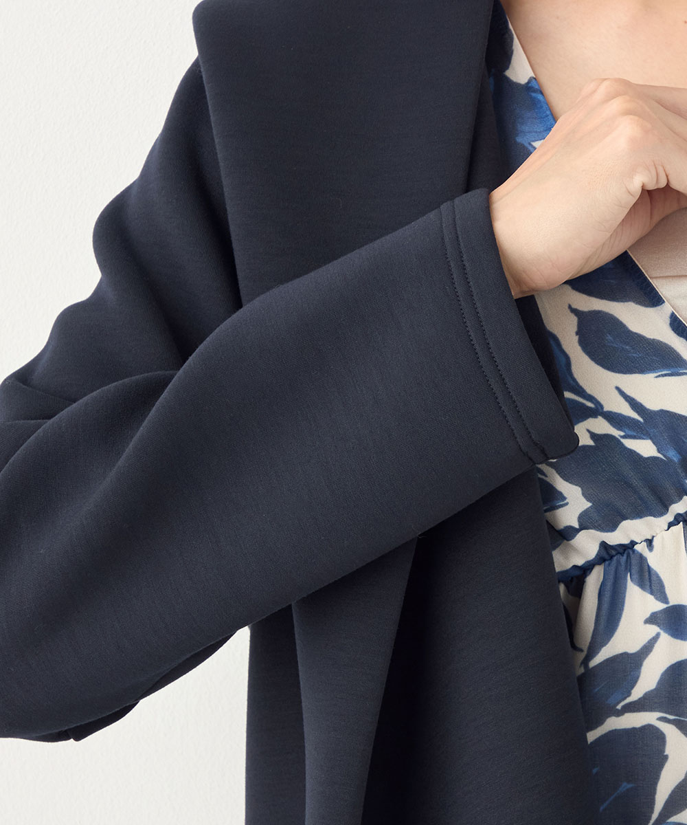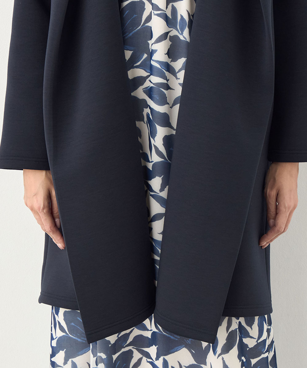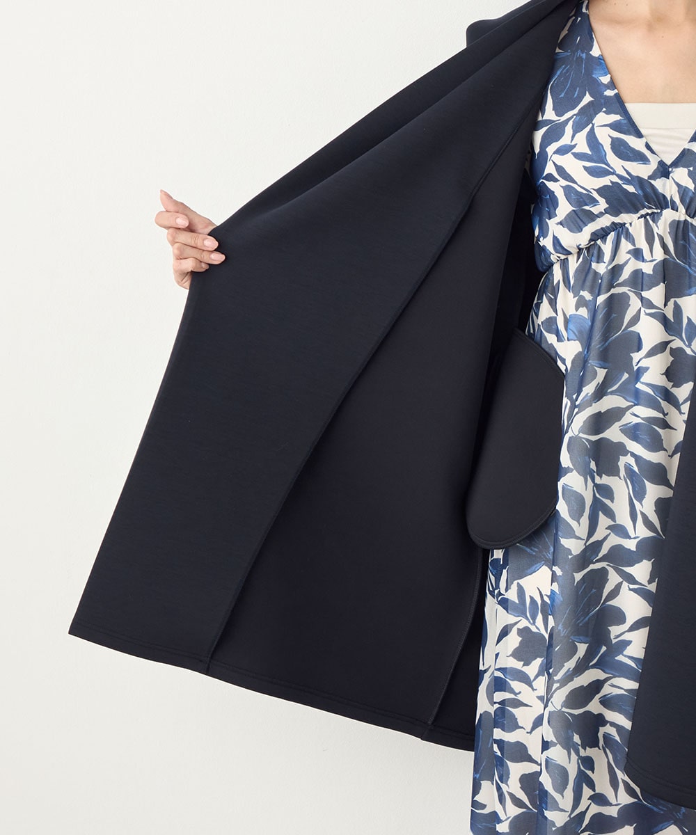 風合いがしなやかなダンボール素材を使用しており、フロントのドレープ感がきれいに現れます。シンプルながらも、羽織るだけでエレガントにまとまるアイテム。長すぎない着丈で取り入れやすく、幅広く活用できます。サイドポケットは切り替えに沿ってすっきりとまとめました。