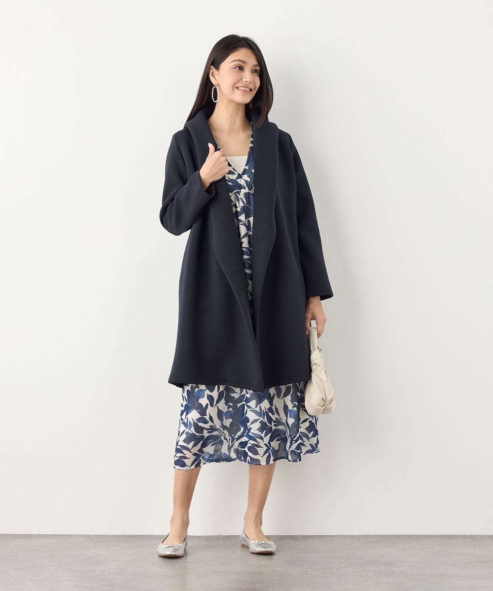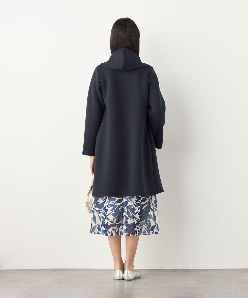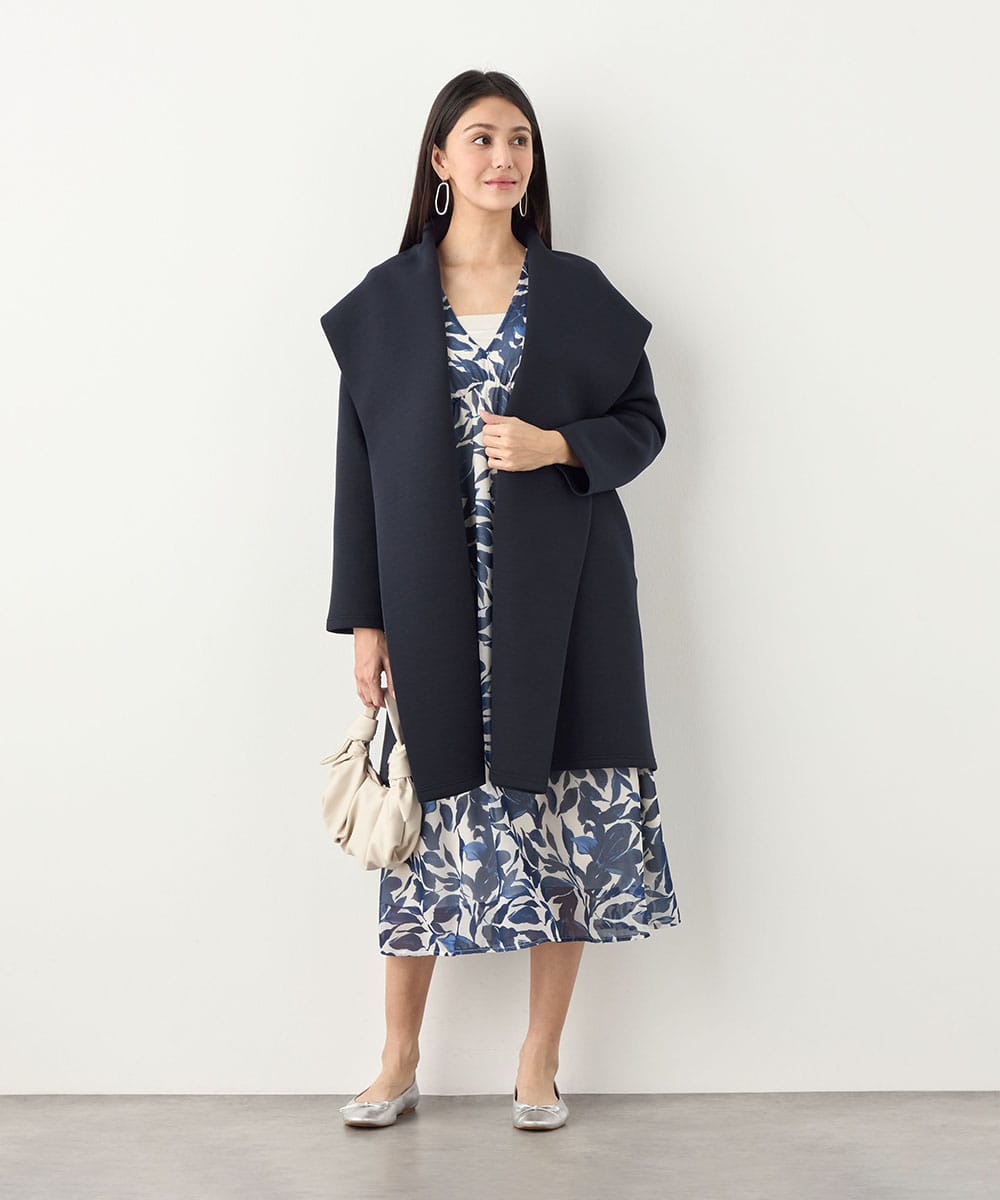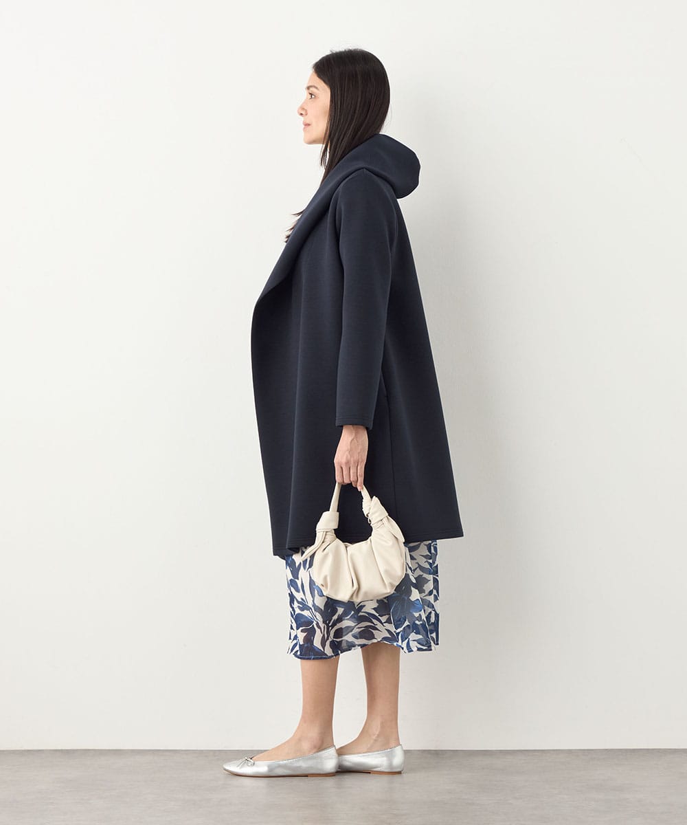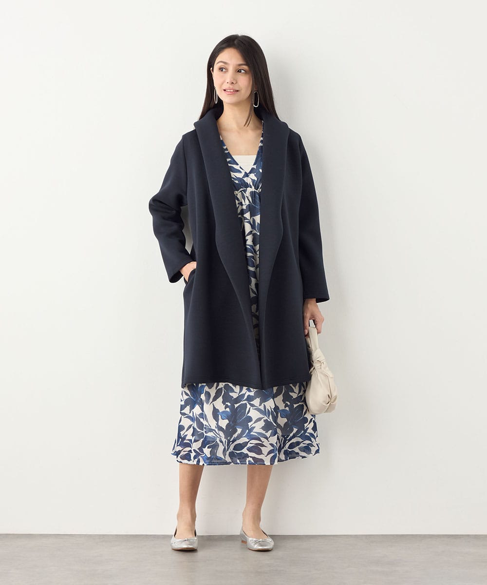 風合いがしなやかなダンボール素材を使用しており、フロントのドレープ感がきれいに現れます。シンプルながらも、羽織るだけでエレガントにまとまるアイテム。長すぎない着丈で取り入れやすく、幅広く活用できます。サイドポケットは切り替えに沿ってすっきりとまとめました。