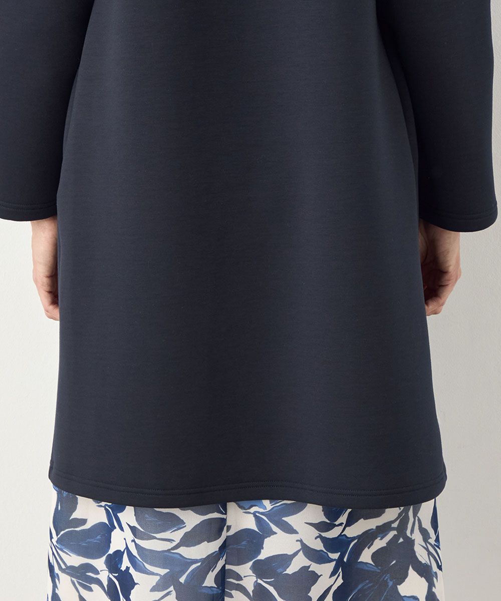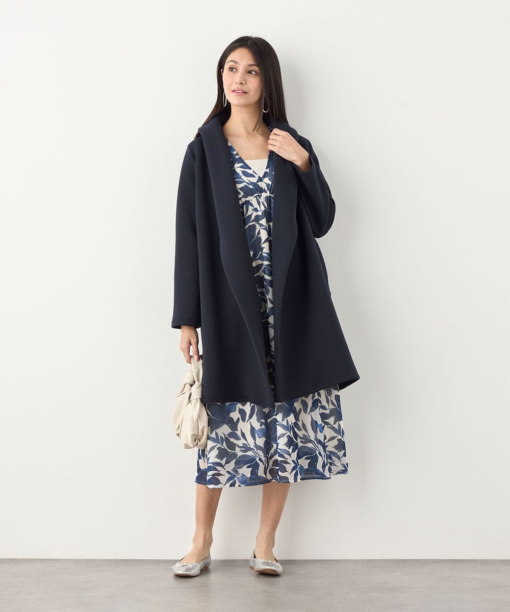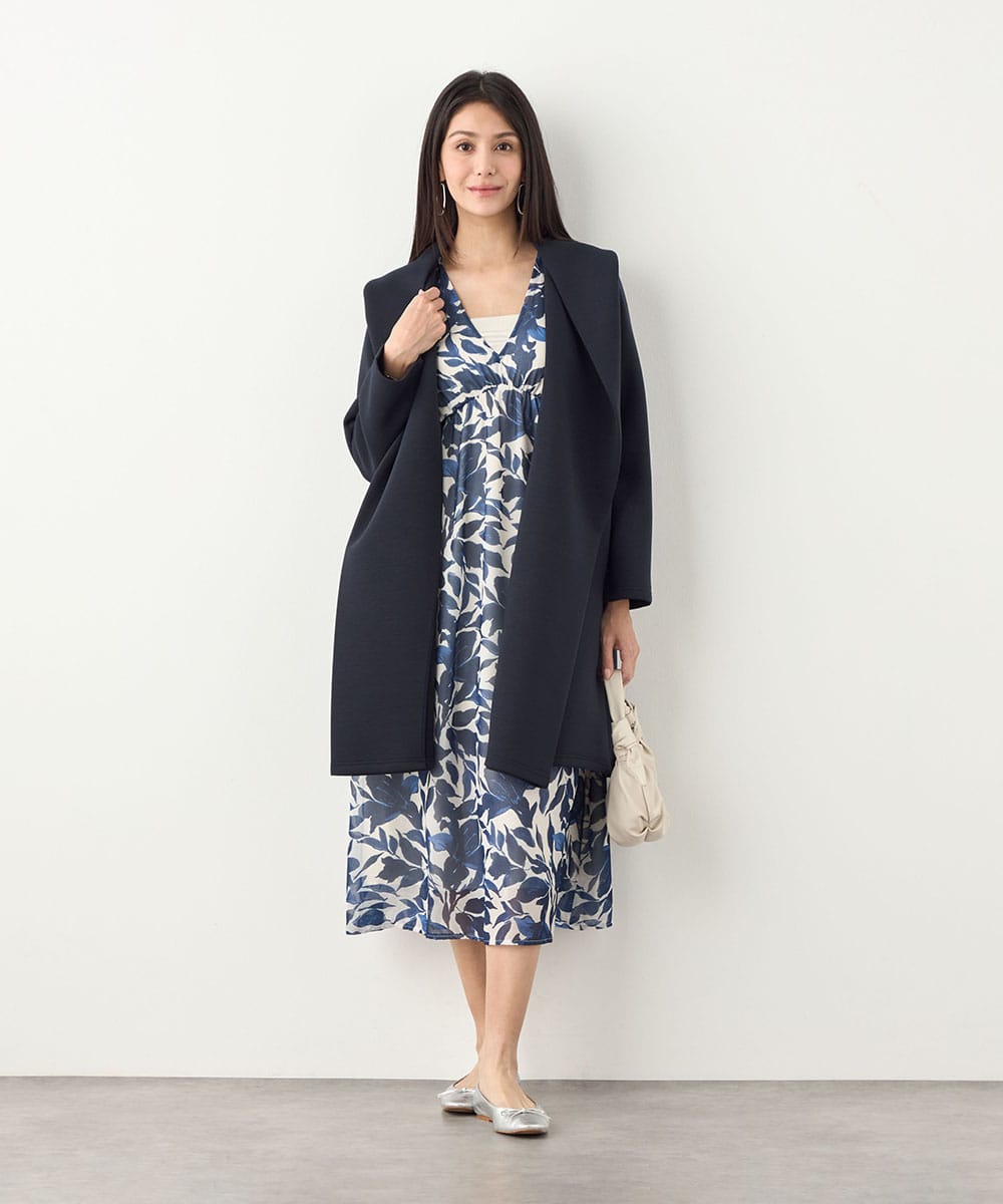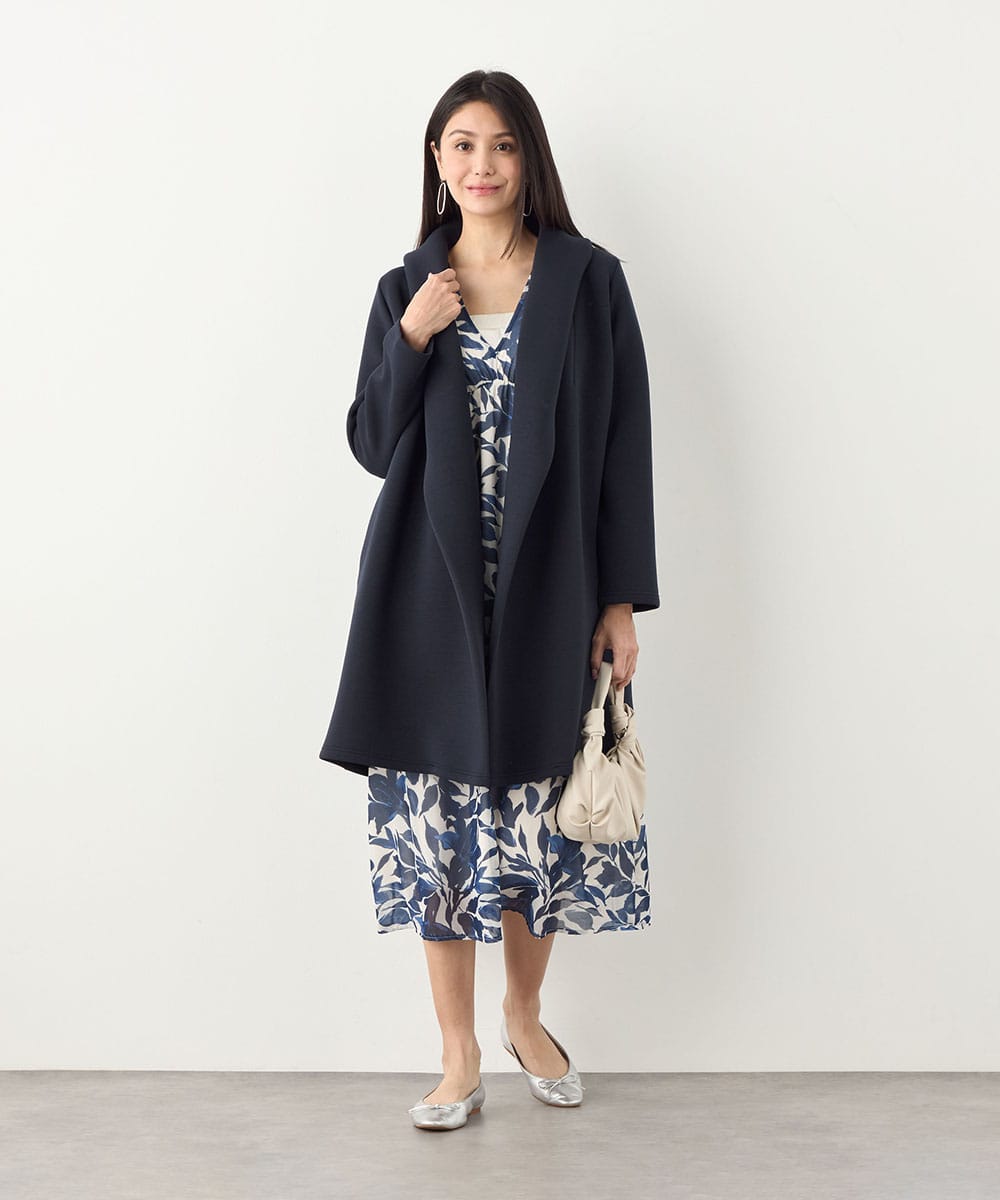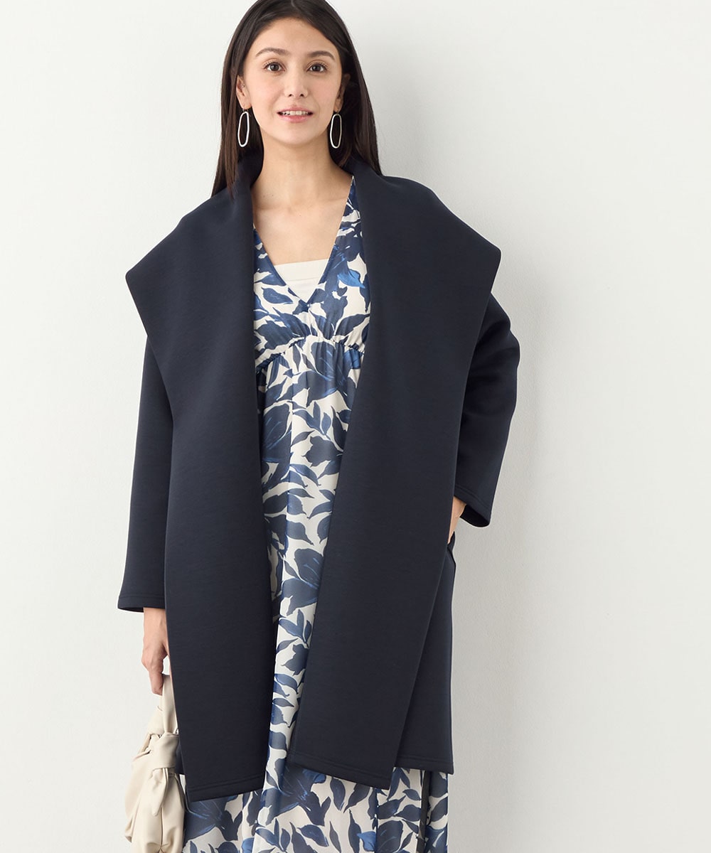 風合いがしなやかなダンボール素材を使用しており、フロントのドレープ感がきれいに現れます。シンプルながらも、羽織るだけでエレガントにまとまるアイテム。長すぎない着丈で取り入れやすく、幅広く活用できます。サイドポケットは切り替えに沿ってすっきりとまとめました。