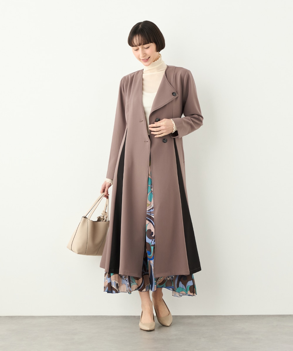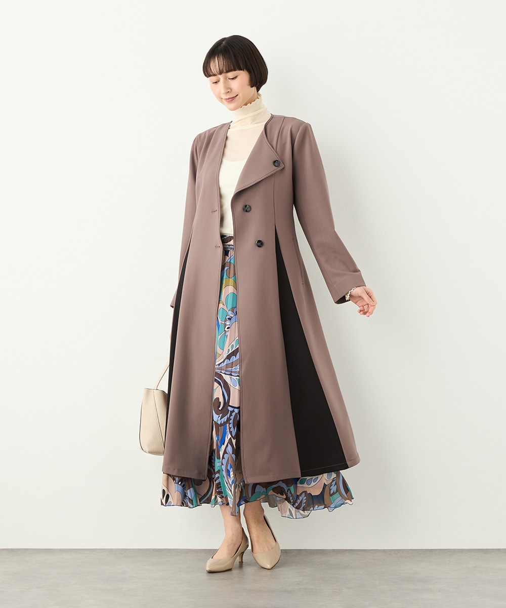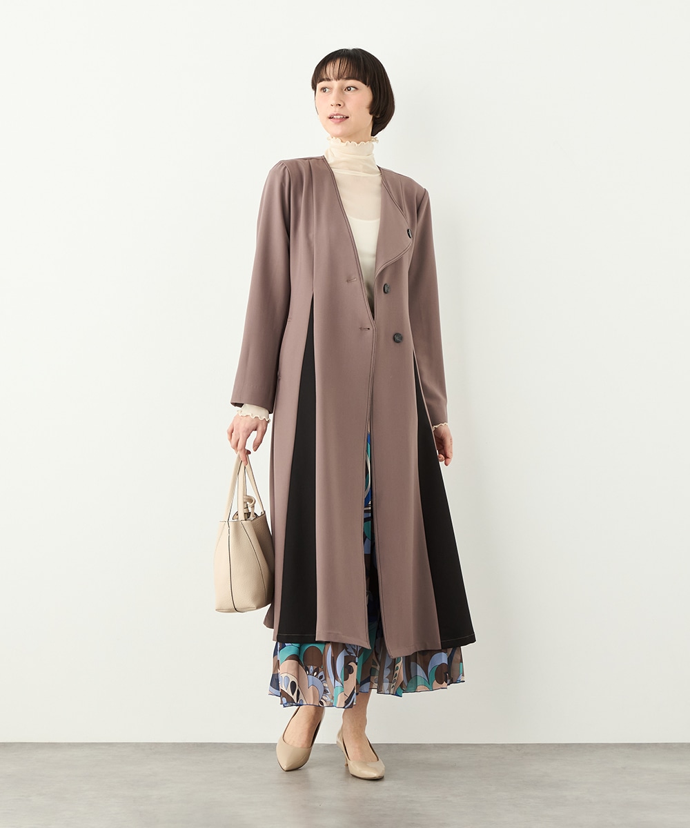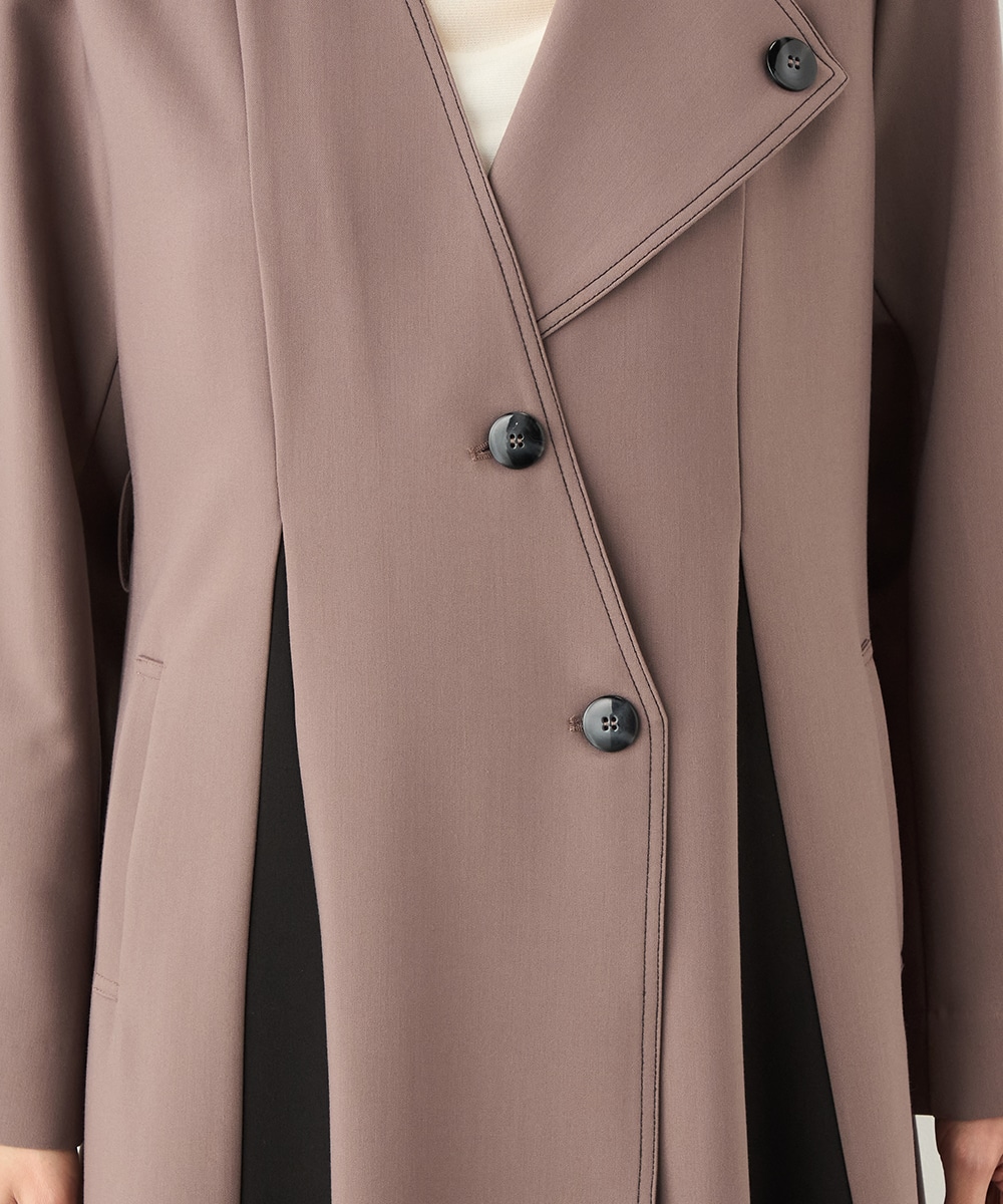 プリーツ風の配色切り替えがポイント。アシンメトリーなデザインもおしゃれなコート。